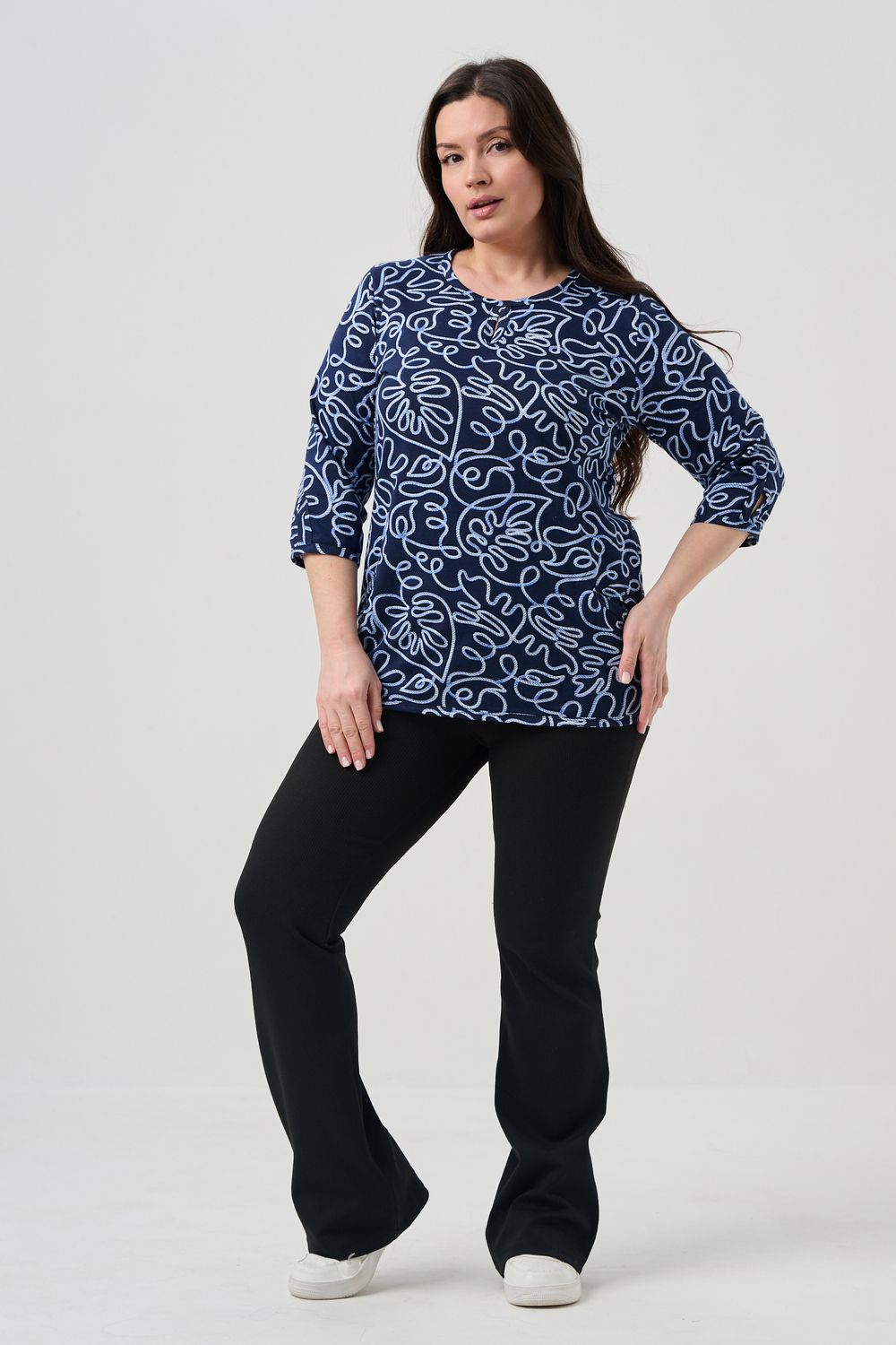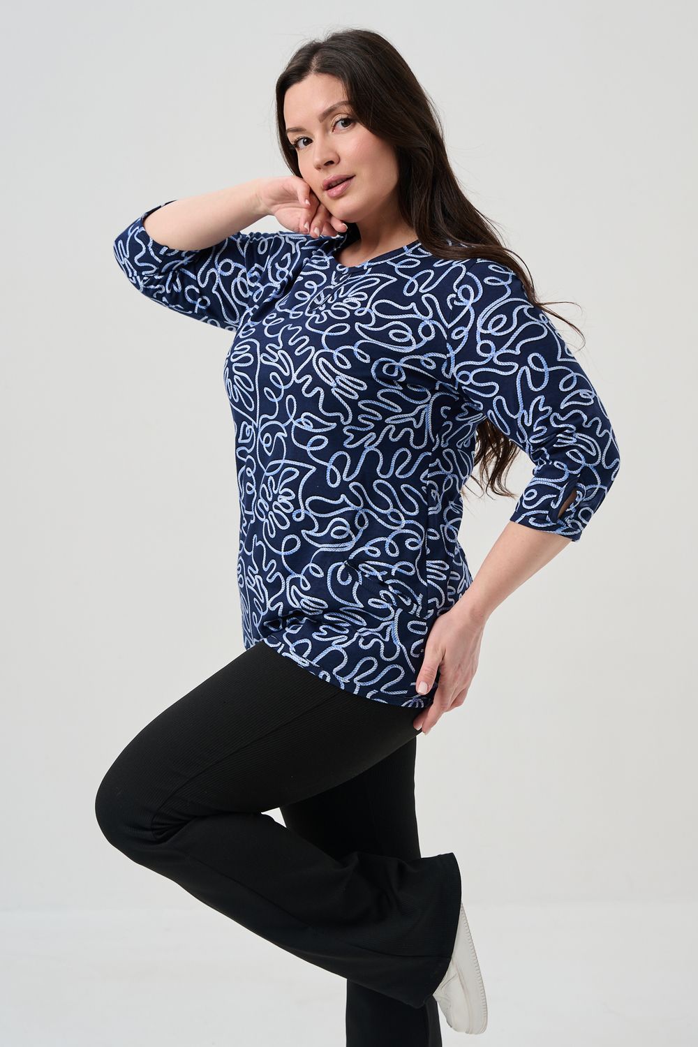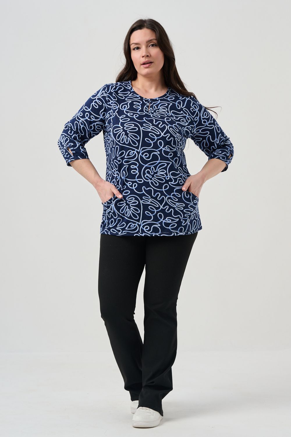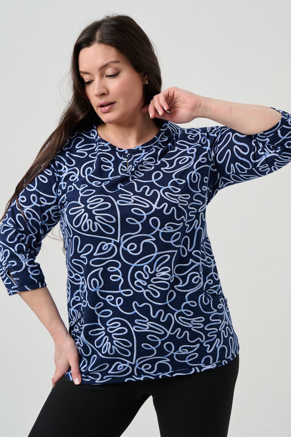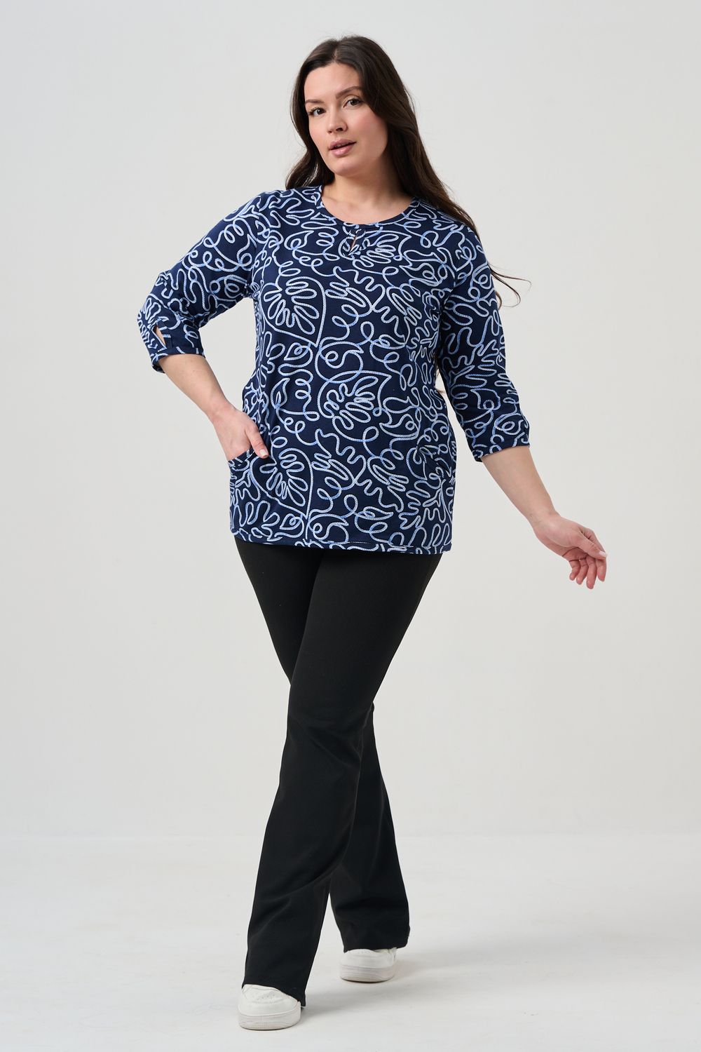 Универсальная базовая модель. Капелька на груди и на рукавах. Удобные внутренние карманы. Отличный вариант для женщин больших размеров. Благодаря своей оптимальной длине, рукаву 3/4, блузка обеспечивает универсальность и комфорт.
