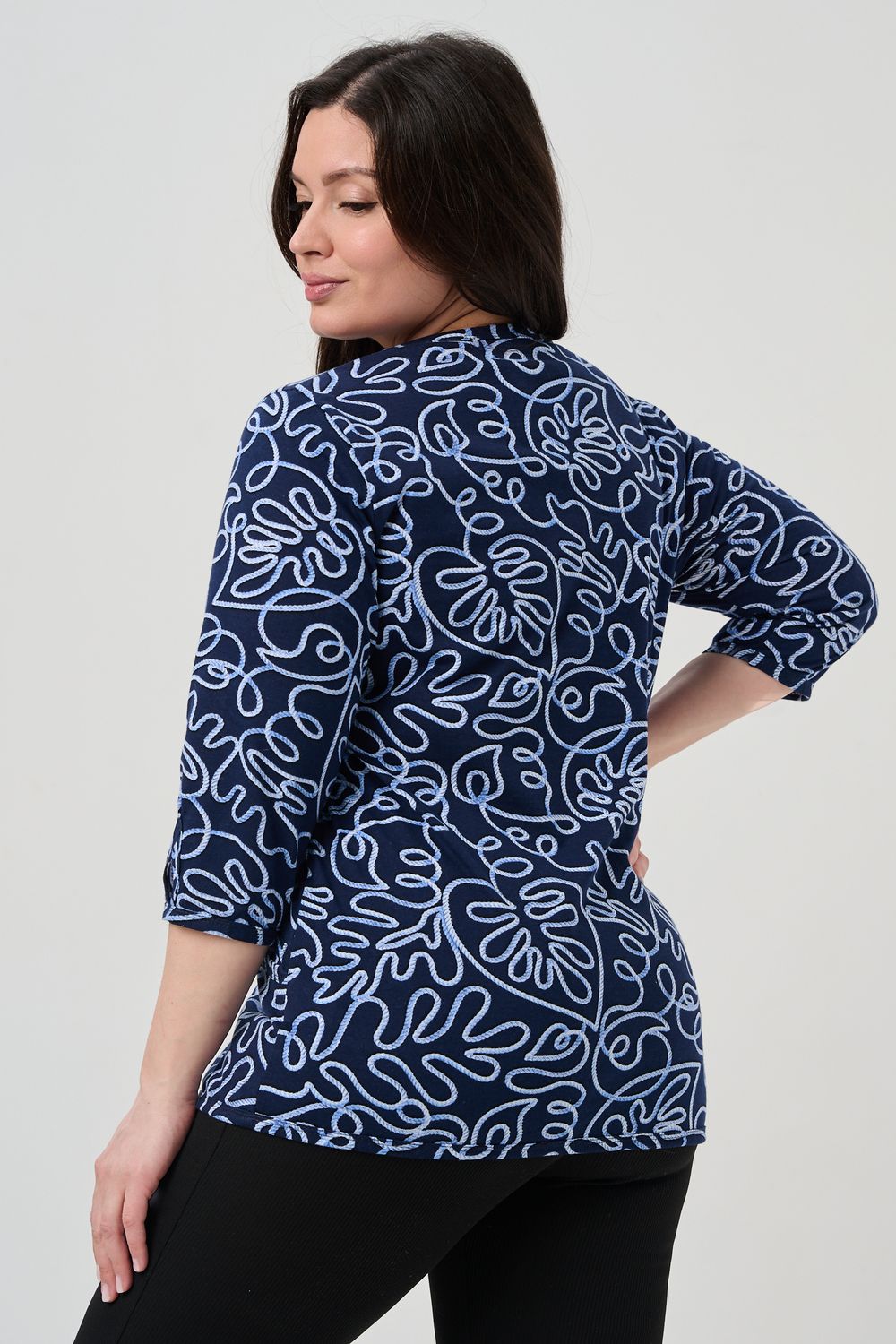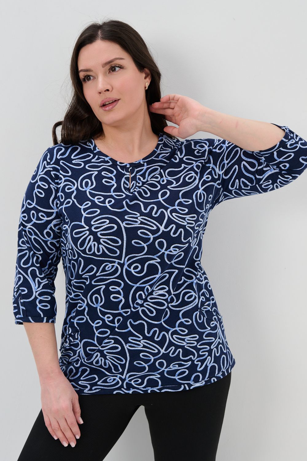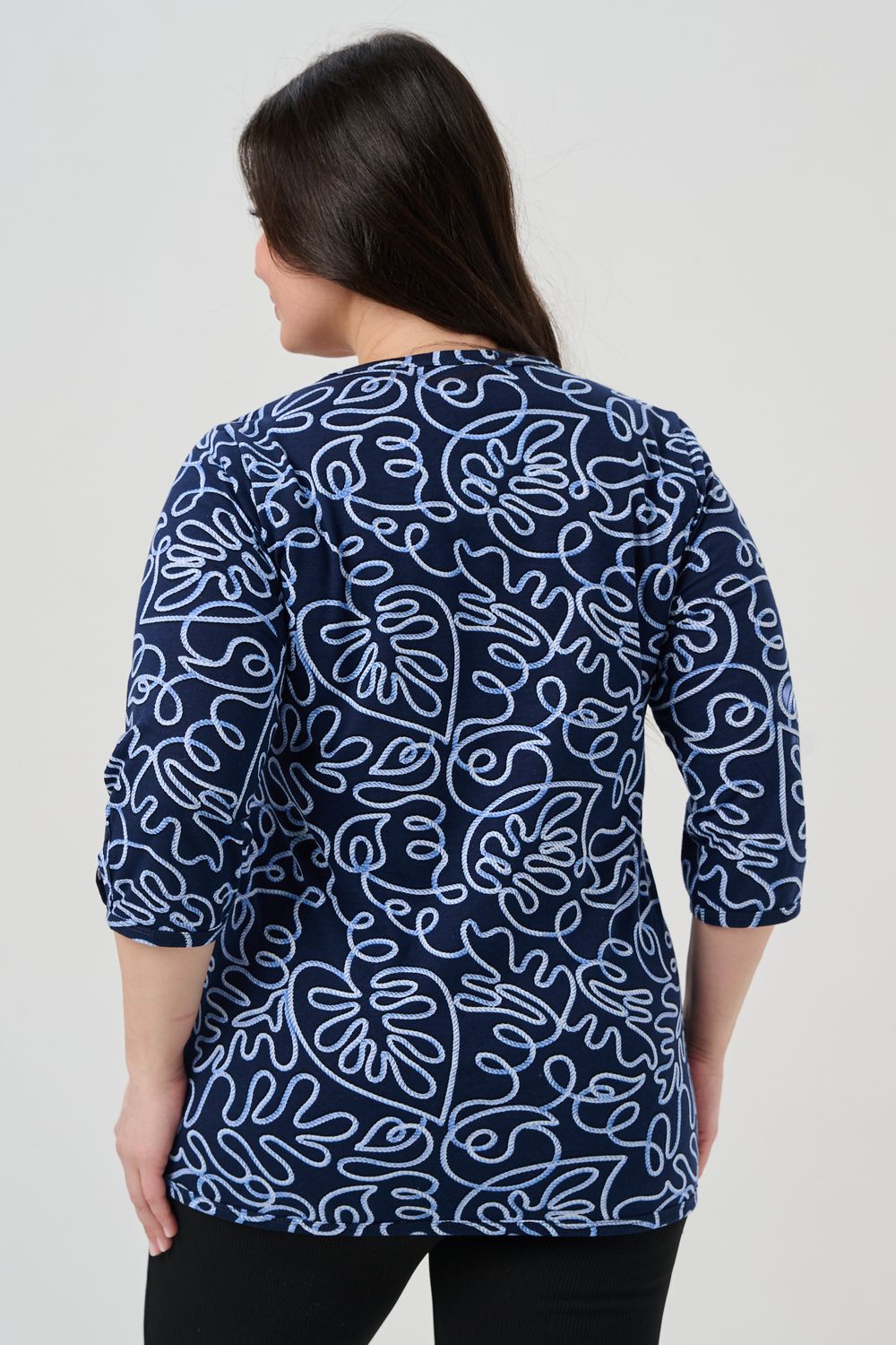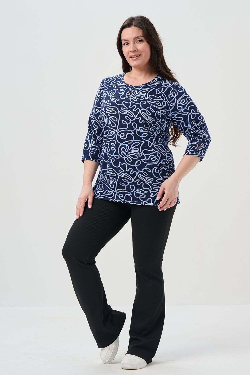 Универсальная базовая модель. Капелька на груди и на рукавах. Удобные внутренние карманы. Отличный вариант для женщин больших размеров. Благодаря своей оптимальной длине, рукаву 3/4, блузка обеспечивает универсальность и комфорт.