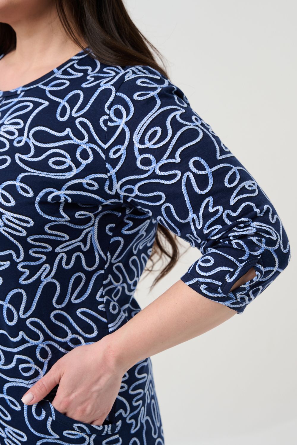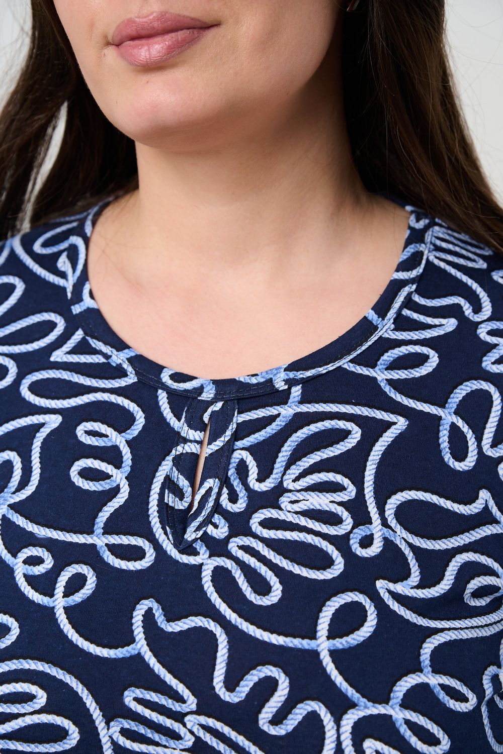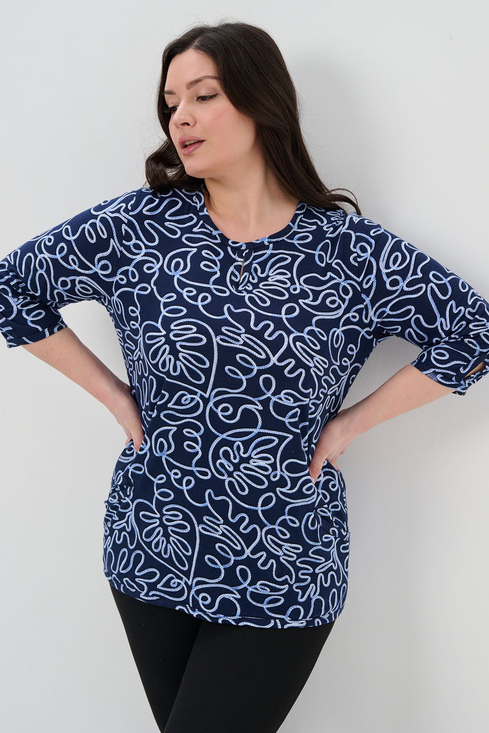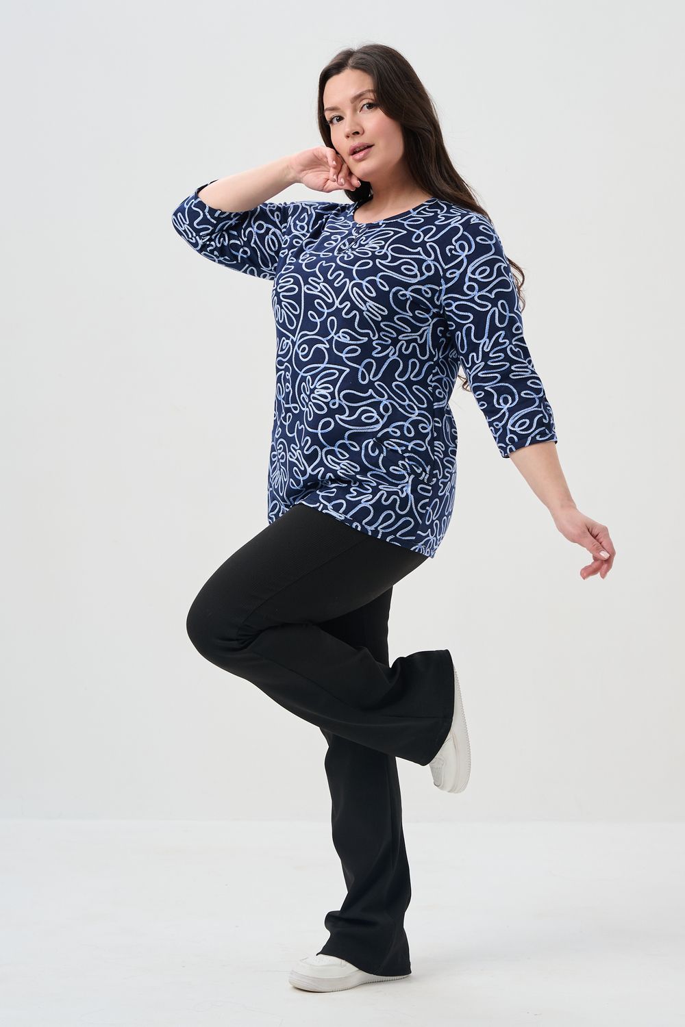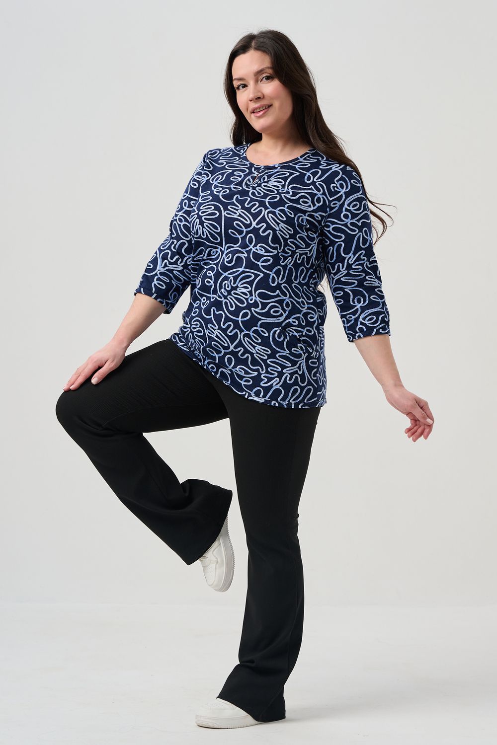 Универсальная базовая модель. Капелька на груди и на рукавах. Удобные внутренние карманы. Отличный вариант для женщин больших размеров. Благодаря своей оптимальной длине, рукаву 3/4, блузка обеспечивает универсальность и комфорт.
