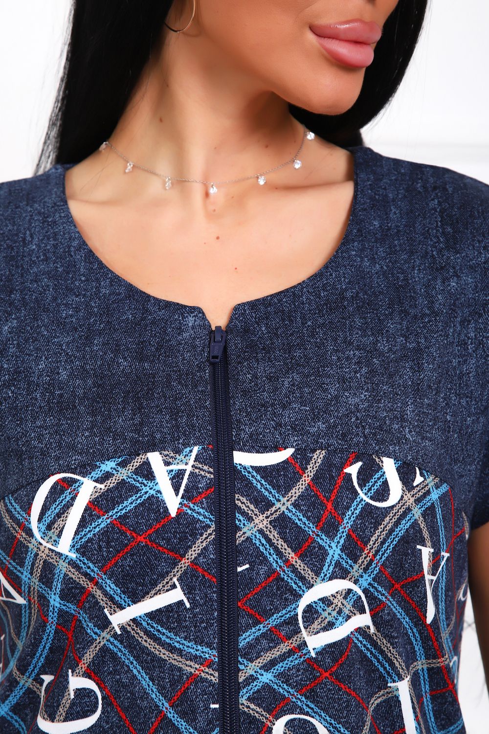 Халат женский из трикотажа. Полуприлегающего силуэта, чуть расклешенный к низу. На полочках и спинке кокетки. Застежка тесьма молния. В боковых швах выполнены карманы. Низ изделия прямой.