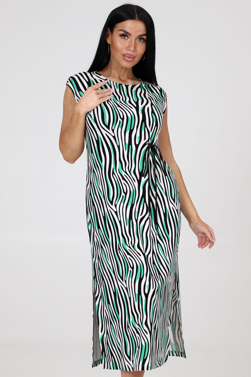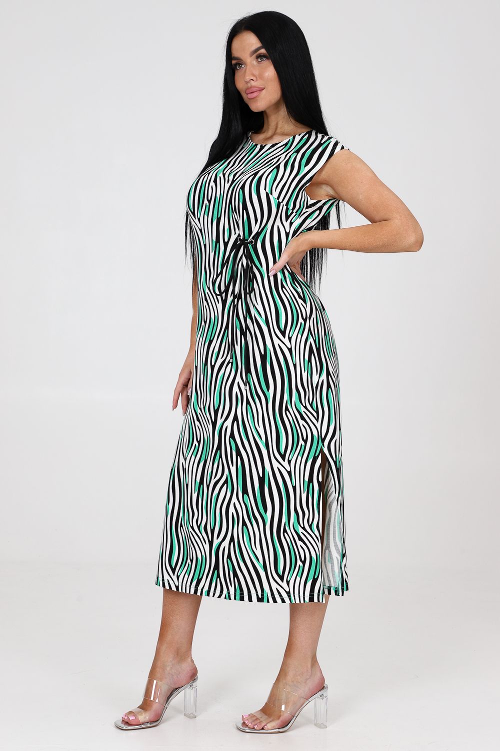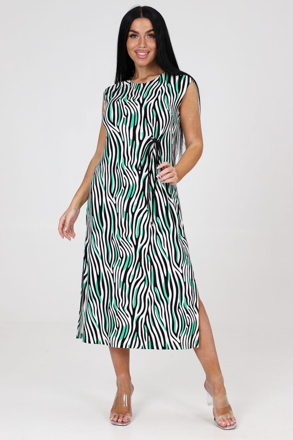Платье женское из вискозы свободного покроя. Платье со спущенной проймой, с двумя боковыми разрезами, с вытачками.