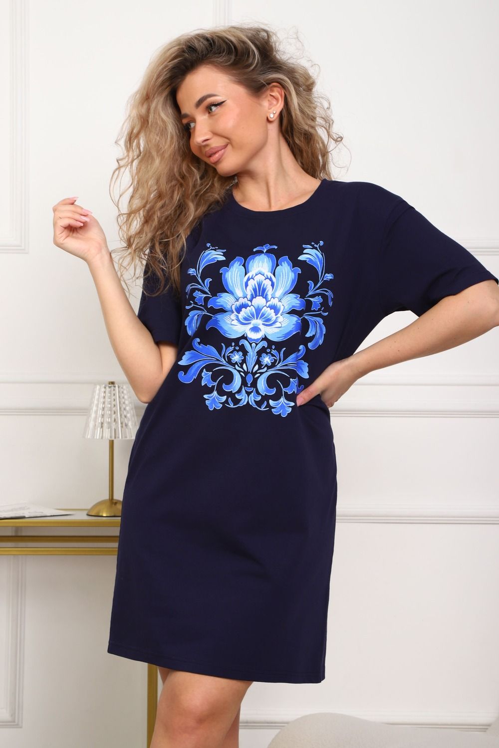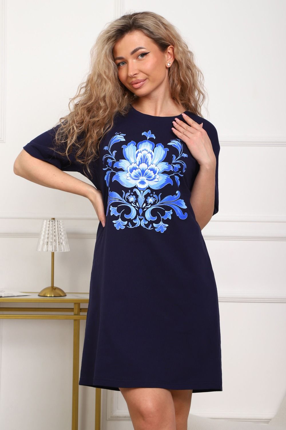 Туника женская прямого силуэта. Низ изделия прямой. Длинна выше колена, плечо спущенное, рукав короткий. Горловина круглой формы, обработана планкой с отделочной строчкой по шву притачивания. Принт (шелкография) располагается по центру переда.