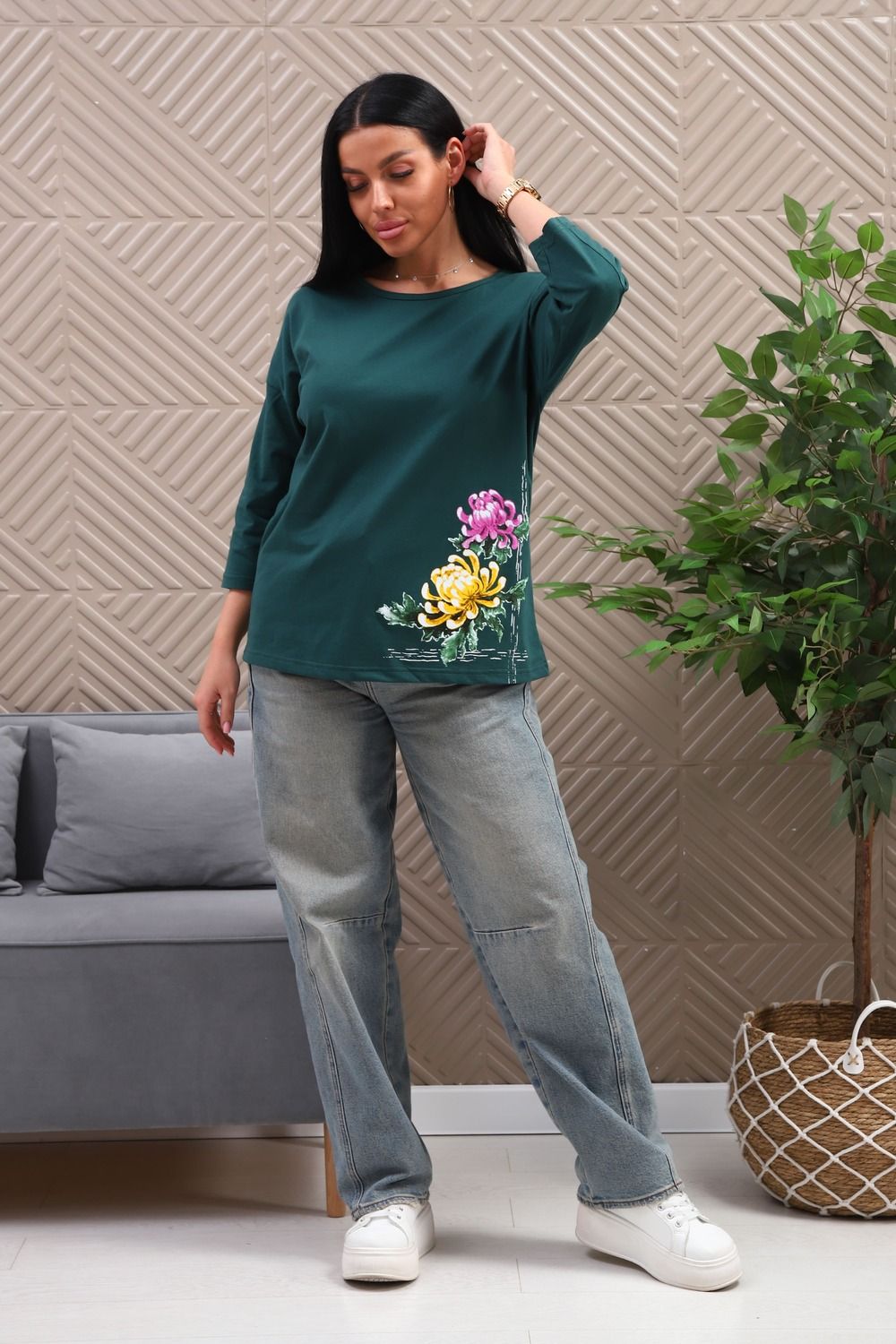 Туника женская. Ткань кулирка, хлопок 100%. Крой свободный, горловина круглой формы, обработана окантовкой. Линия плеч спущена. Длинна рукава 3/4, со швом по локтю. Низ изделия прямой. На полочке принт, шелкография.