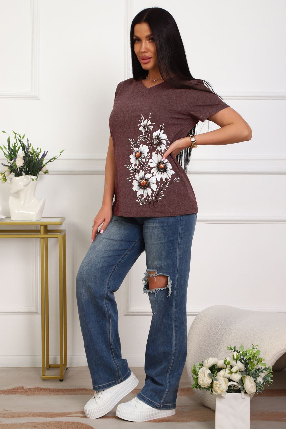Футболка женская полуприлегающего силуэта из меланжированного трикотажа. Низ изделия прямой. Длинна до середины бедра, плечо на естественном месте, рукав короткий. Горловина V-образной формы, обработана планкой . Принт (шелкография ) на полочке с левой стороны .