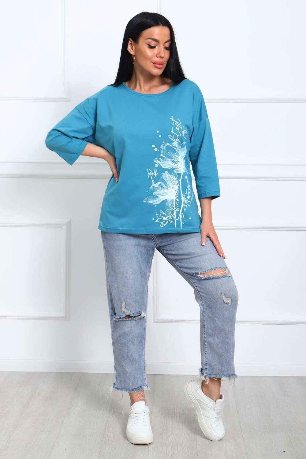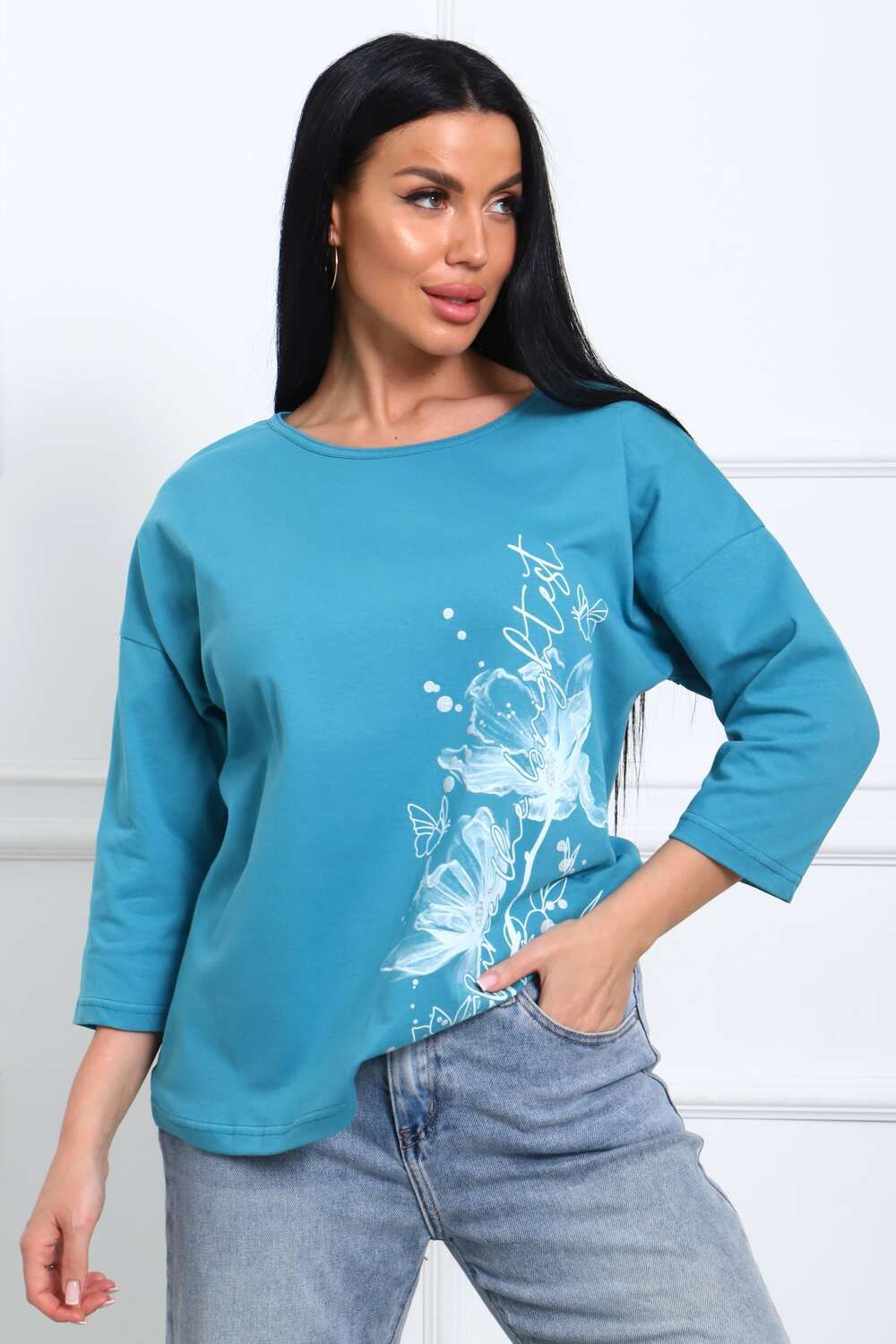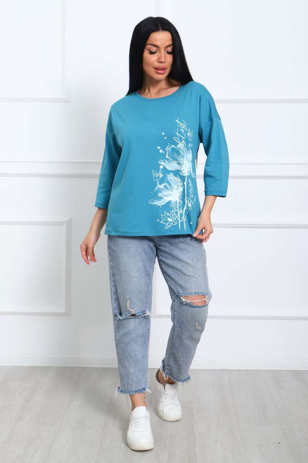 Туника женская. Ткань кулирка, хлопок 100%. Крой свободный, горловина круглой формы, обработана окантовкой. Линия плеч спущена. Длинна рукава 3/4, со швом по локтю. Низ изделия прямой. На полочке принт, шелкография.