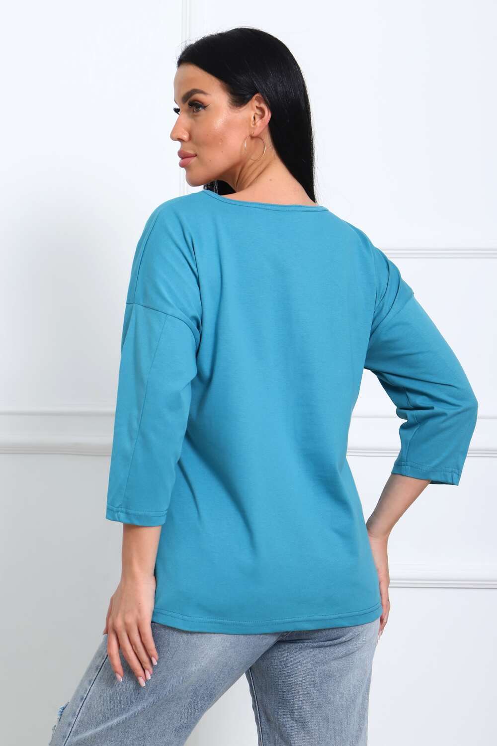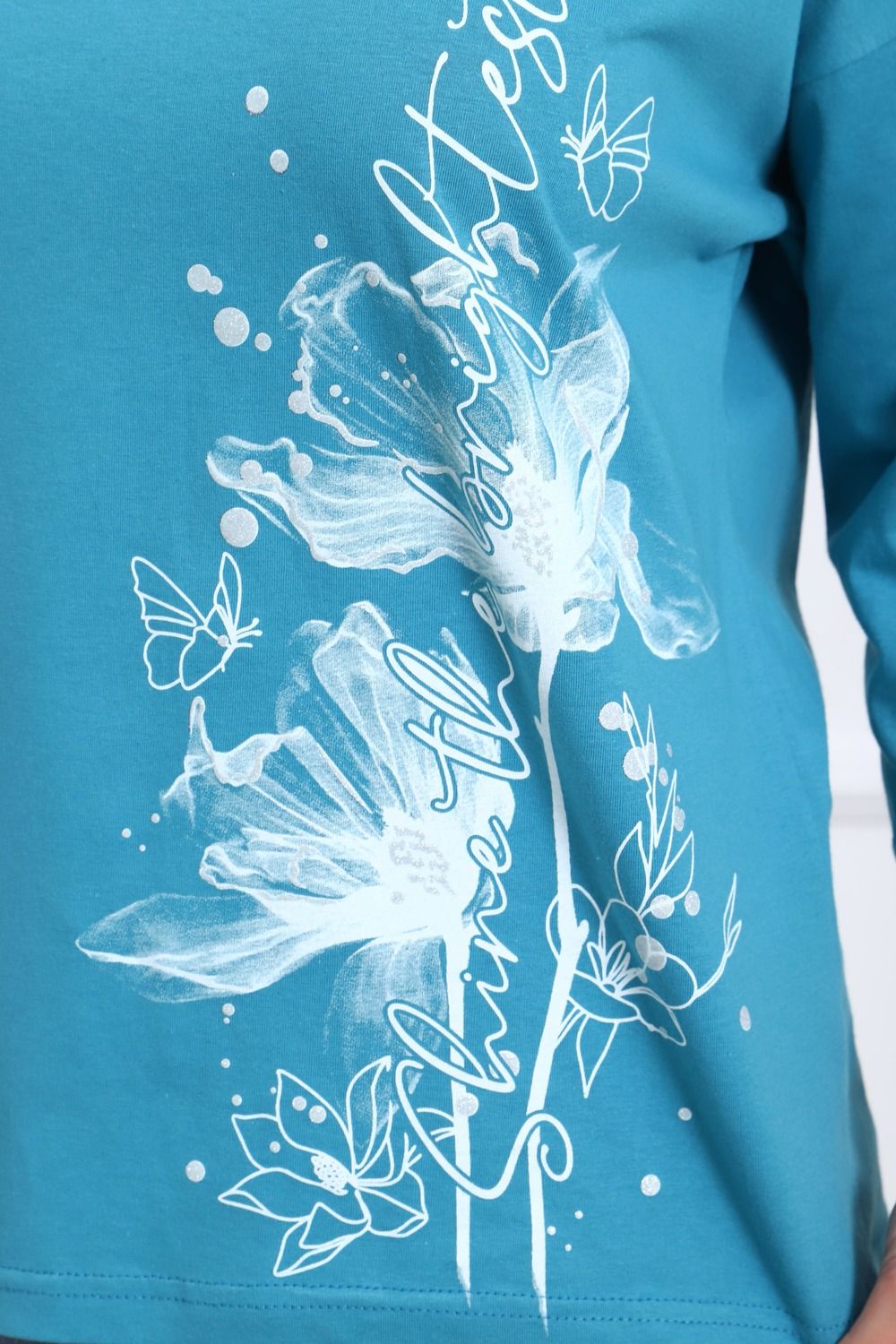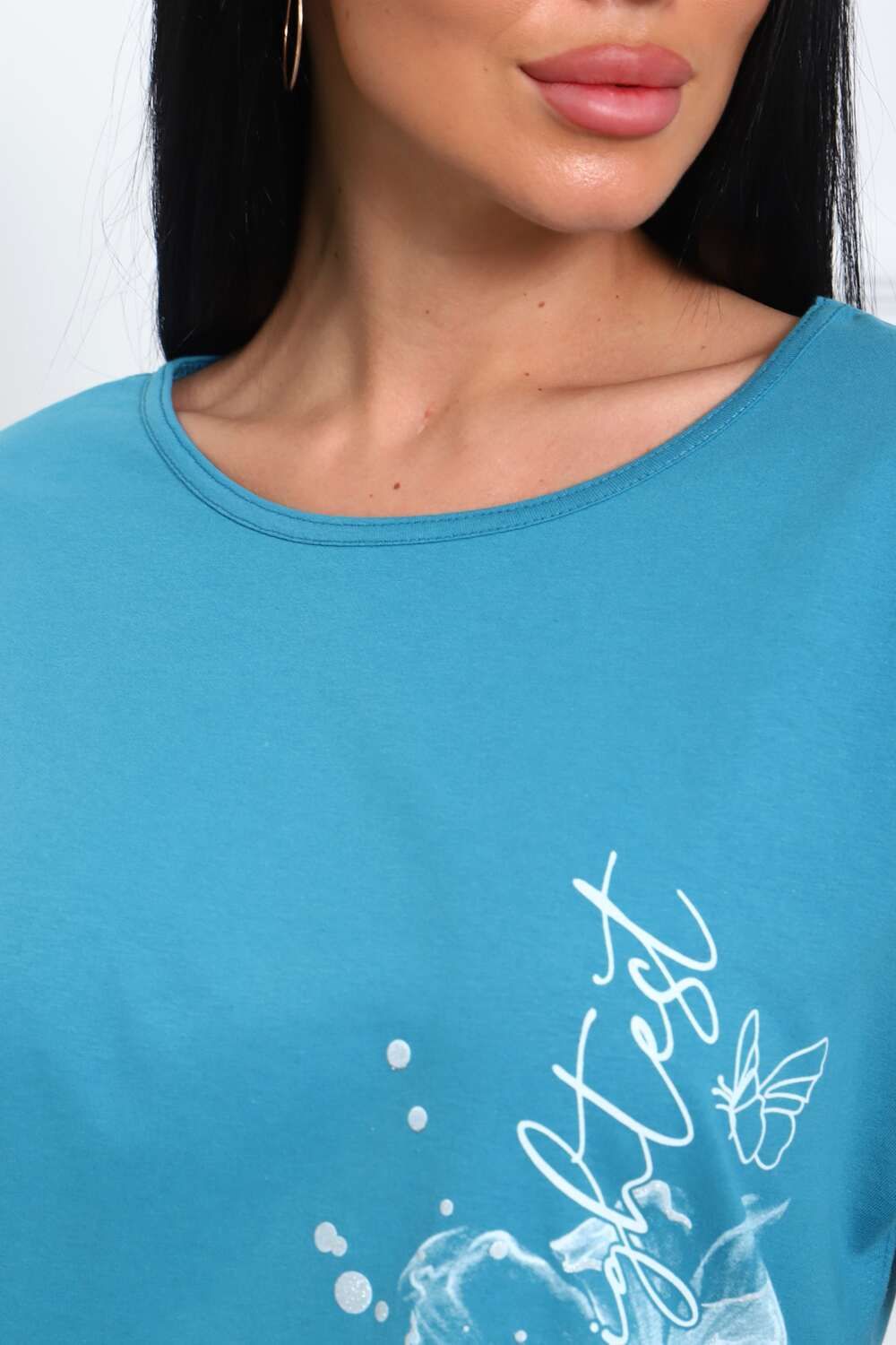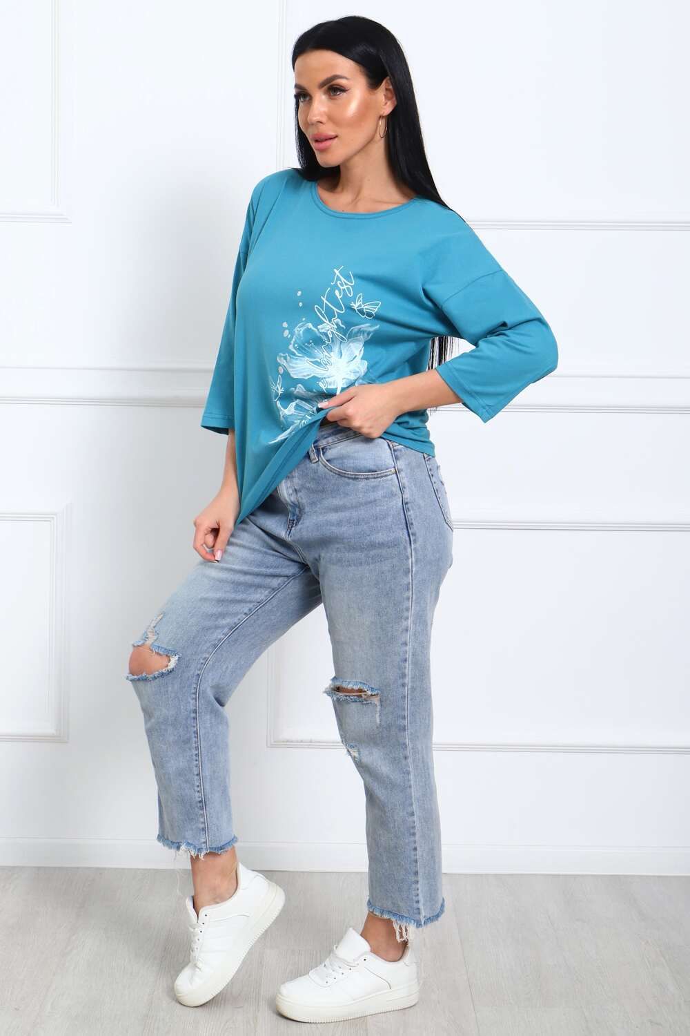 Туника женская. Ткань кулирка, хлопок 100%. Крой свободный, горловина круглой формы, обработана окантовкой. Линия плеч спущена. Длинна рукава 3/4, со швом по локтю. Низ изделия прямой. На полочке принт, шелкография.