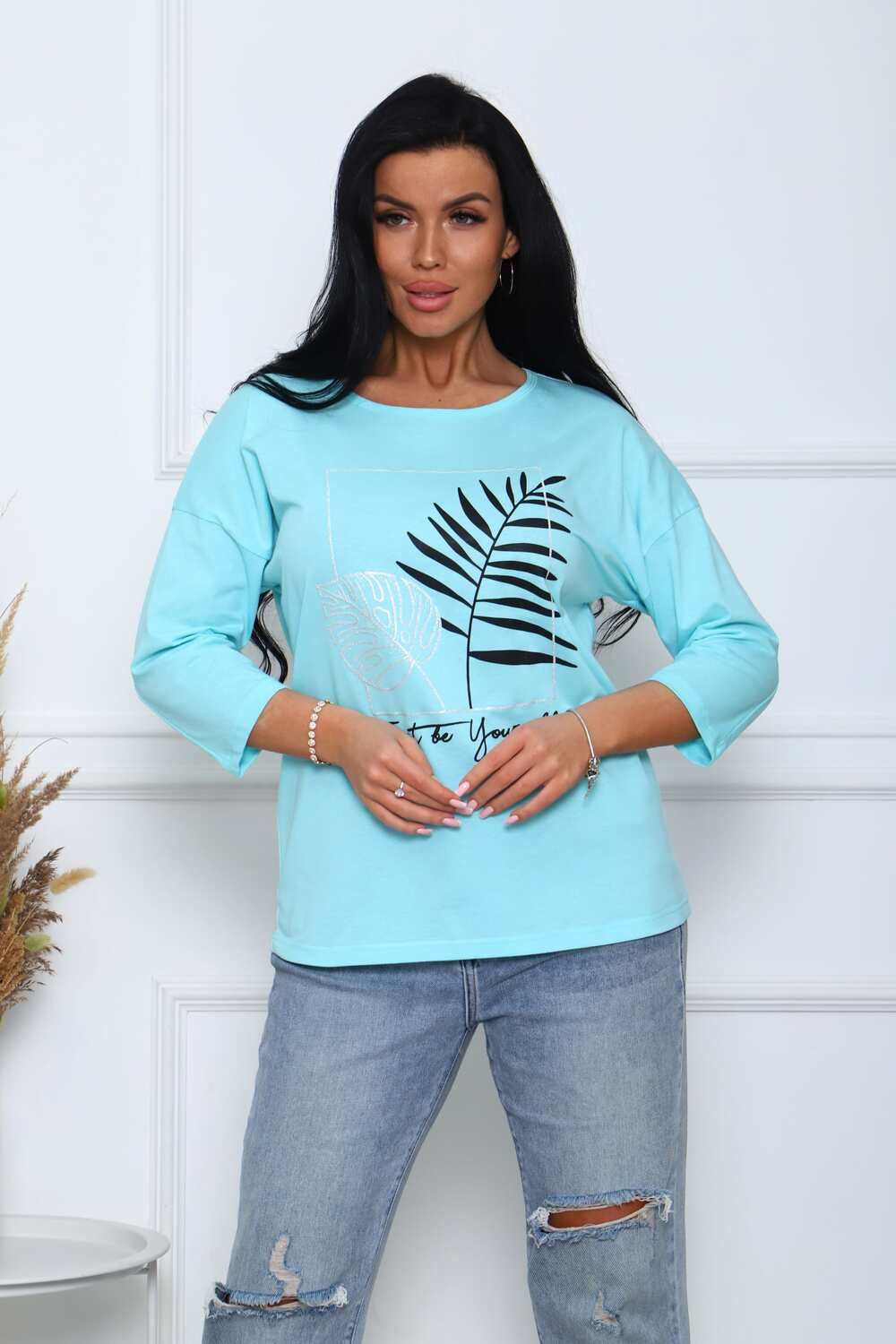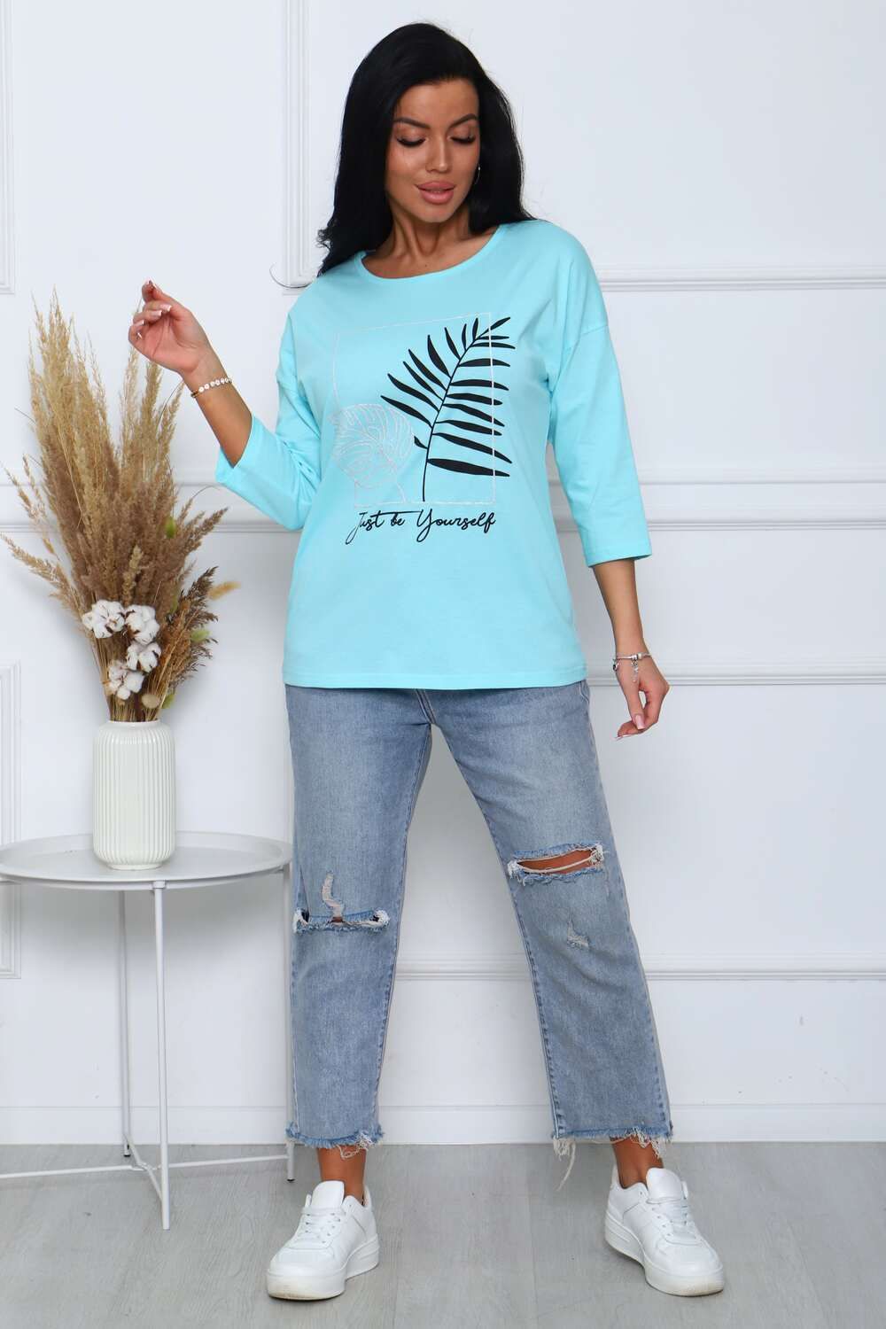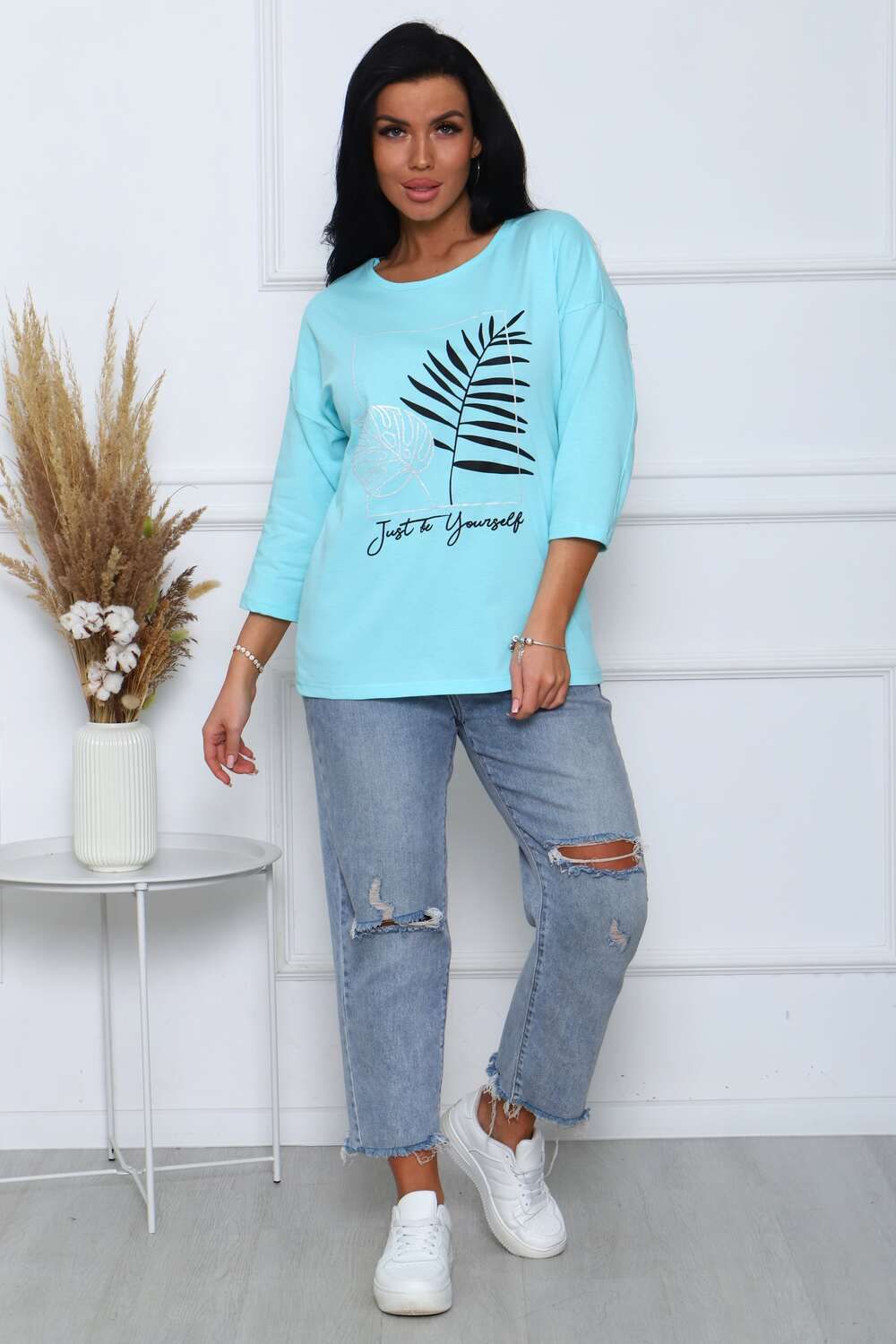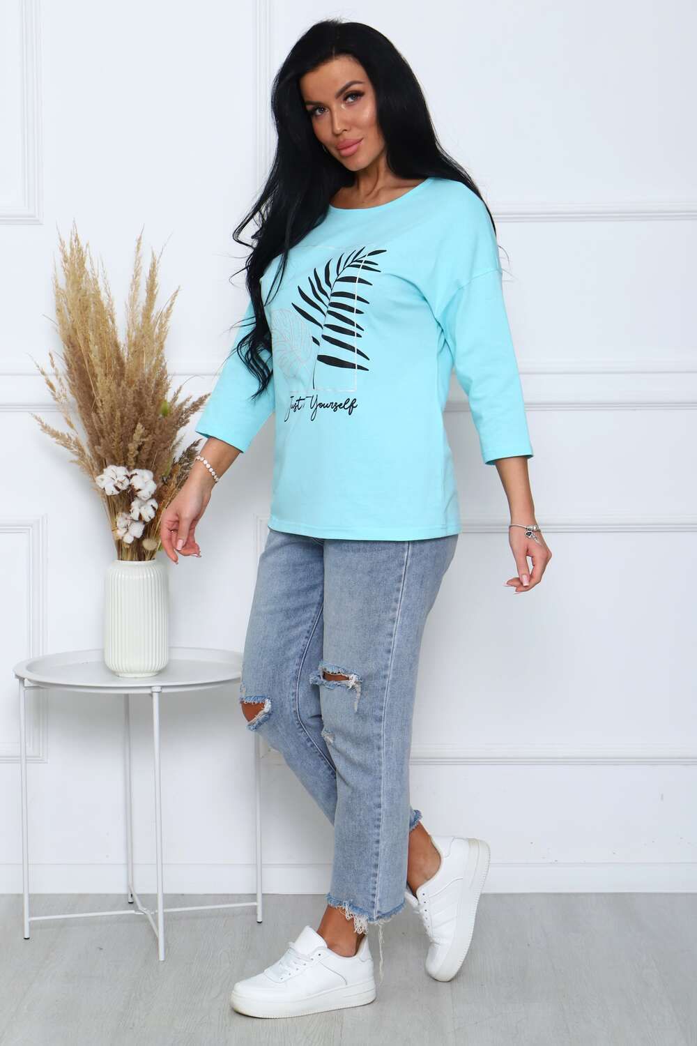 Туника женская. Ткань кулирка, хлопок 100%. Крой свободный, горловина круглой формы, обработана окантовкой. Линия плеч спущена. Длинна рукава 3/4, со швом по локтю. Низ изделия прямой. На полочке принт, шелкография.