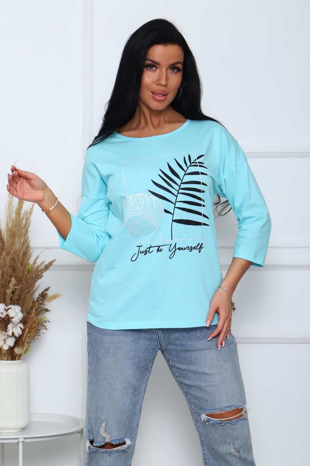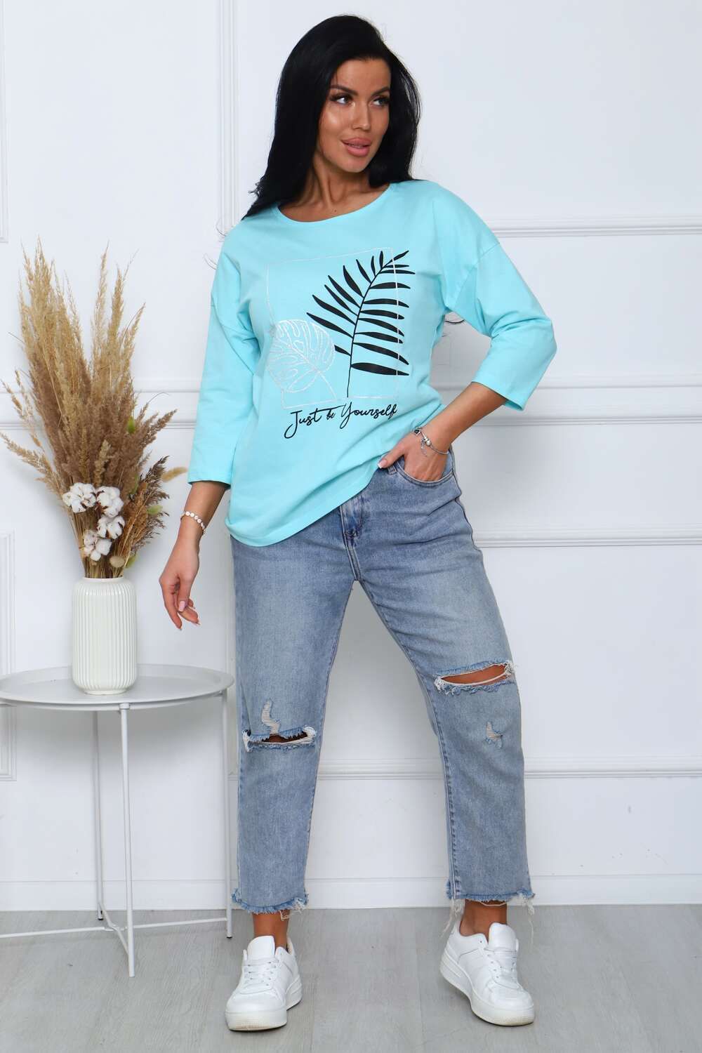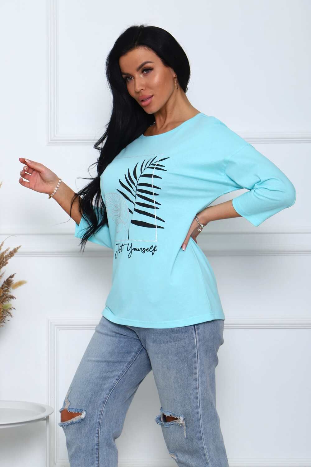 Туника женская. Ткань кулирка, хлопок 100%. Крой свободный, горловина круглой формы, обработана окантовкой. Линия плеч спущена. Длинна рукава 3/4, со швом по локтю. Низ изделия прямой. На полочке принт, шелкография.
