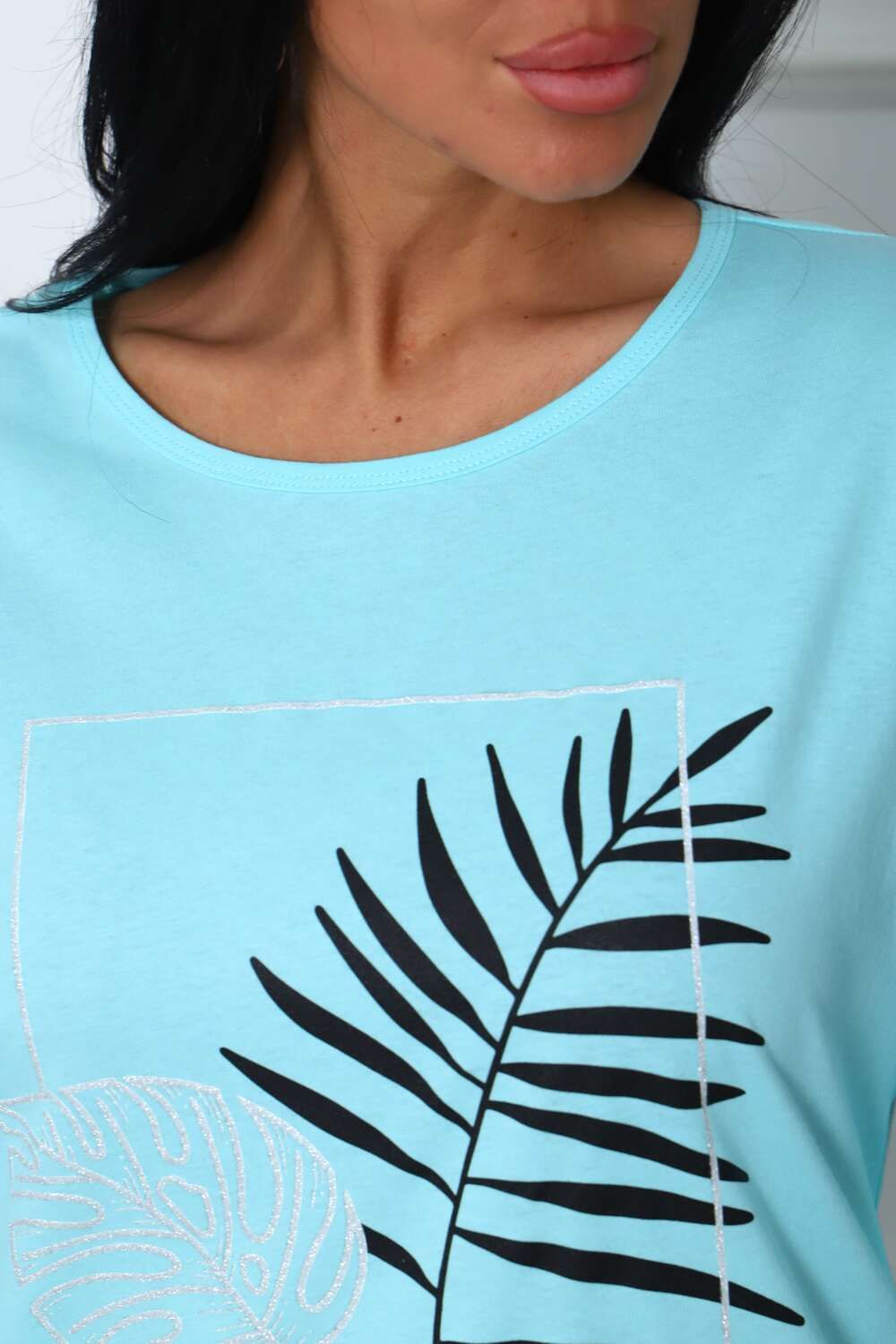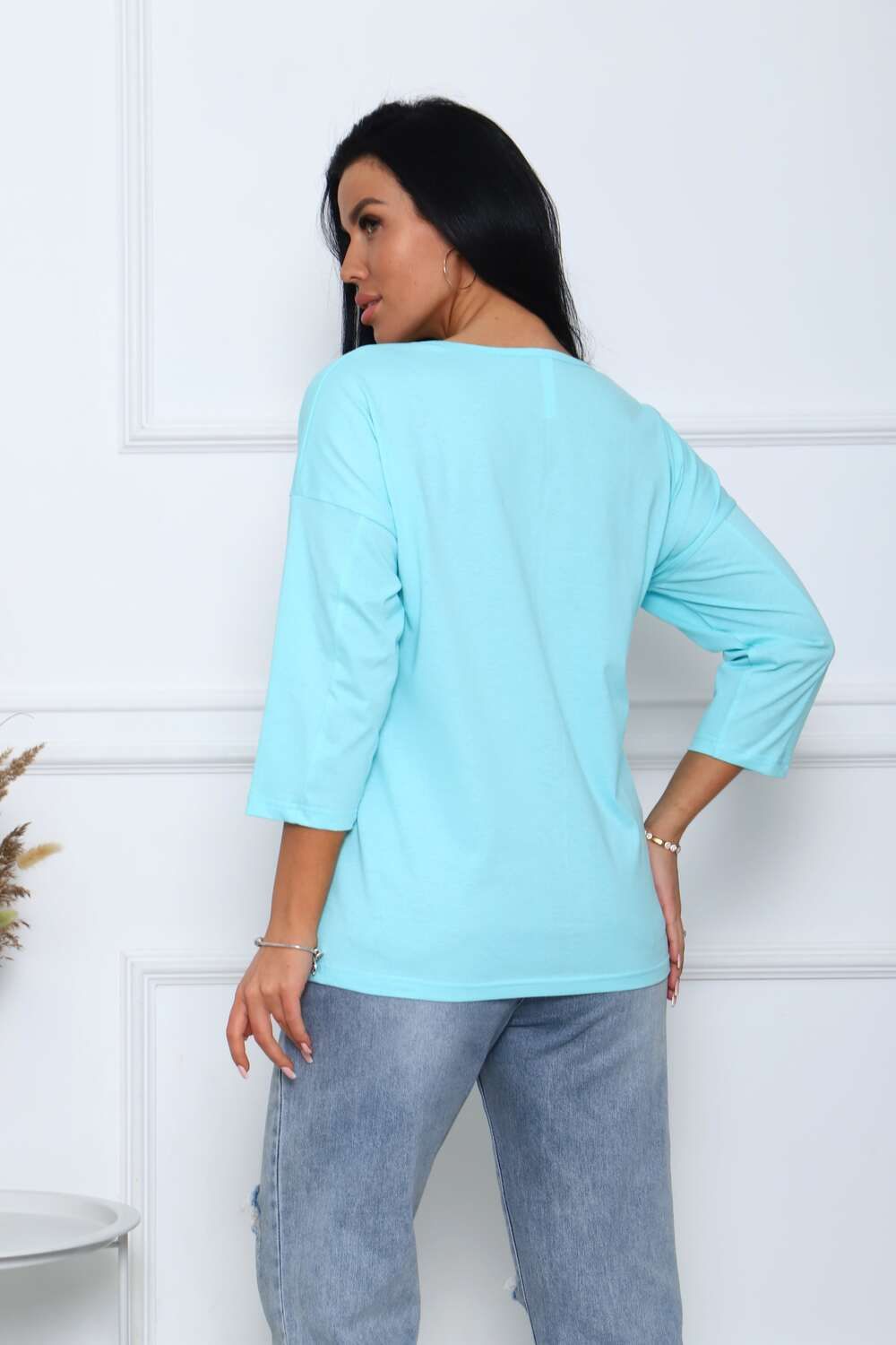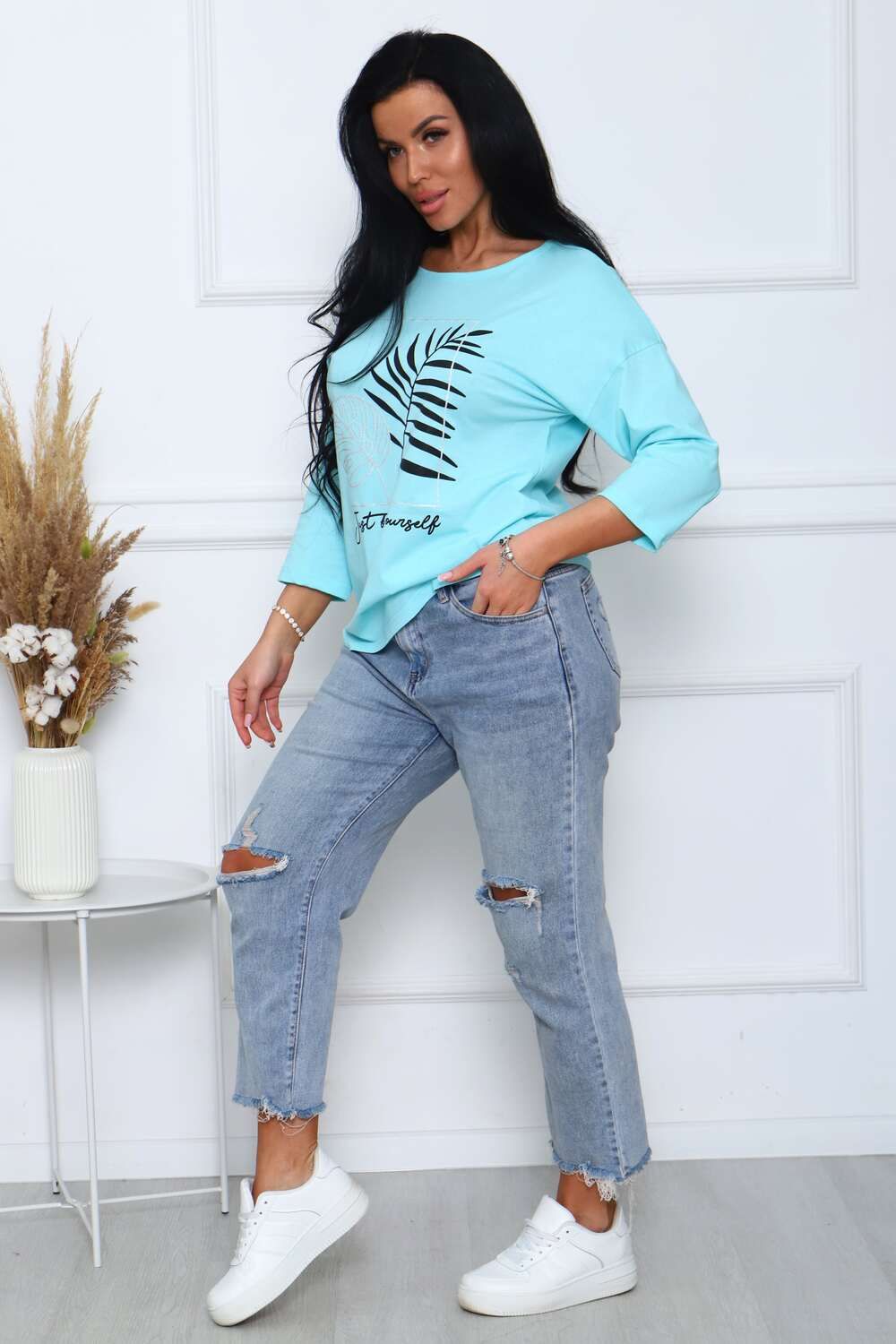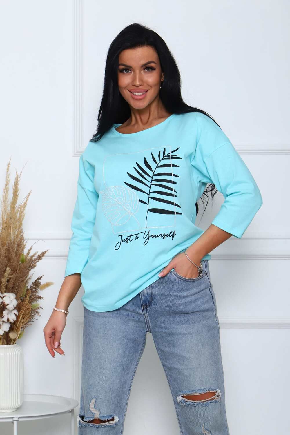 Туника женская. Ткань кулирка, хлопок 100%. Крой свободный, горловина круглой формы, обработана окантовкой. Линия плеч спущена. Длинна рукава 3/4, со швом по локтю. Низ изделия прямой. На полочке принт, шелкография.