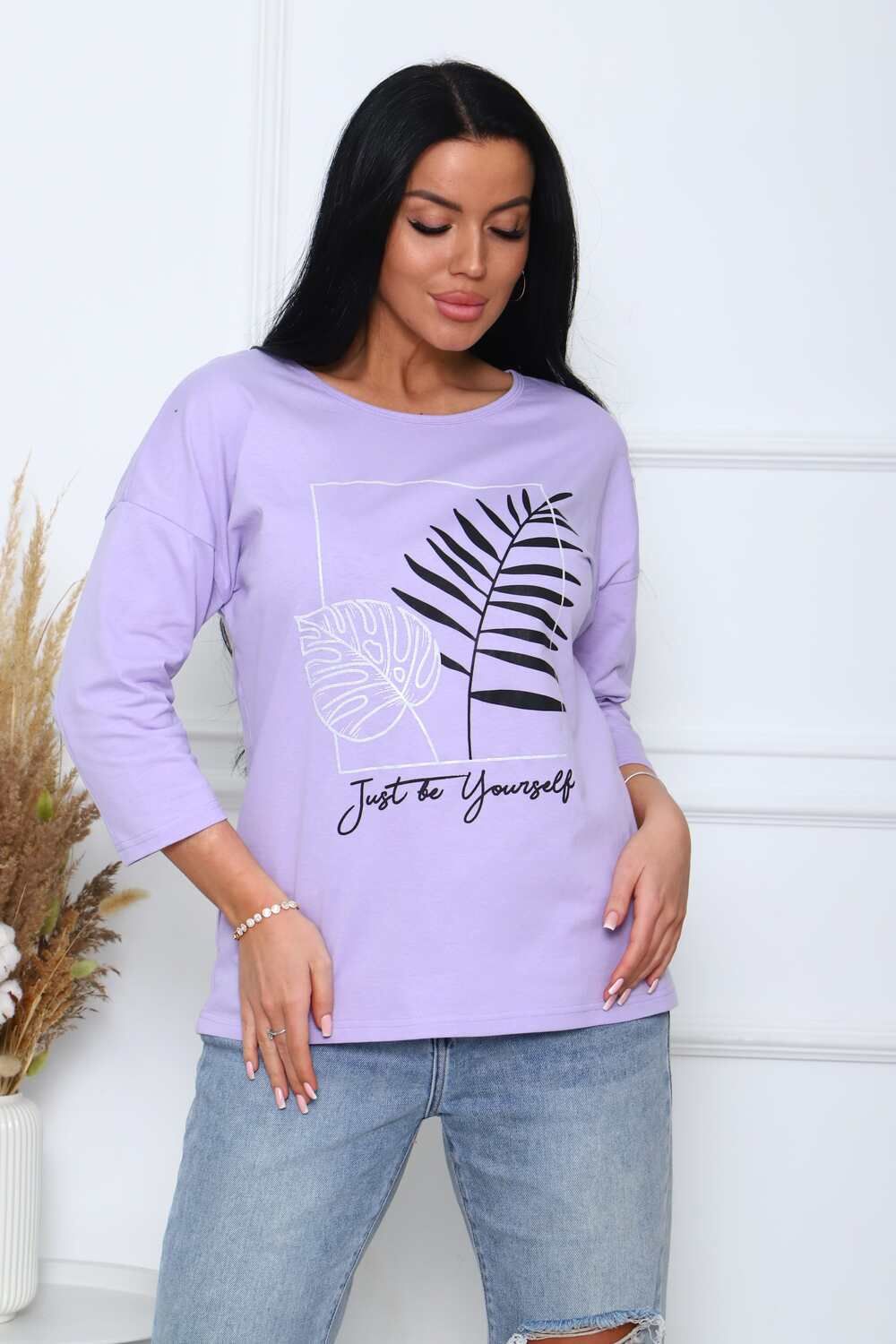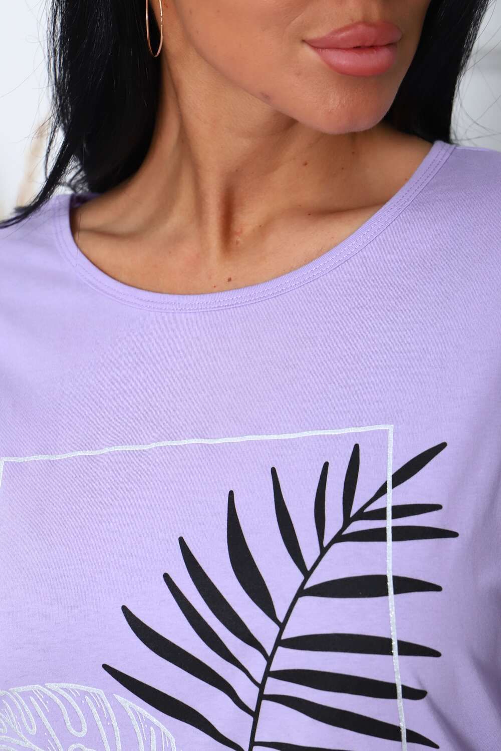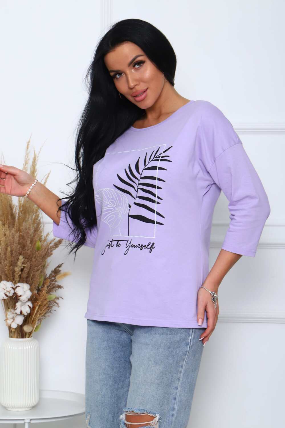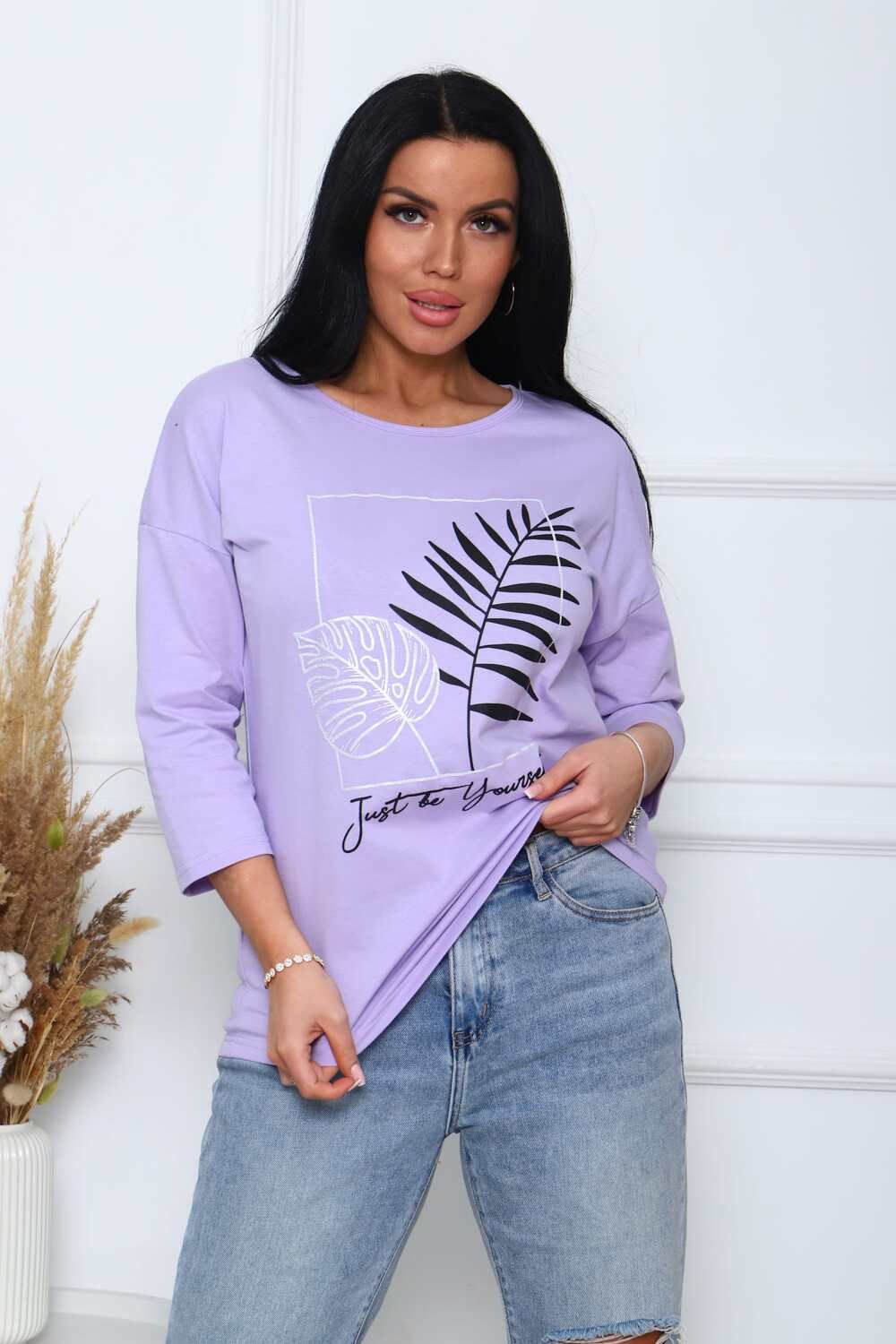 Туника женская. Ткань кулирка, хлопок 100%. Крой свободный, горловина круглой формы, обработана окантовкой. Линия плеч спущена. Длинна рукава 3/4, со швом по локтю. Низ изделия прямой. На полочке принт, шелкография.