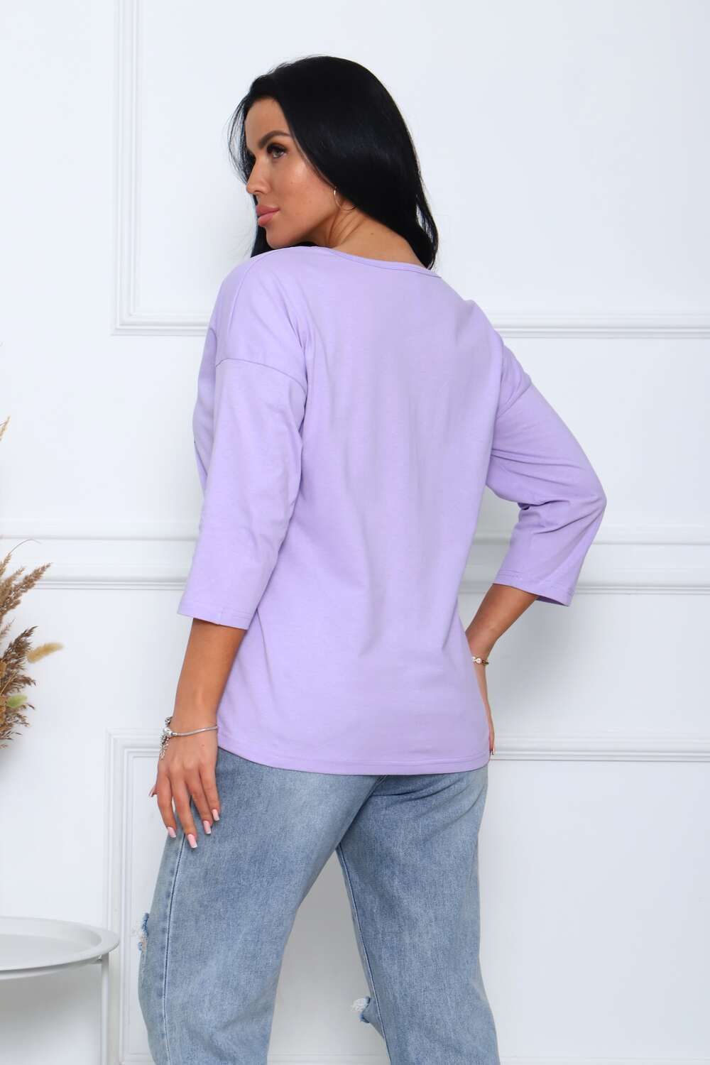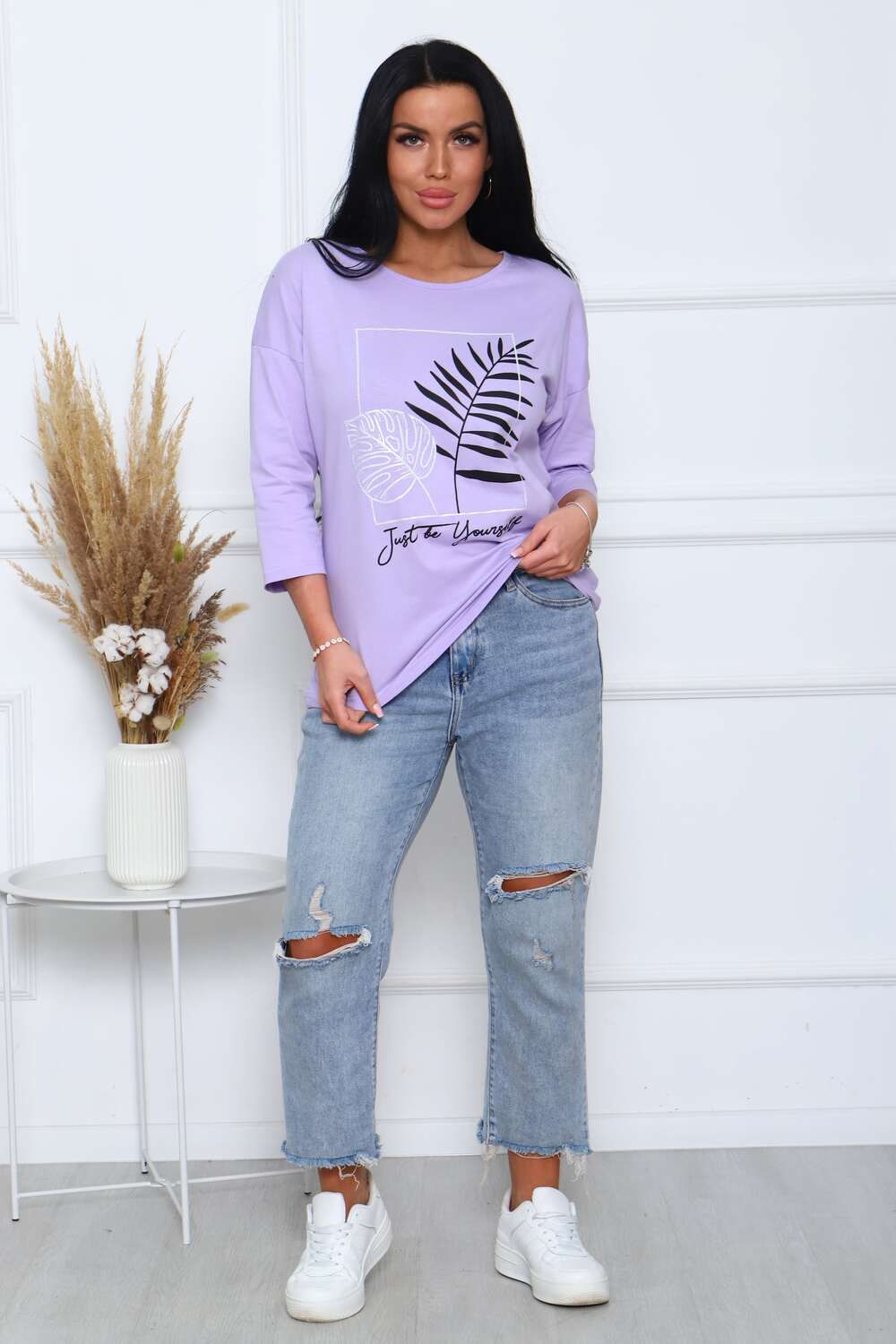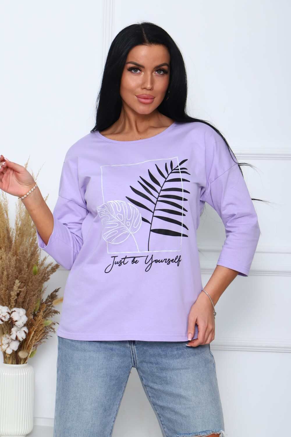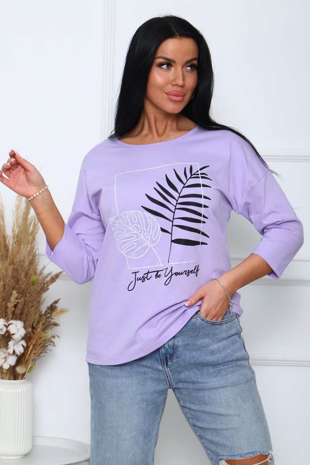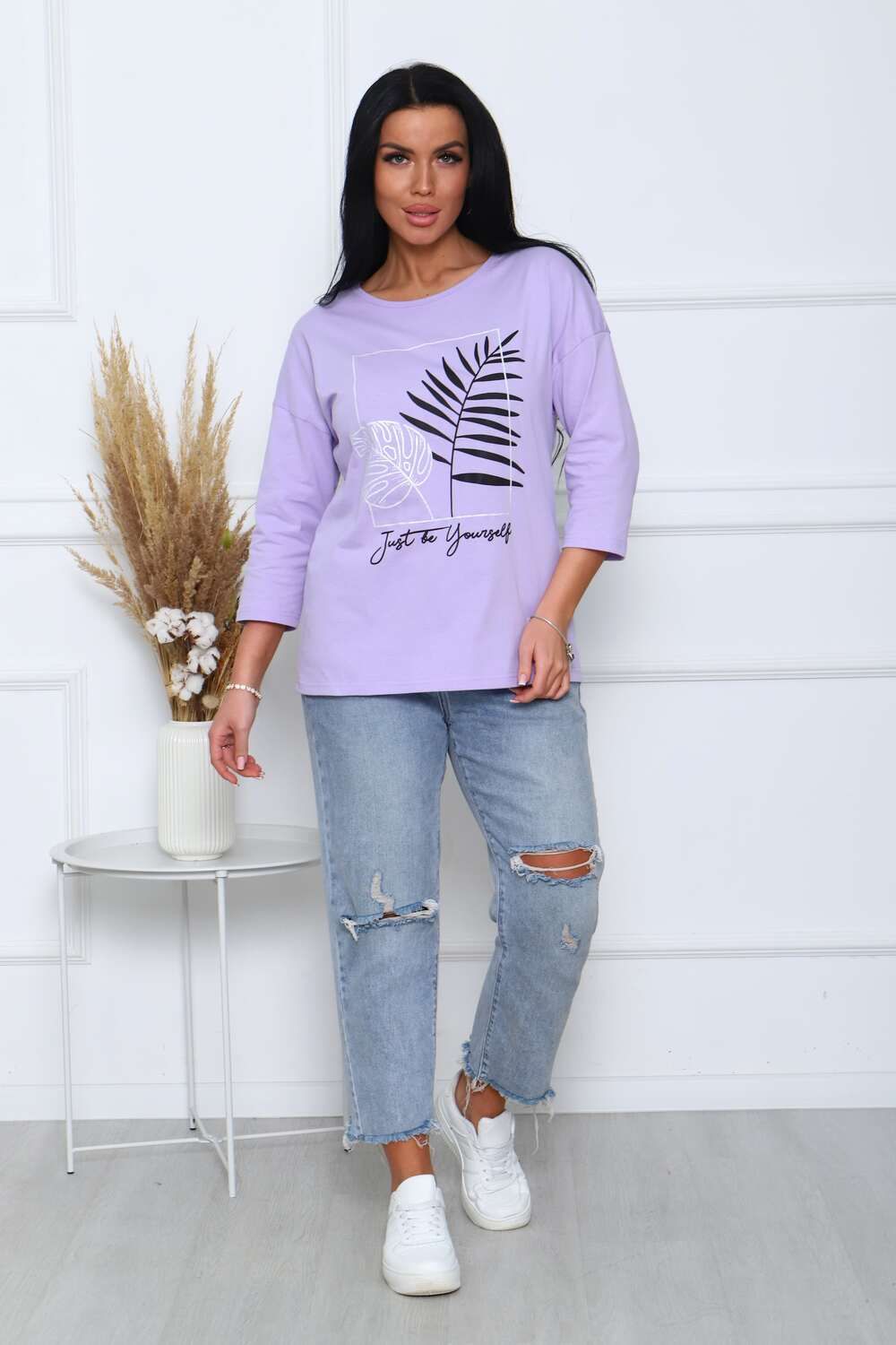 Туника женская. Ткань кулирка, хлопок 100%. Крой свободный, горловина круглой формы, обработана окантовкой. Линия плеч спущена. Длинна рукава 3/4, со швом по локтю. Низ изделия прямой. На полочке принт, шелкография.