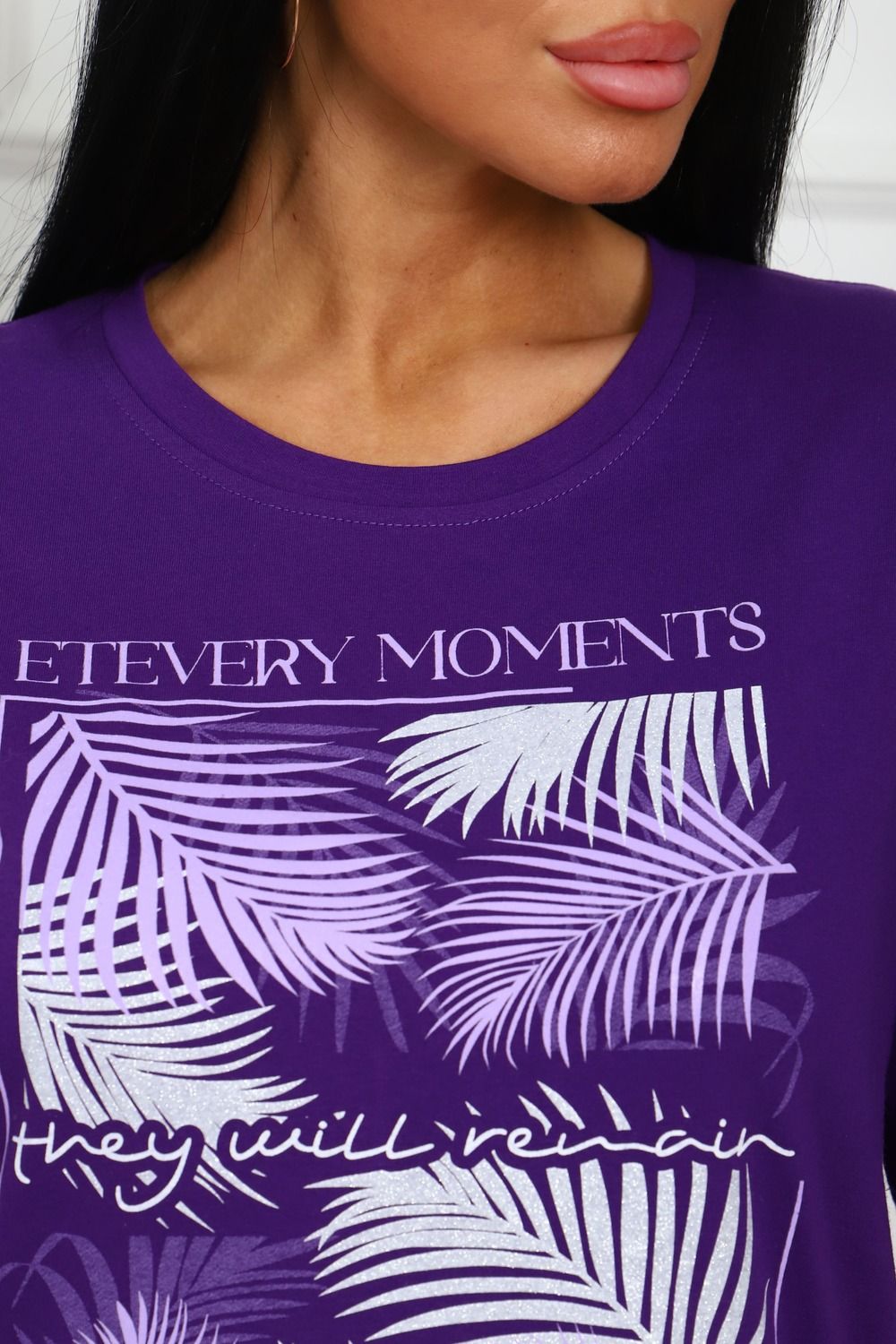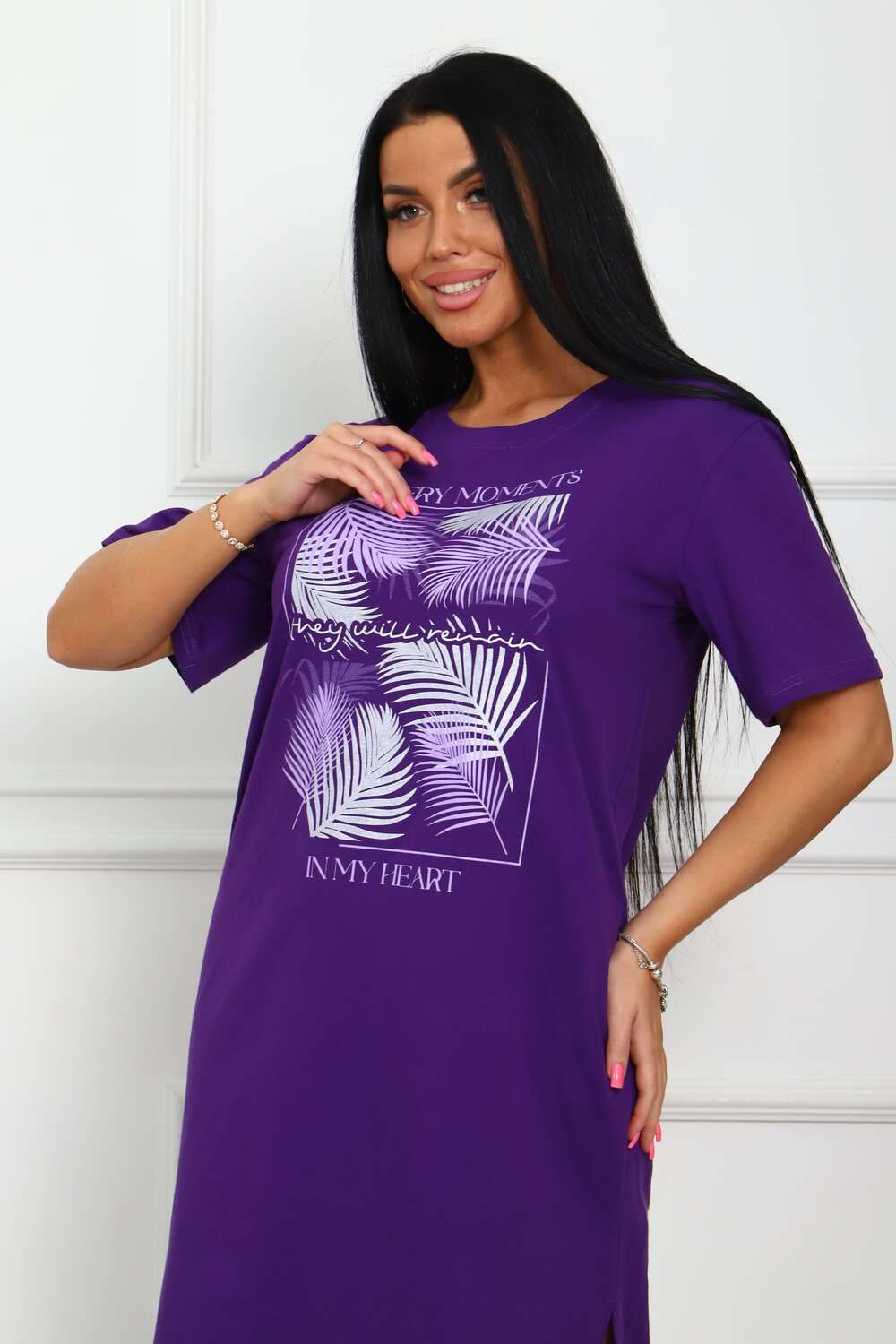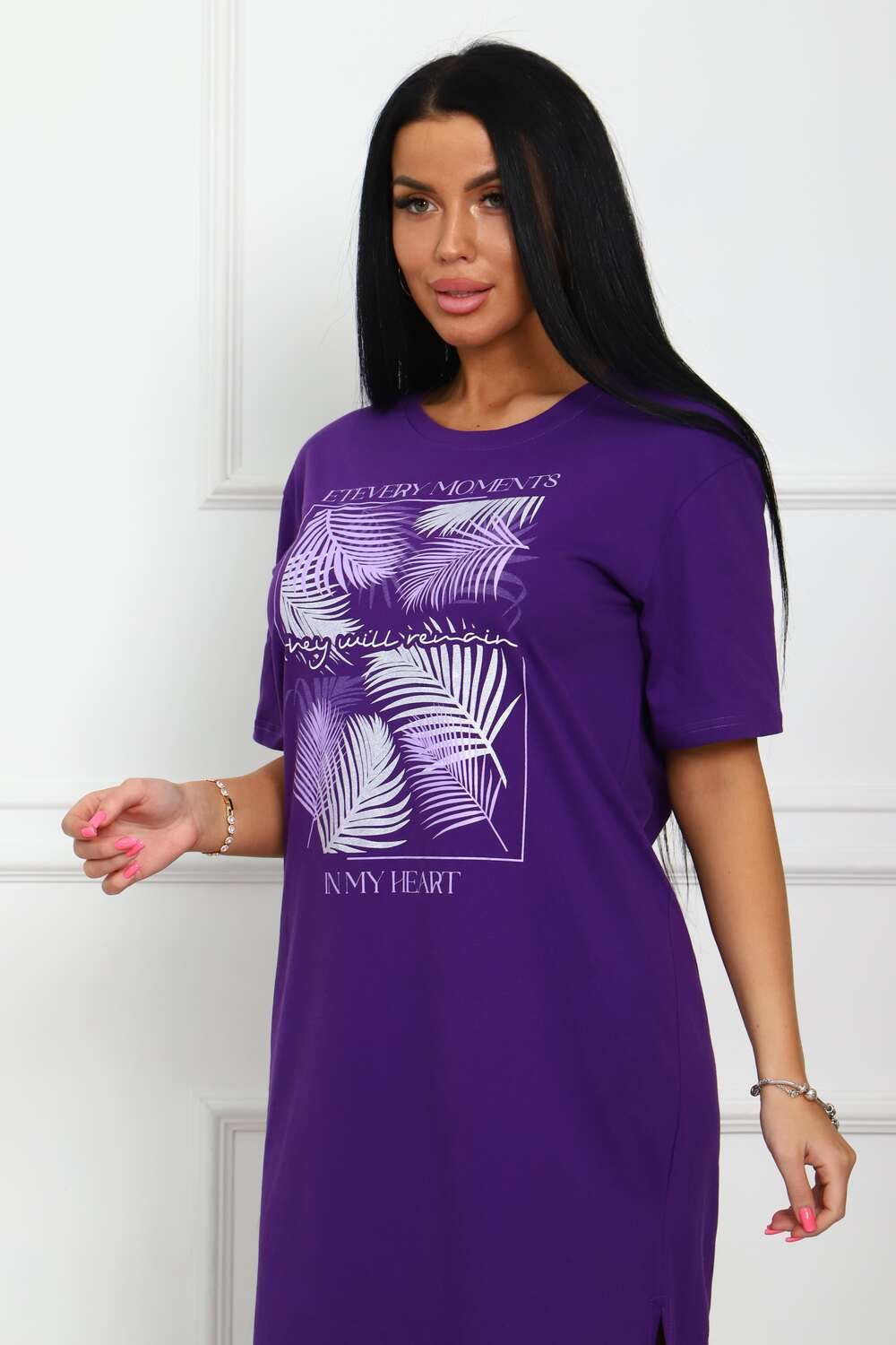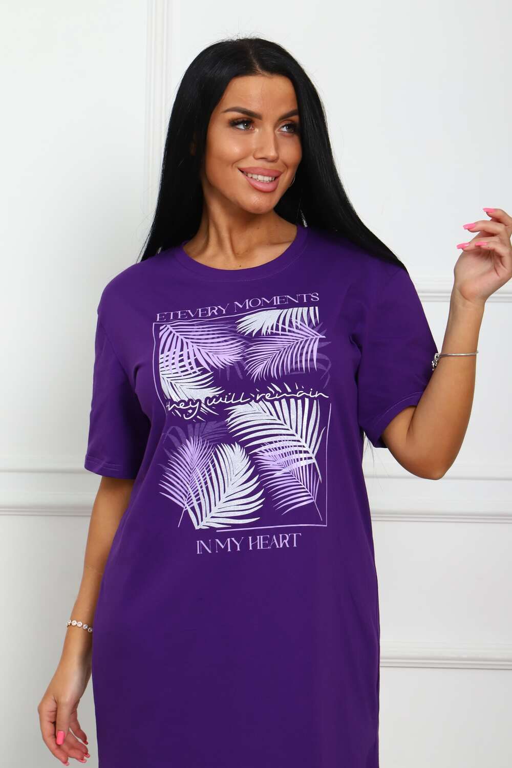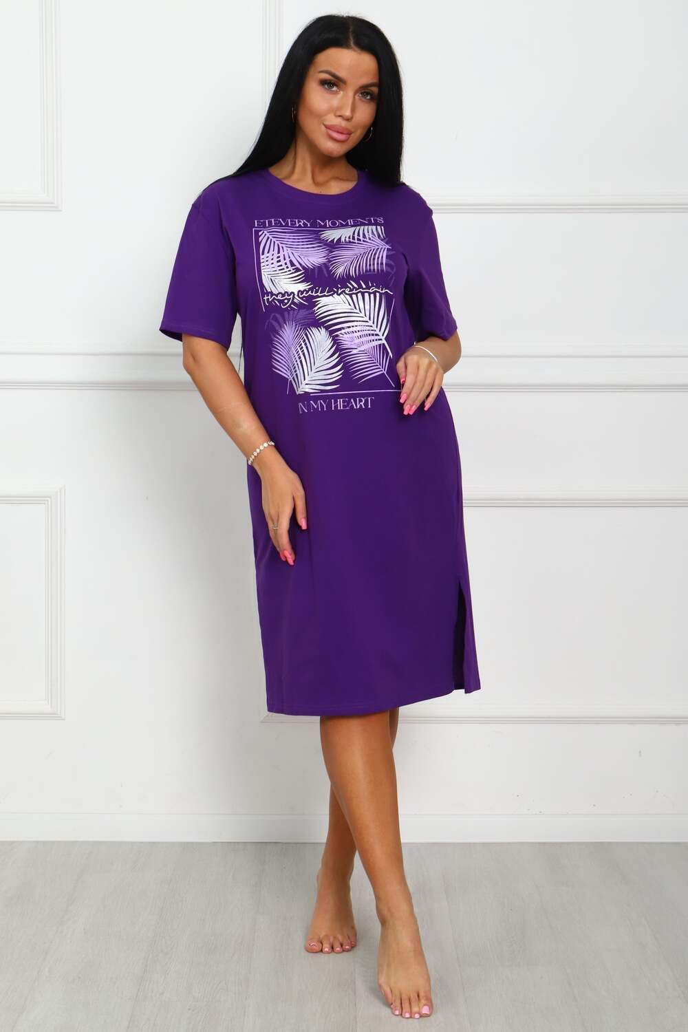 Туника женская прямого силуэта с разрезами в боковых швах. Низ изделия прямой. Длинна ниже колена, плечо спущенное, рукав короткий. Горловина круглой формы, обработана планкой с отделочной строчкой по шву притачивания. Принт (шелкография) располагается по центру переда.