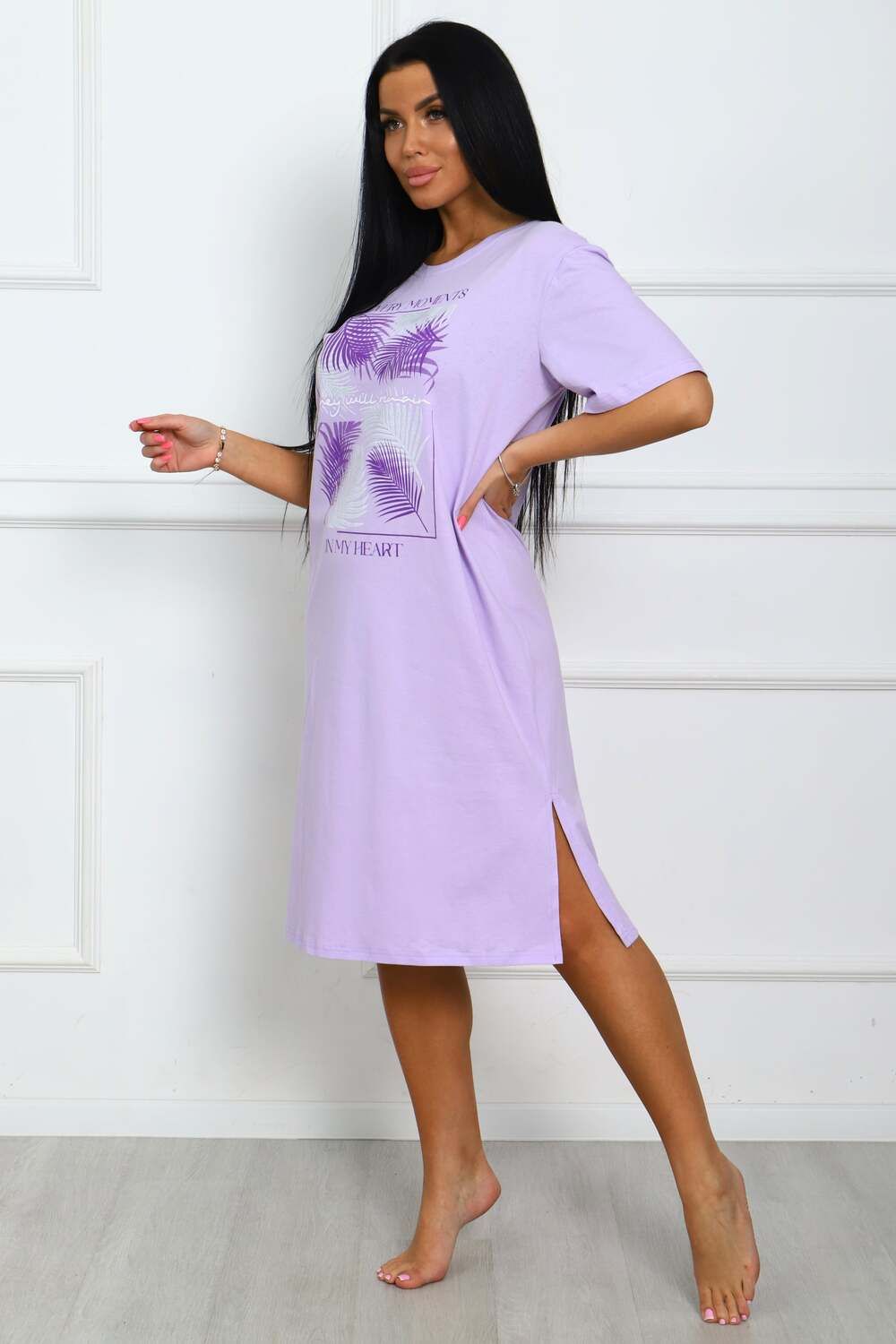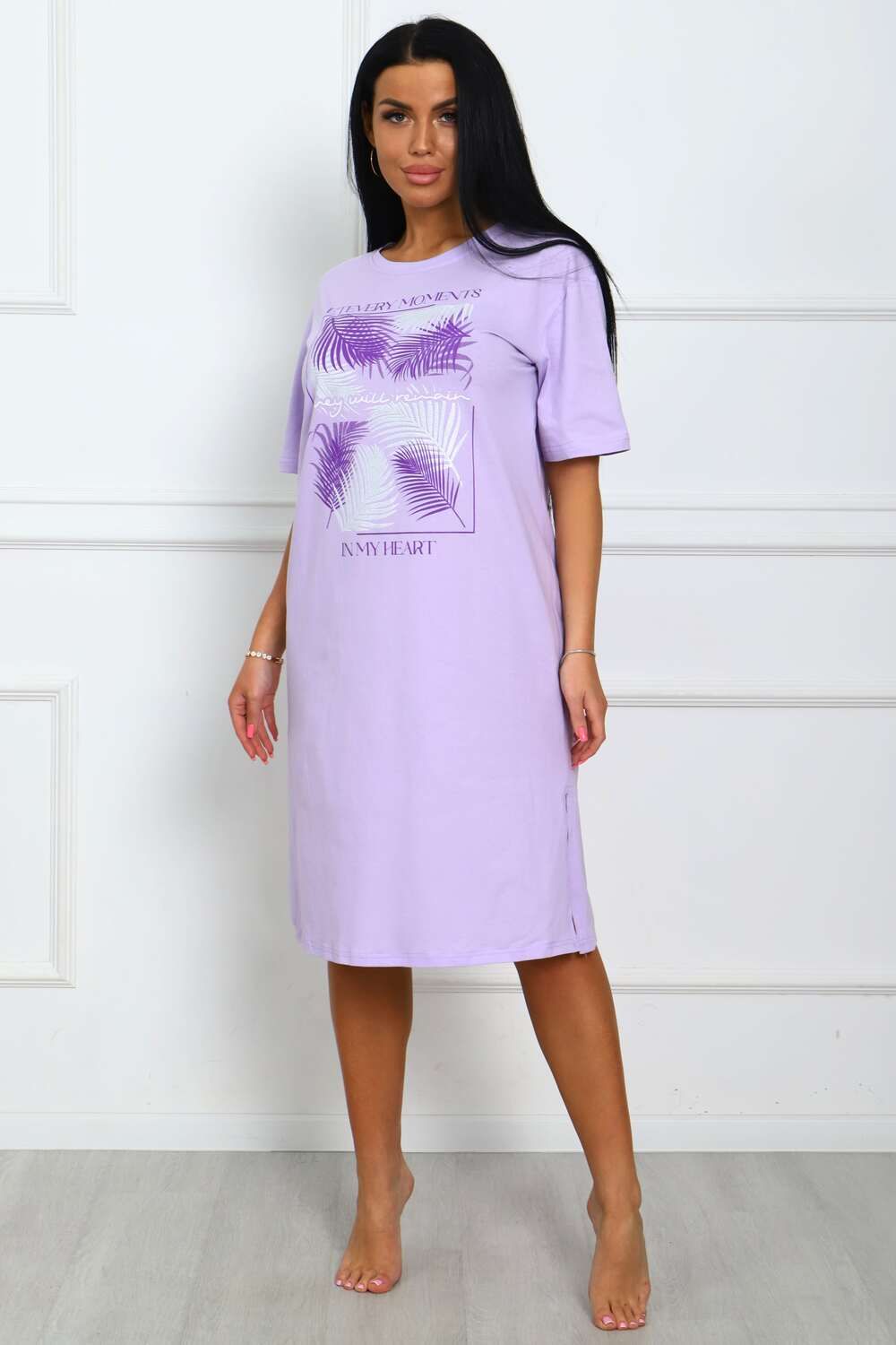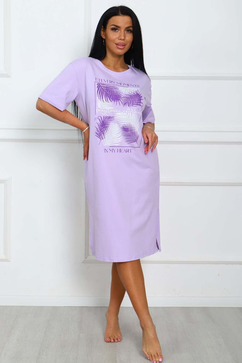 Сорочка женская прямого силуэта с разрезами по боковым швах. Низ изделия прямой. Длинна ниже колена, плечо спущенное, рукав короткий. Горловина круглой формы, обработана планкой с отделочной строчкой по шву притачивания. Принт (шелкография) располагается по центру переда.