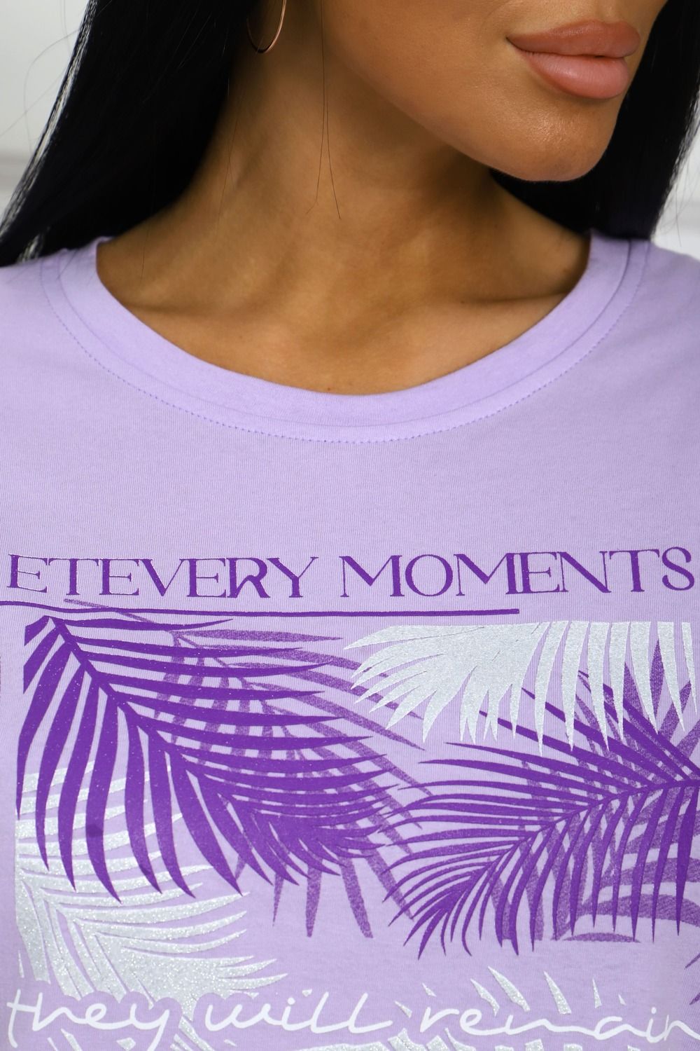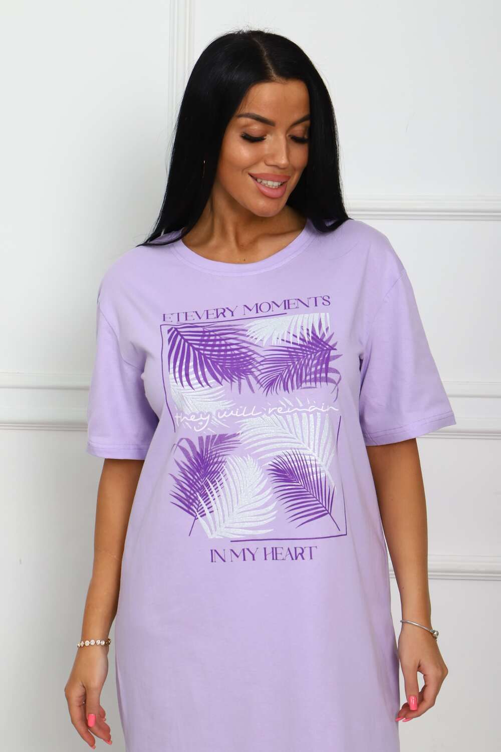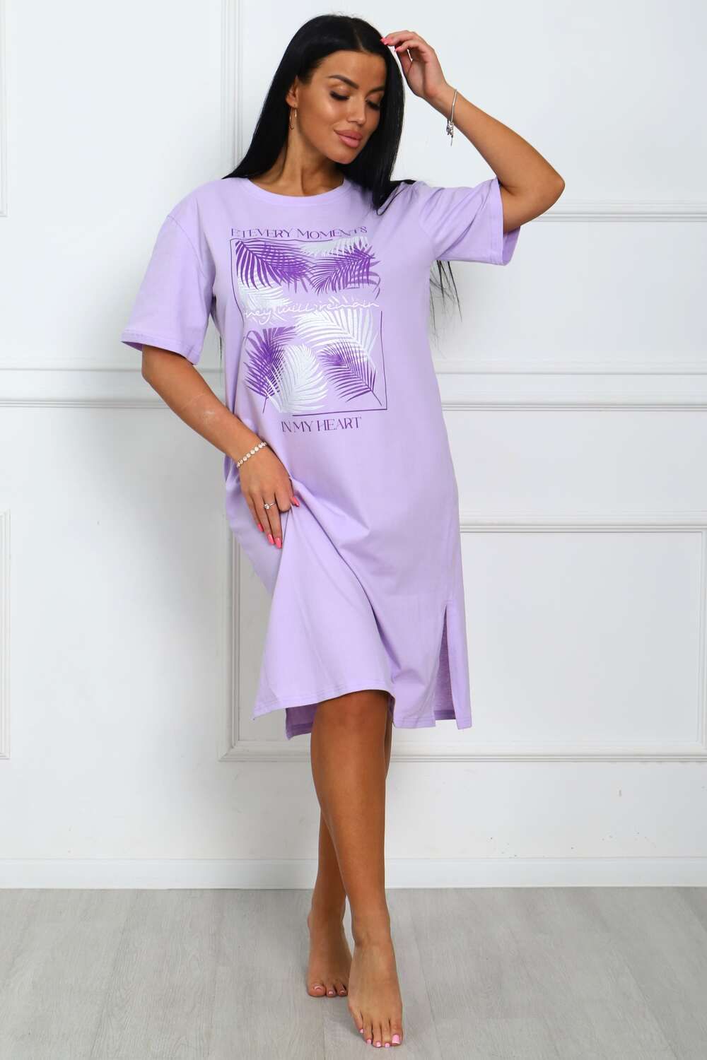 Сорочка женская прямого силуэта с разрезами по боковым швах. Низ изделия прямой. Длинна ниже колена, плечо спущенное, рукав короткий. Горловина круглой формы, обработана планкой с отделочной строчкой по шву притачивания. Принт (шелкография) располагается по центру переда.