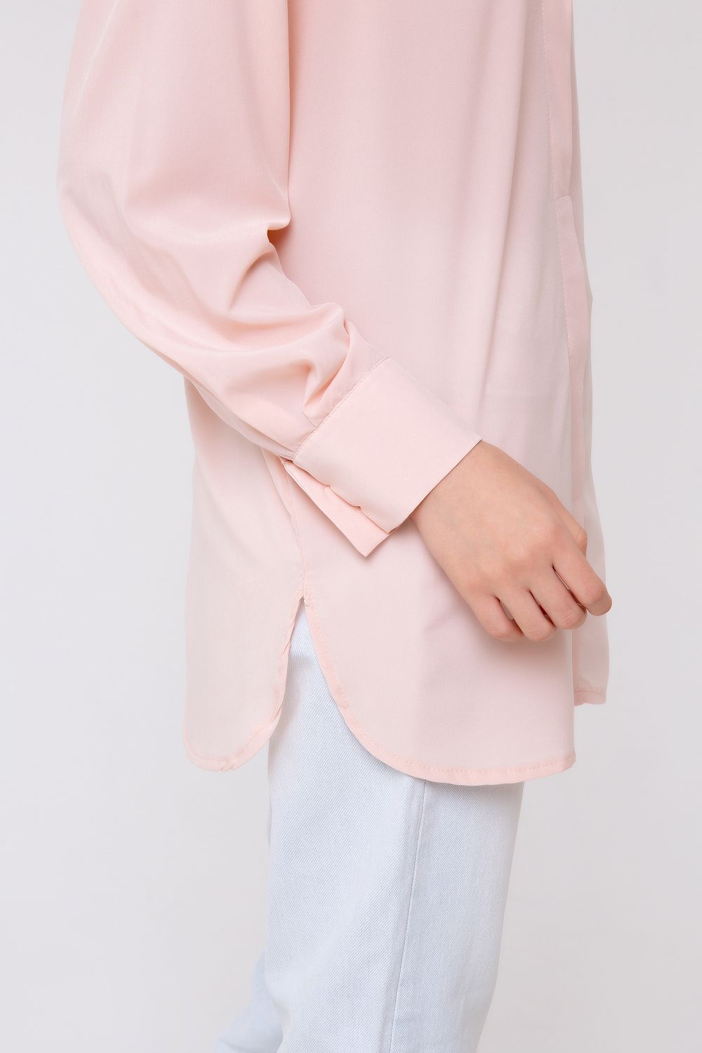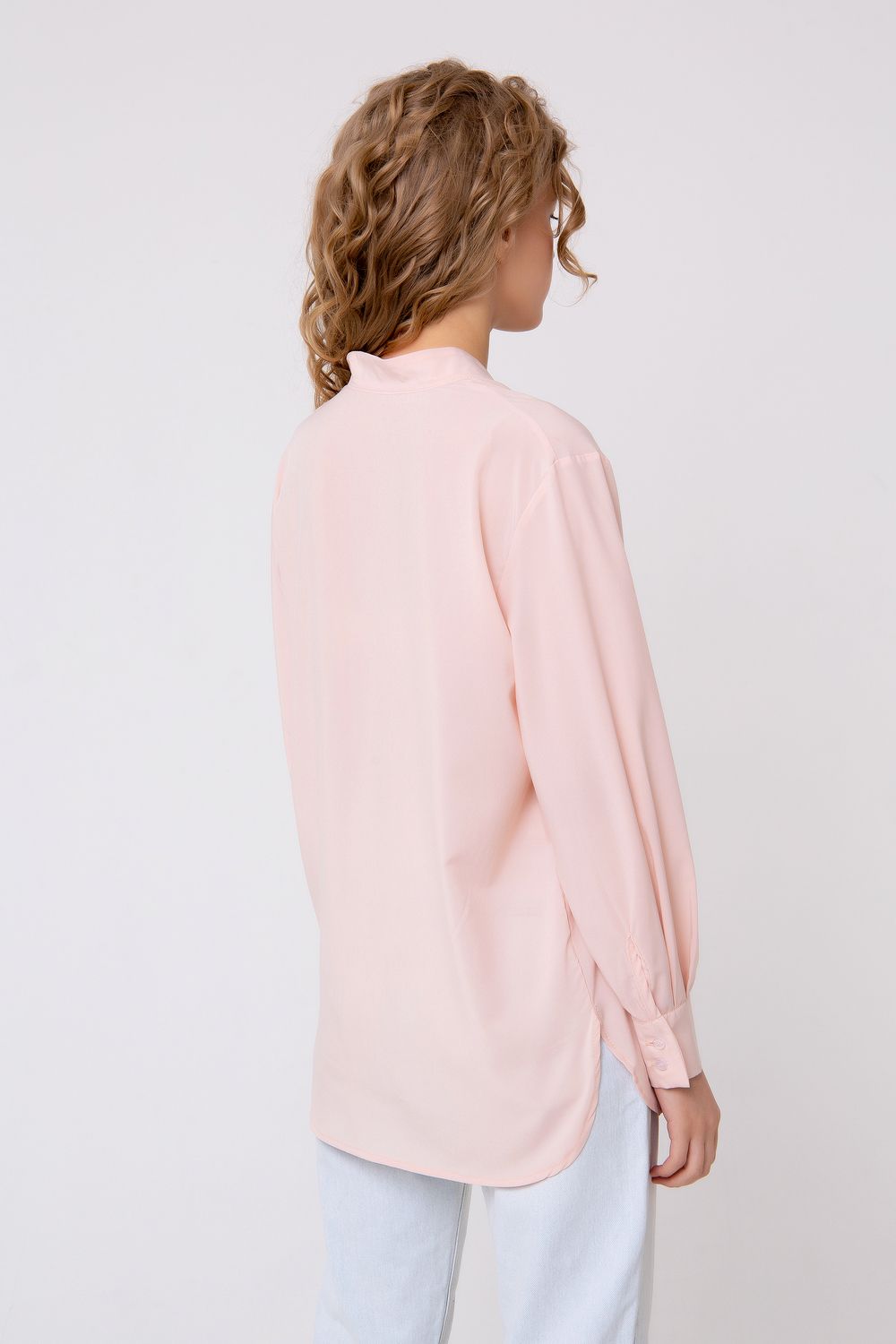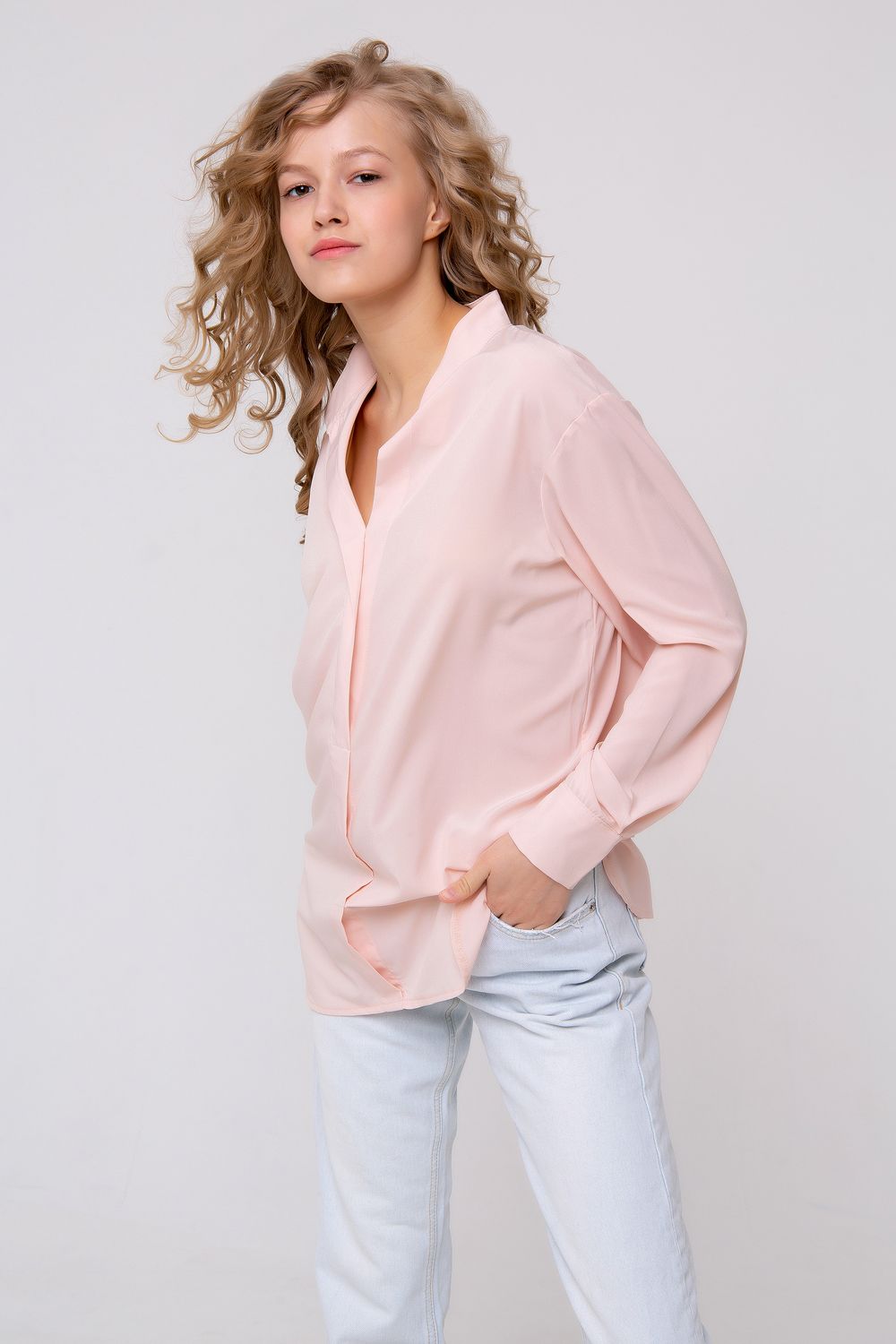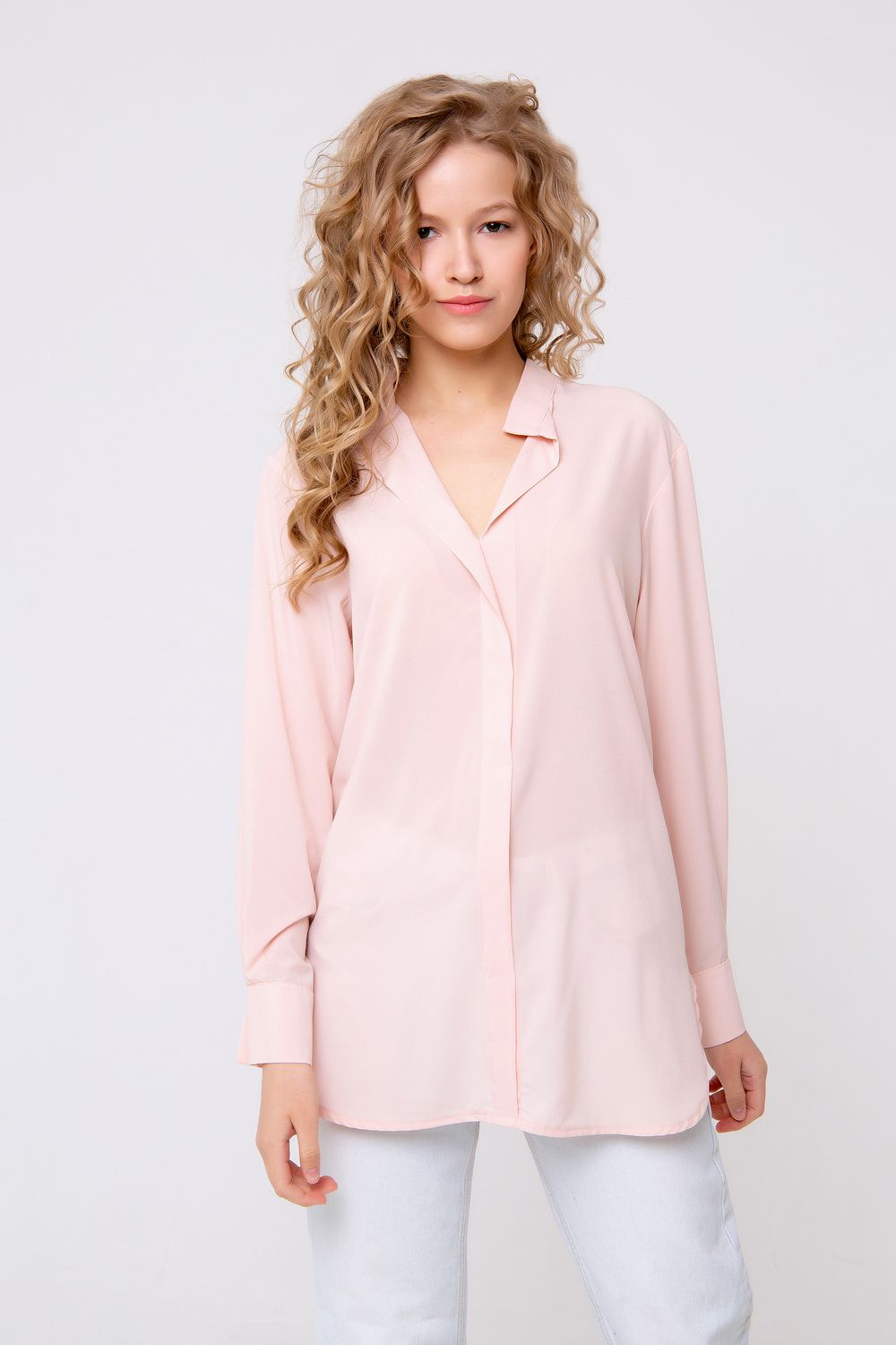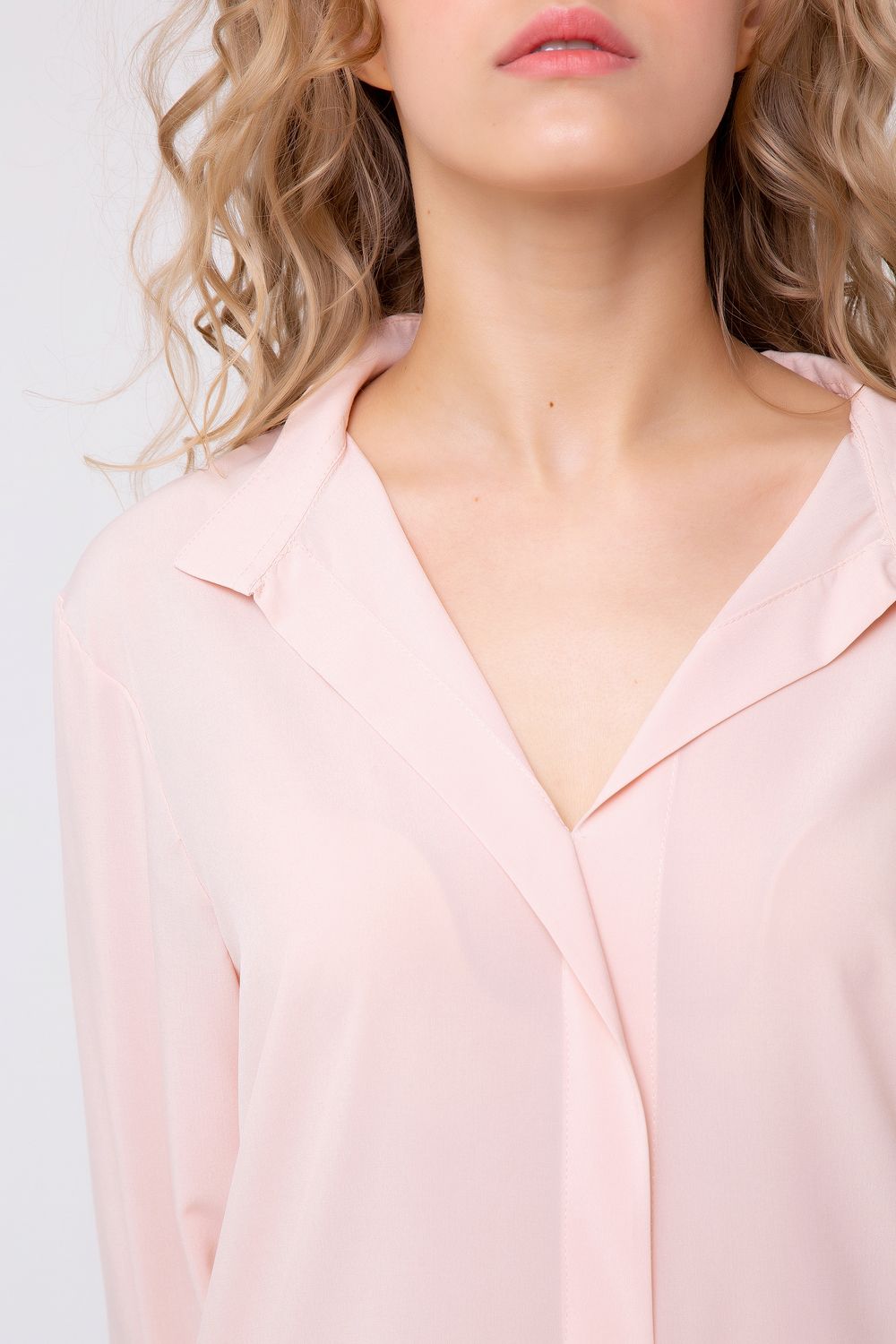 Эффектная блуза прямого кроя. Выполнена в пастельном персиковом цвете. Вырез горловины V-образный, рубашечного типа. Имитация суппатной застежки. Изделие дополнено небольшими боковыми разрезами, а также лёгкой асимметрией по спинке. Такая модель составит эффектную комбинацию с кожаными лосинами или узкими брюками. Состав: ниагара/100% полиэстер. Длина изделия 80 см. Рост модели на фото 173 см.