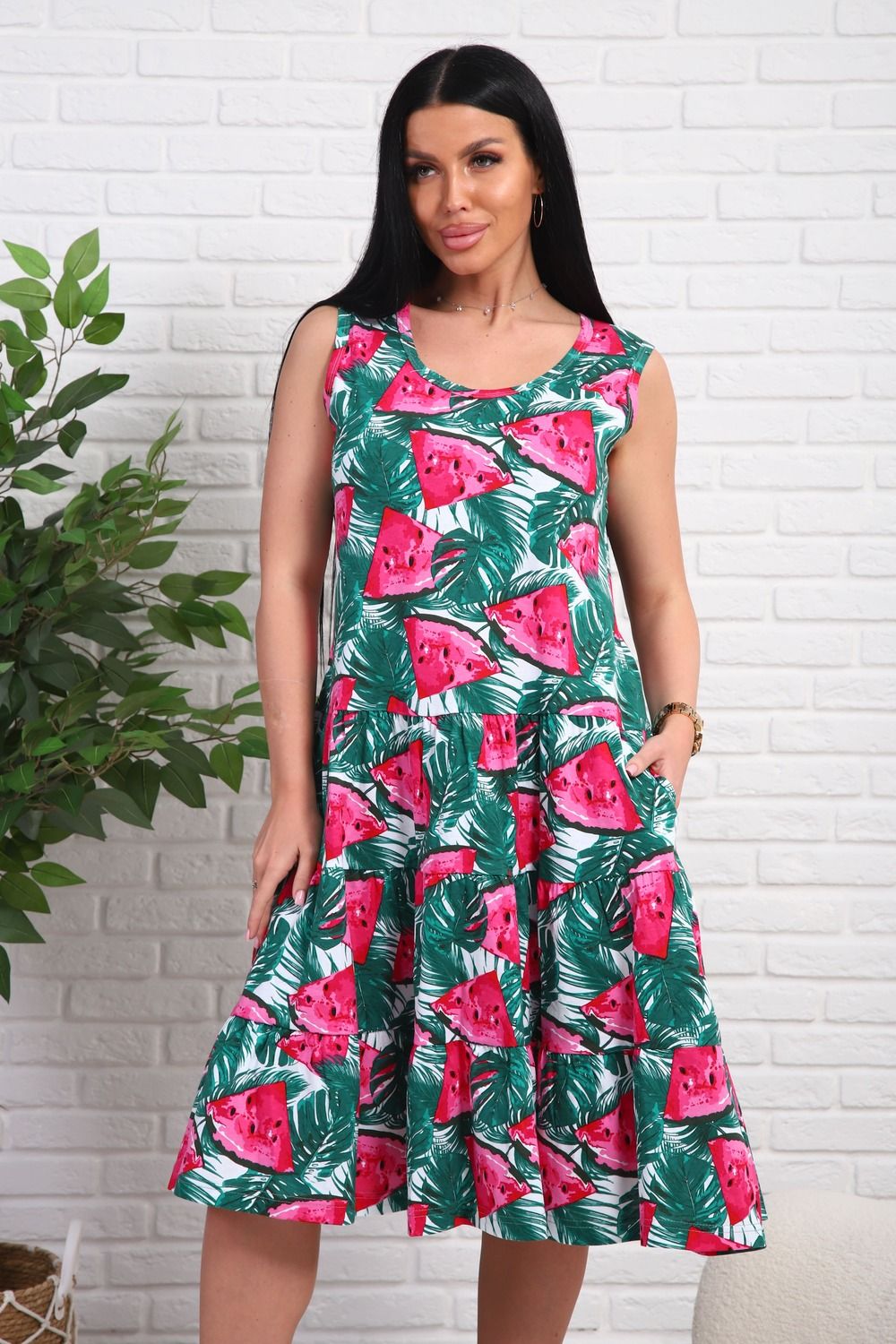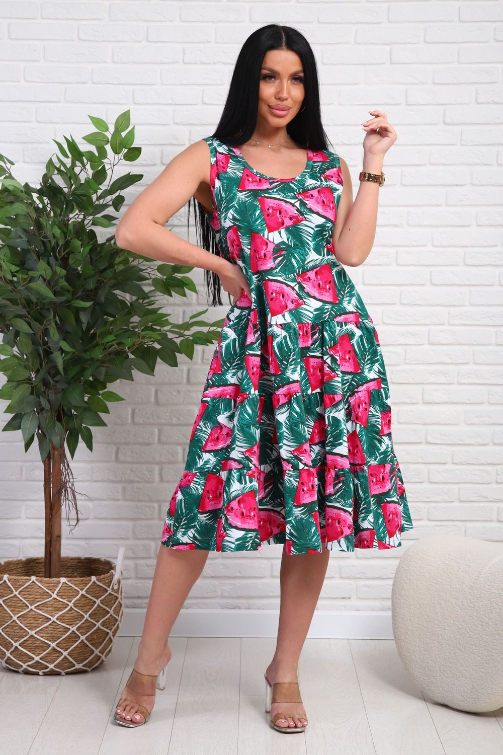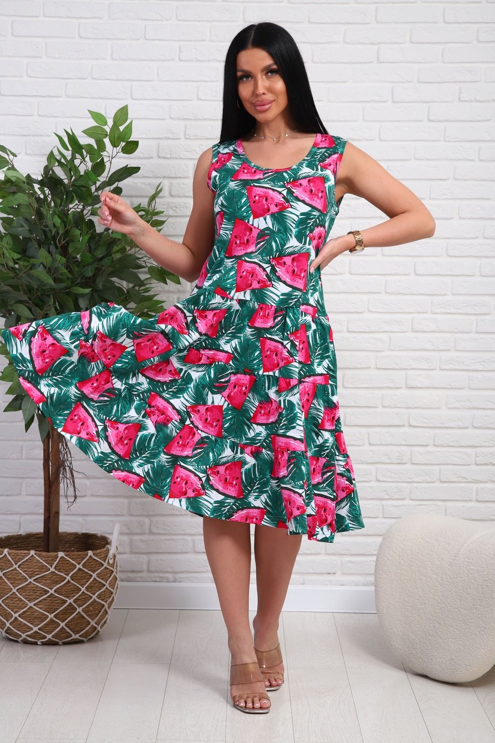 Платье-сарафан из натурального набивного трикотажа. Лиф приталенного силуэта. Юбка трёхъярусная , пышная. Горловина круглой формы. Рукавов нет. в боковых швах карманы.