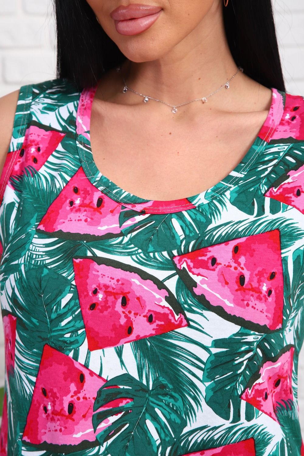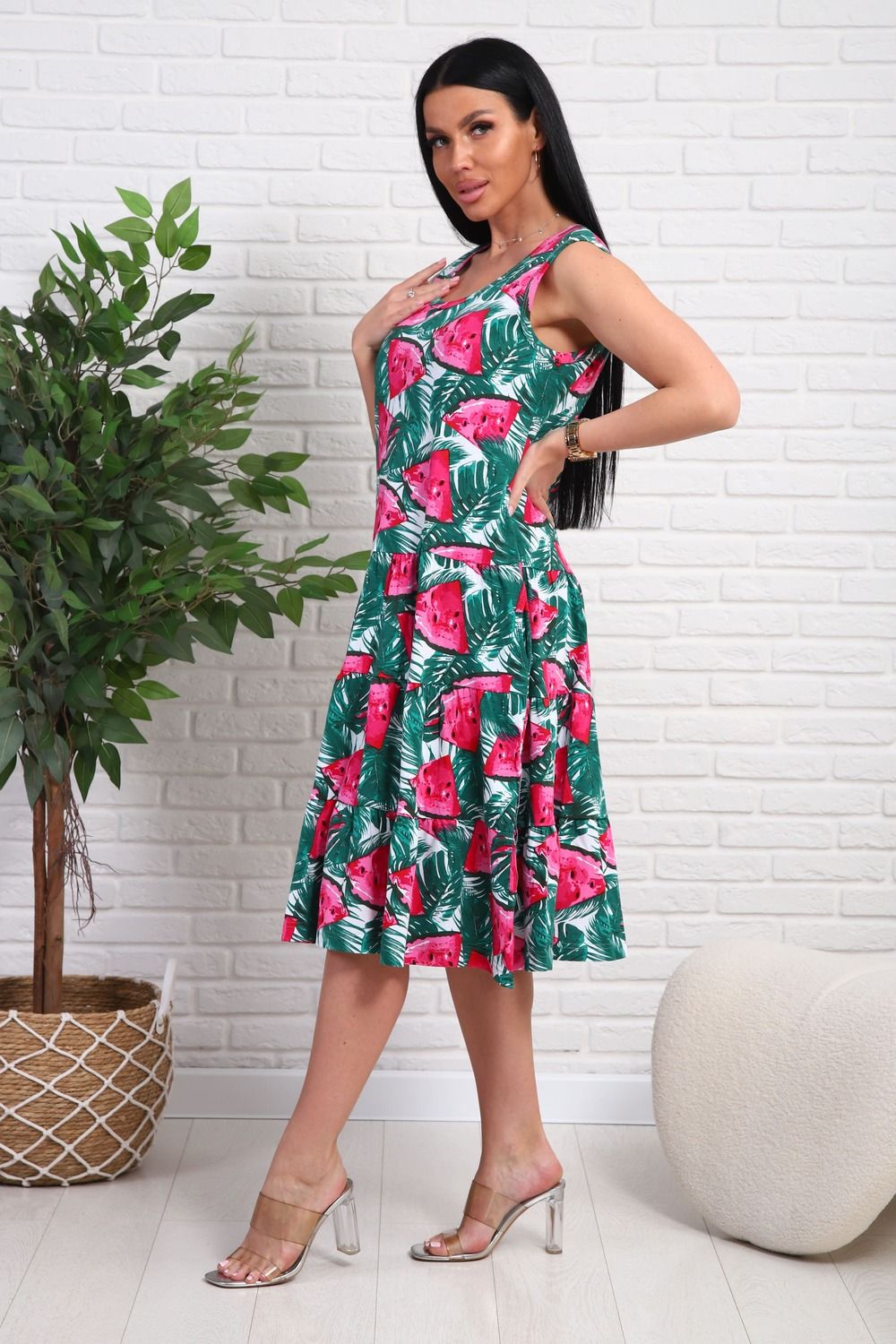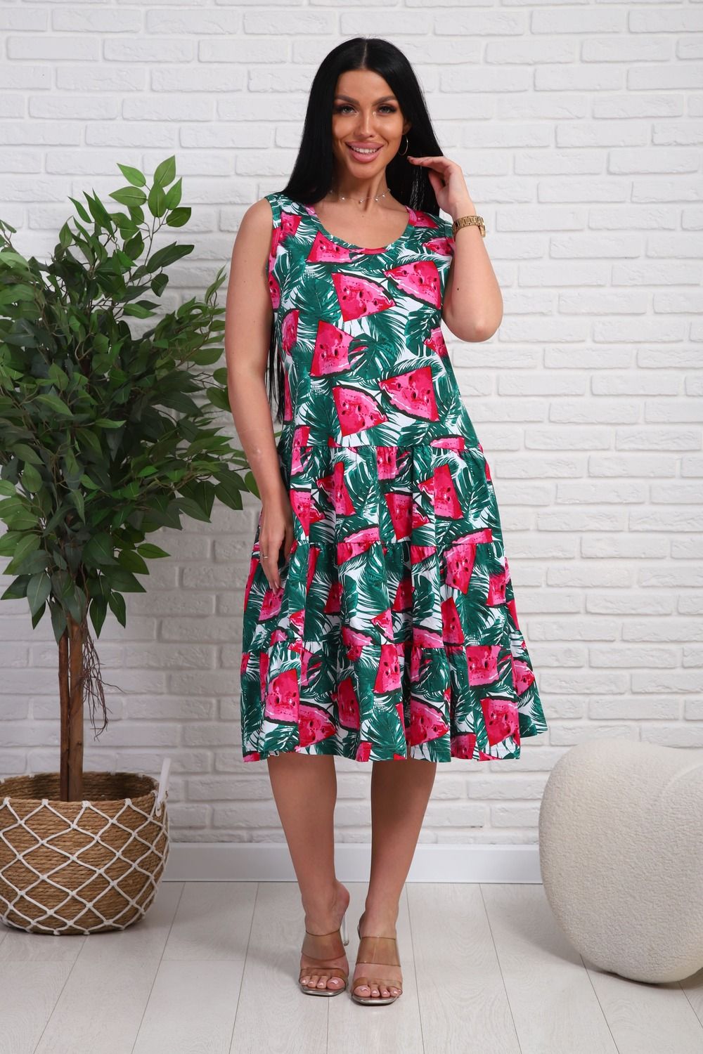 Платье-сарафан из натурального набивного трикотажа. Лиф приталенного силуэта. Юбка трёхъярусная , пышная. Горловина круглой формы. Рукавов нет. в боковых швах карманы.