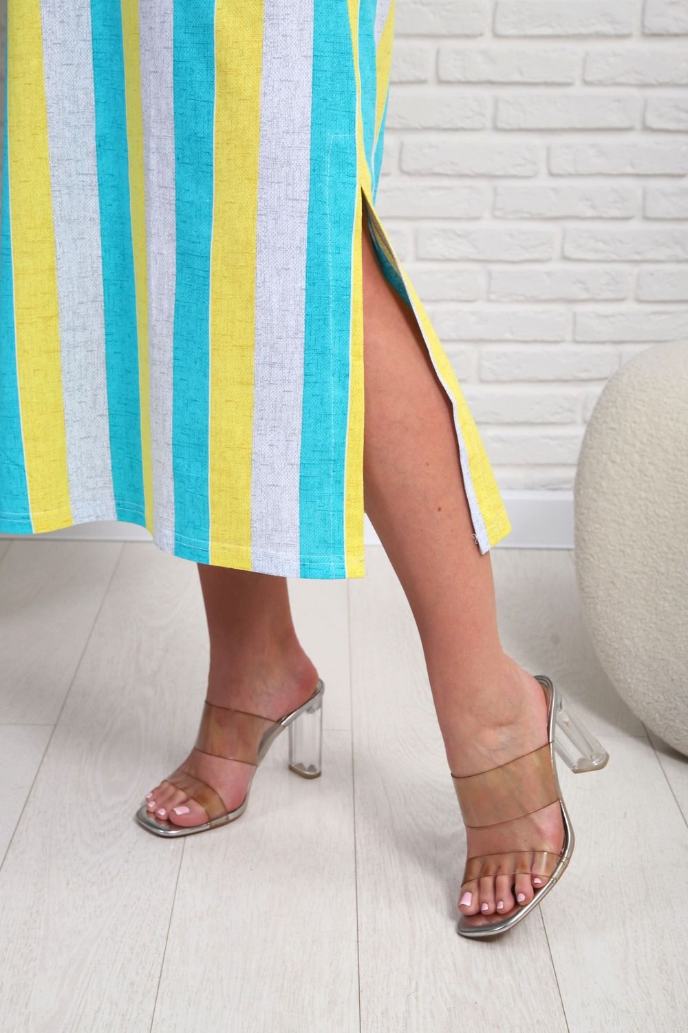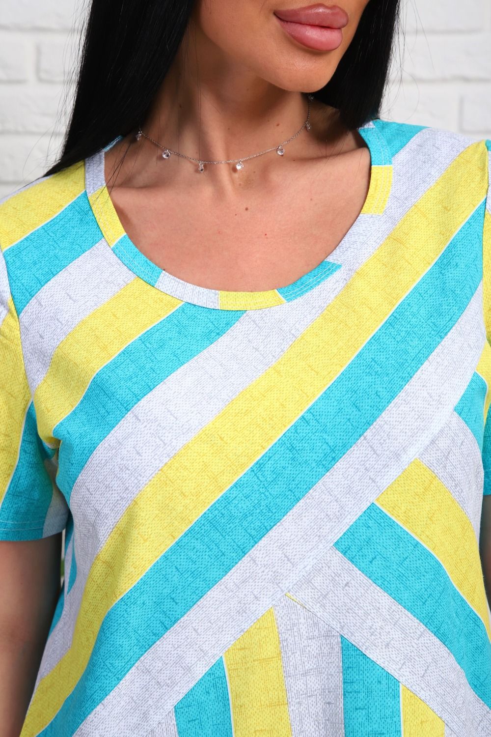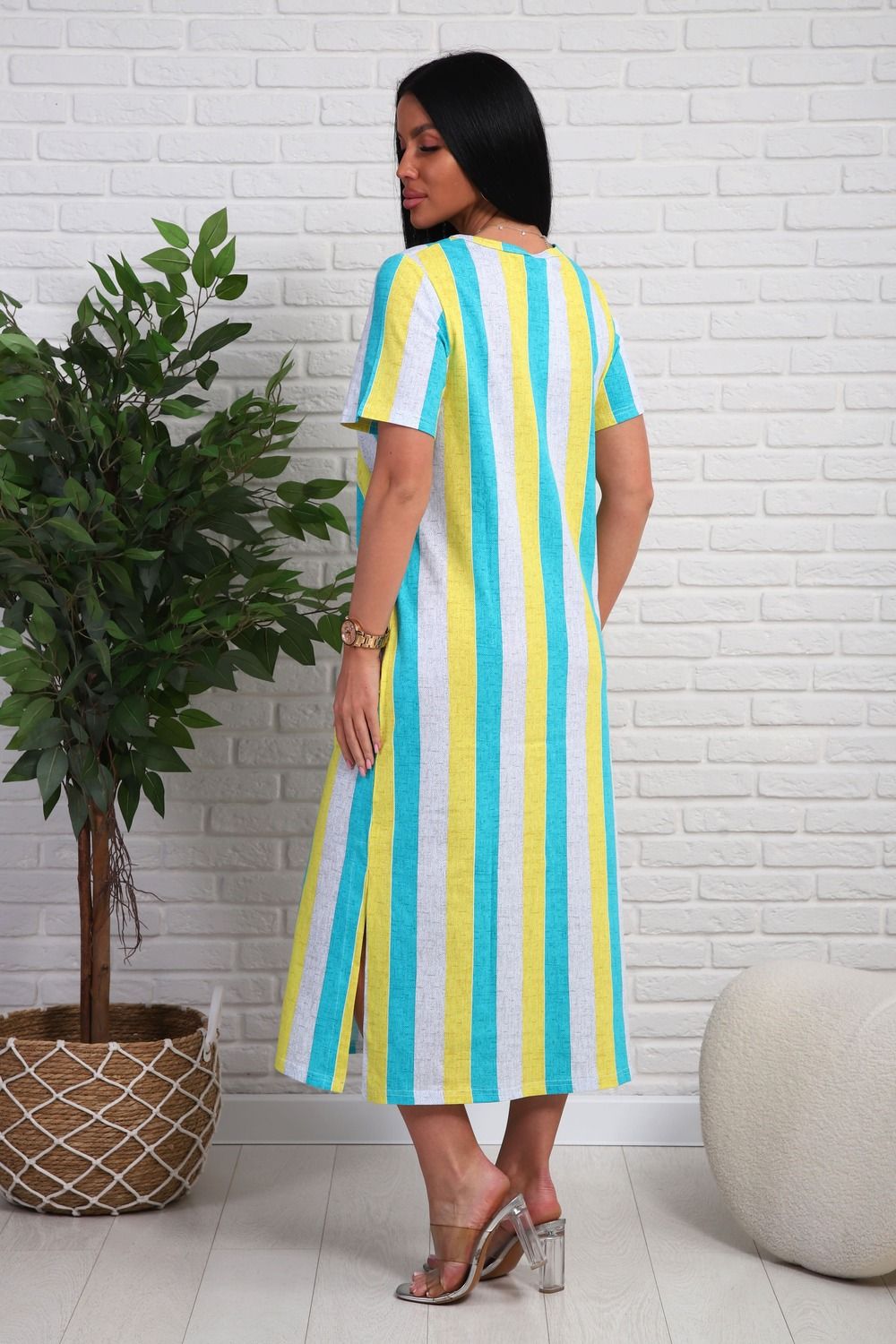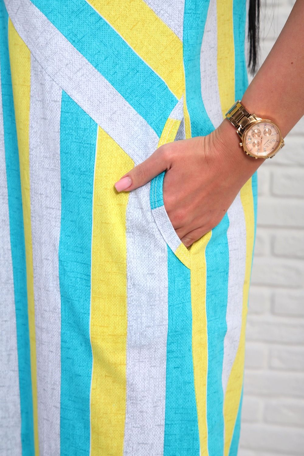 Платье из натурального набивного трикотажа. Силуэт прямой. Длина миди. Рукав короткий. Горловина круглая. На полочке фигурные подрезы. Карманы и разрезы в боковых швах.