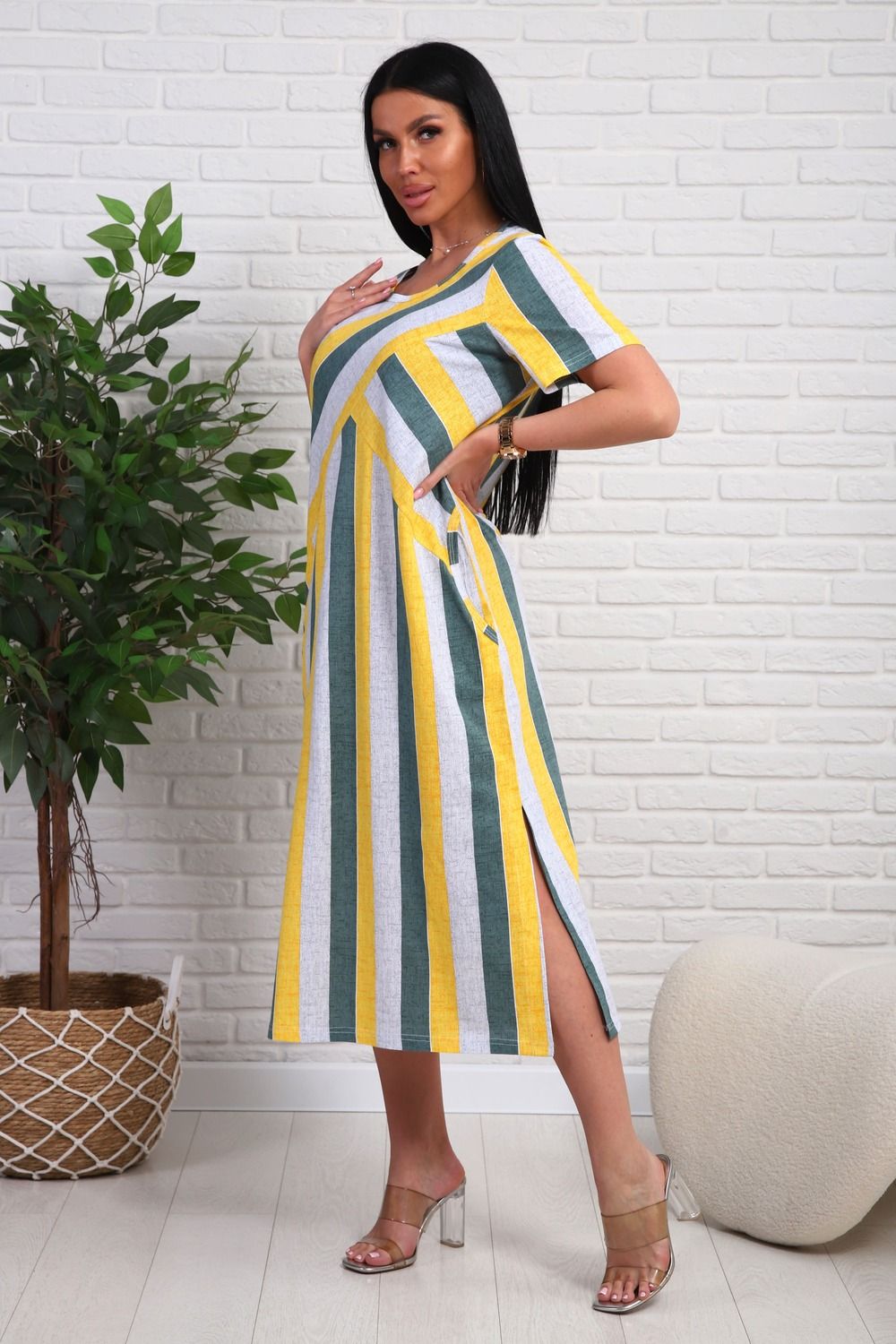 Платье из натурального набивного трикотажа. Силуэт прямой. Длина миди. Рукав короткий. Горловина круглая. На полочке фигурные подрезы. Карманы и разрезы в боковых швах.