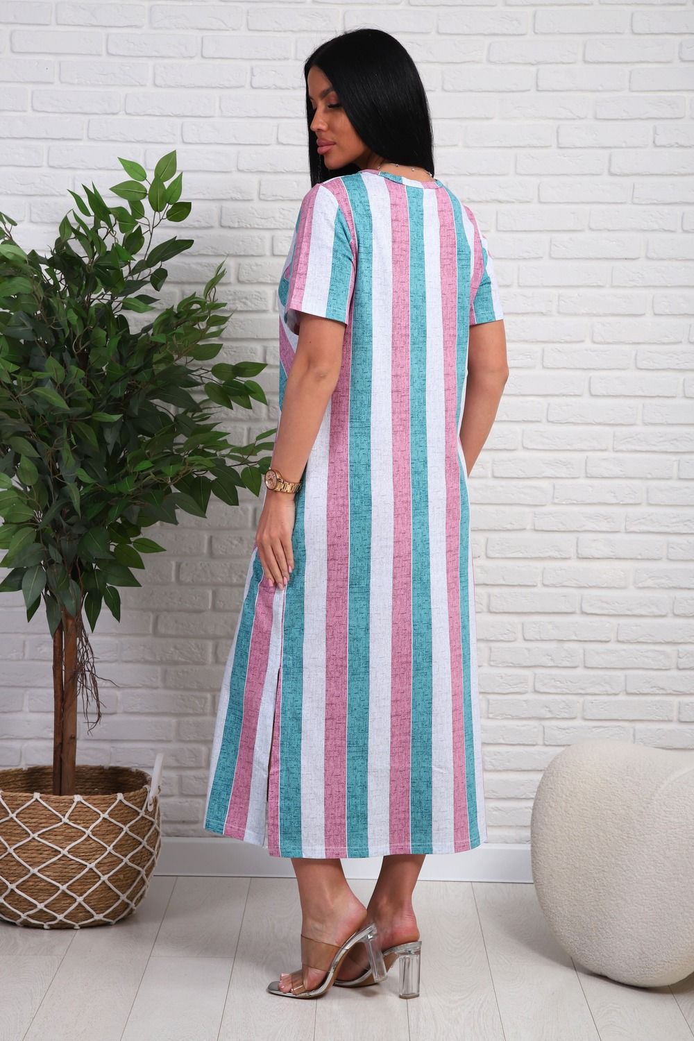 Платье из натурального набивного трикотажа. Силуэт прямой. Длина миди. Рукав короткий. Горловина круглая. На полочке фигурные подрезы. Карманы и разрезы в боковых швах.