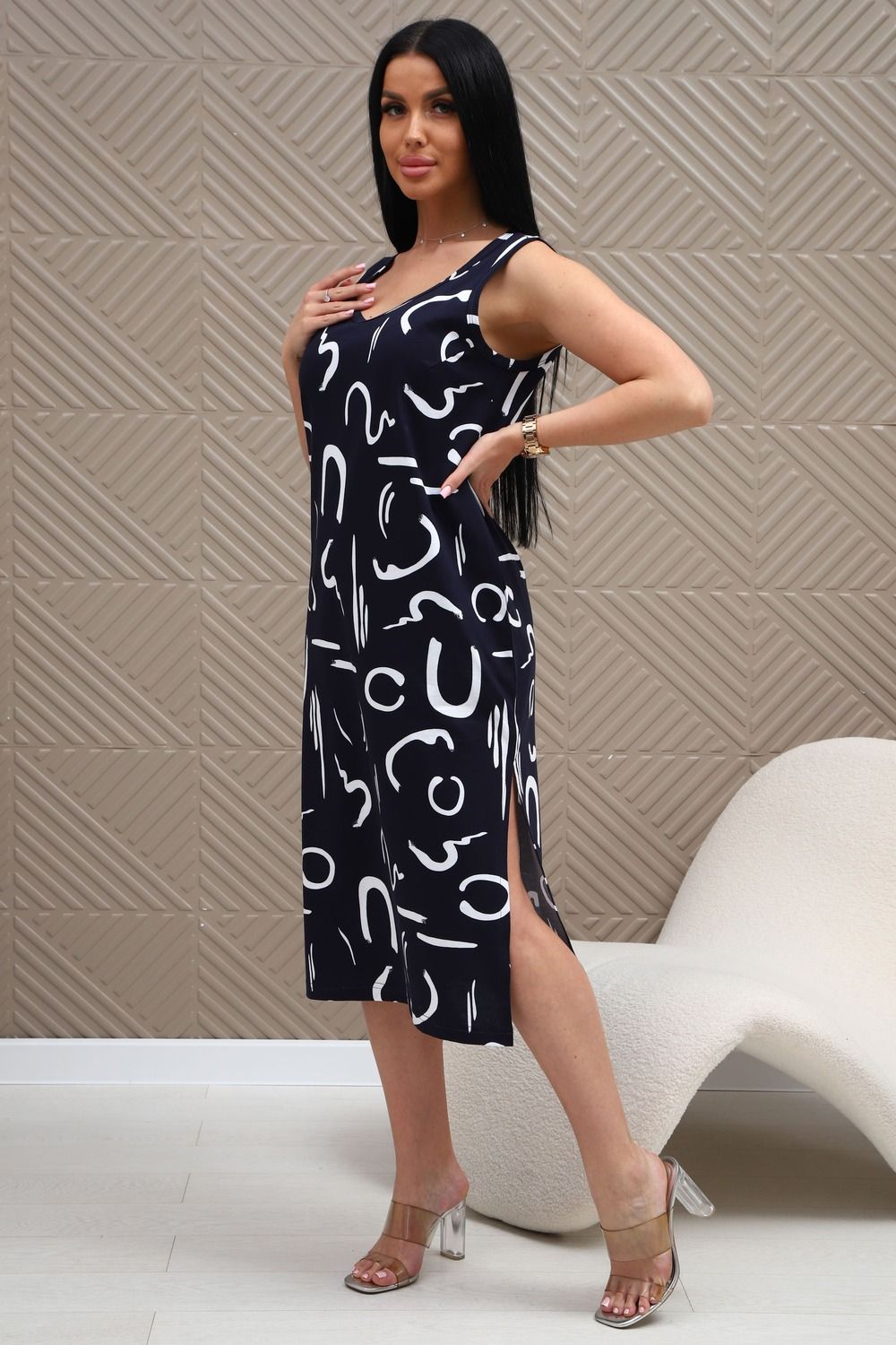 Сарафан из натурального трикотажного полотна. Силуэт прямой, слегка приталенный. Горловина V-образной формы. Без рукава. Спинка и перед гладкие, без рельефов. В боковых швах карманы. Разрезы по низу с двух сторон. Низ изделия прямой.