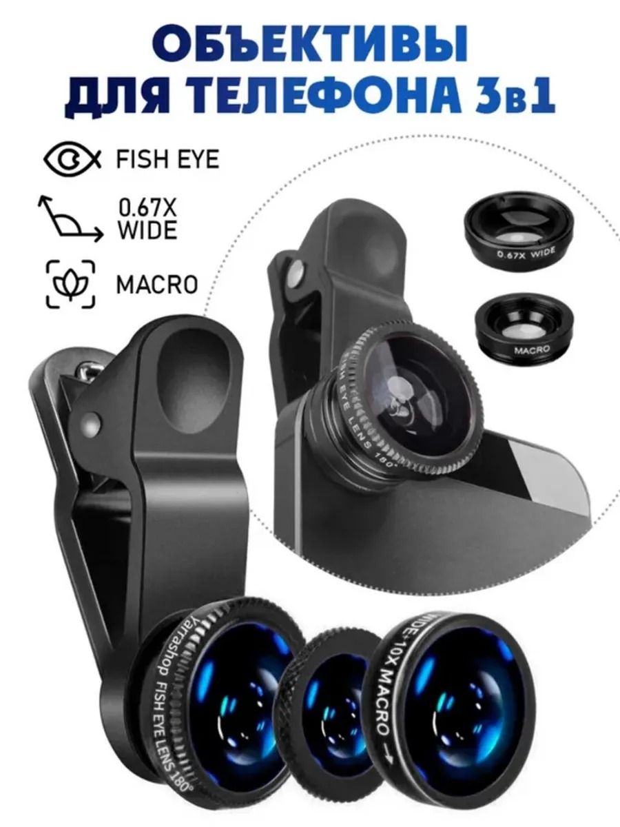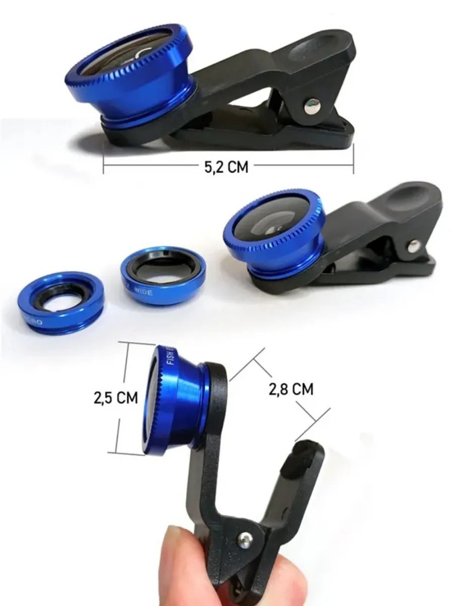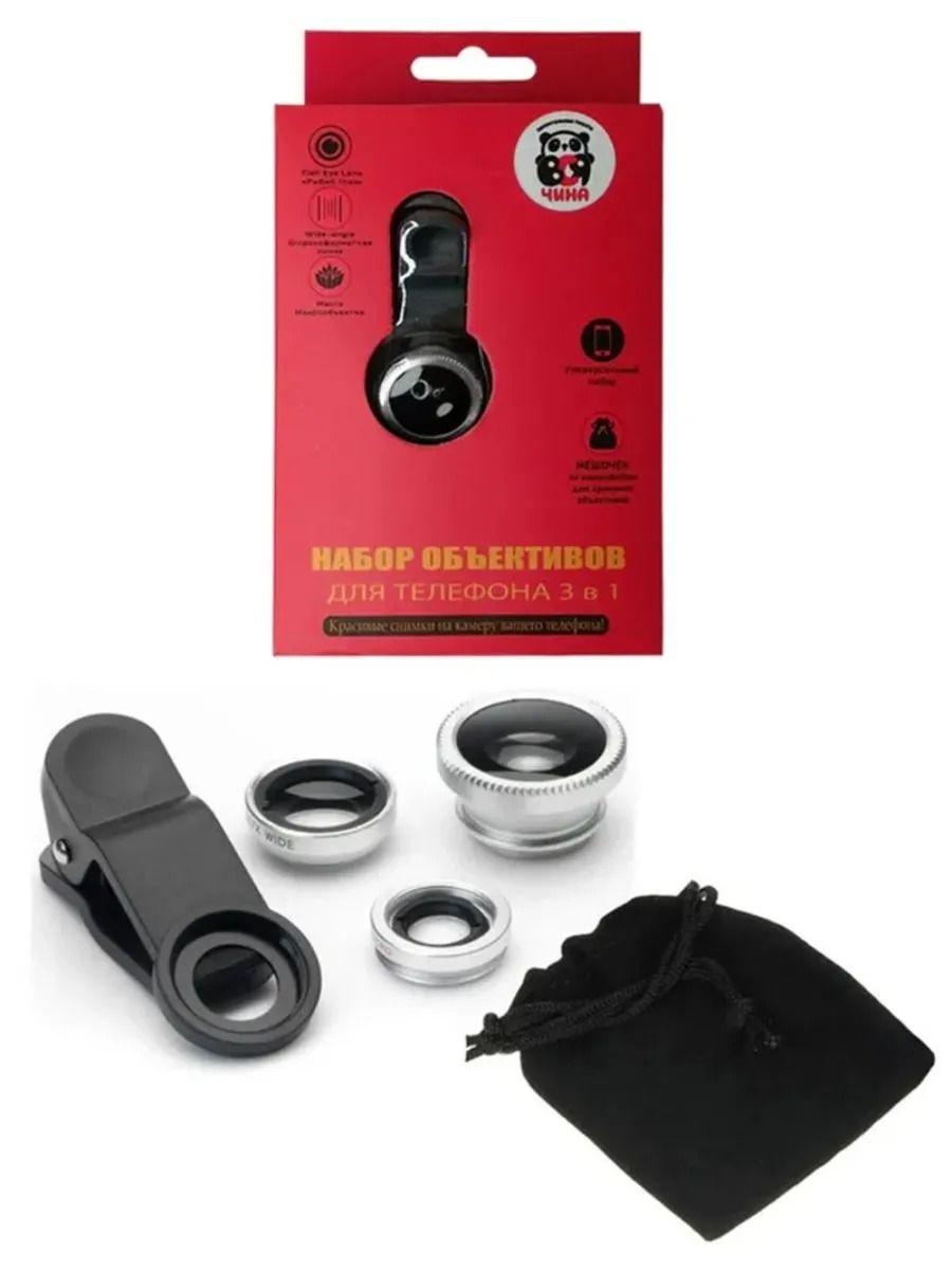 Набор объективов для телефона 3 в 1 на прищепке, цвет ободка объективов ри. Линзы подходят для телефонов и планшетов.В наборе три объектива, 2 защитные крышки, универсальный зажим к телефону в виде прищепки, мешочек для хранения. Объективы к зажиму крепятся с помощью резьбы.Предназначение объективов. Первая линза Wide Angle Lens это широкоугольный объектив, предназначена для широкоформатной съемки с телефона, имеет поле зрения в 140 градусов (0.67Х). Вторая линза Fish Eye объектив Рыбий глаз, угол изображения которого близок к 180 градусам в зависимости от модели телефона. Третья линза это макро объектив, позволяет снимать мелкие предметы, предназначен для макросъемки с расстояния от 1,5 до 2,2 см, позволяет использовать телефон в качестве лупы. Внимание. Широкоформатный объектив используется только совместно с макрообъективом, при откручивании верхней широкоугольной линзы объектив превращается в 10х макрообъектив. Цвет ободка объективов приходит случайным образом.