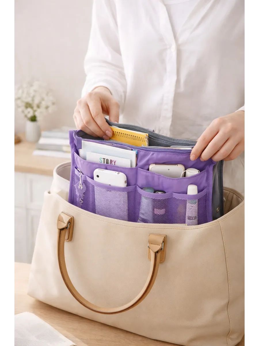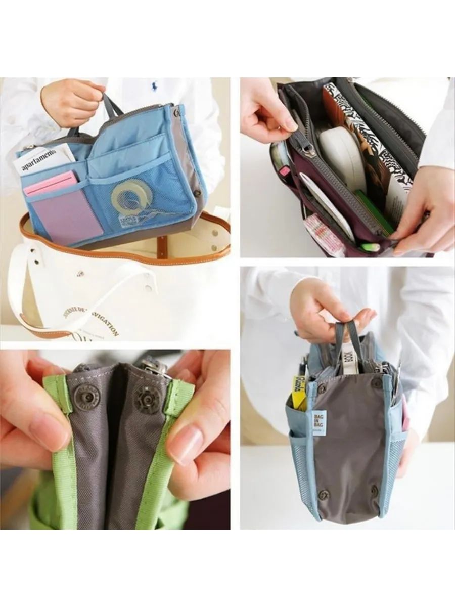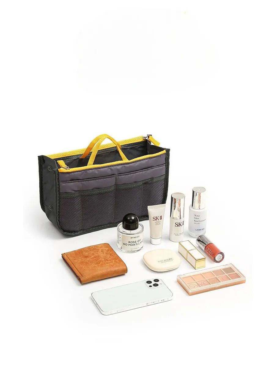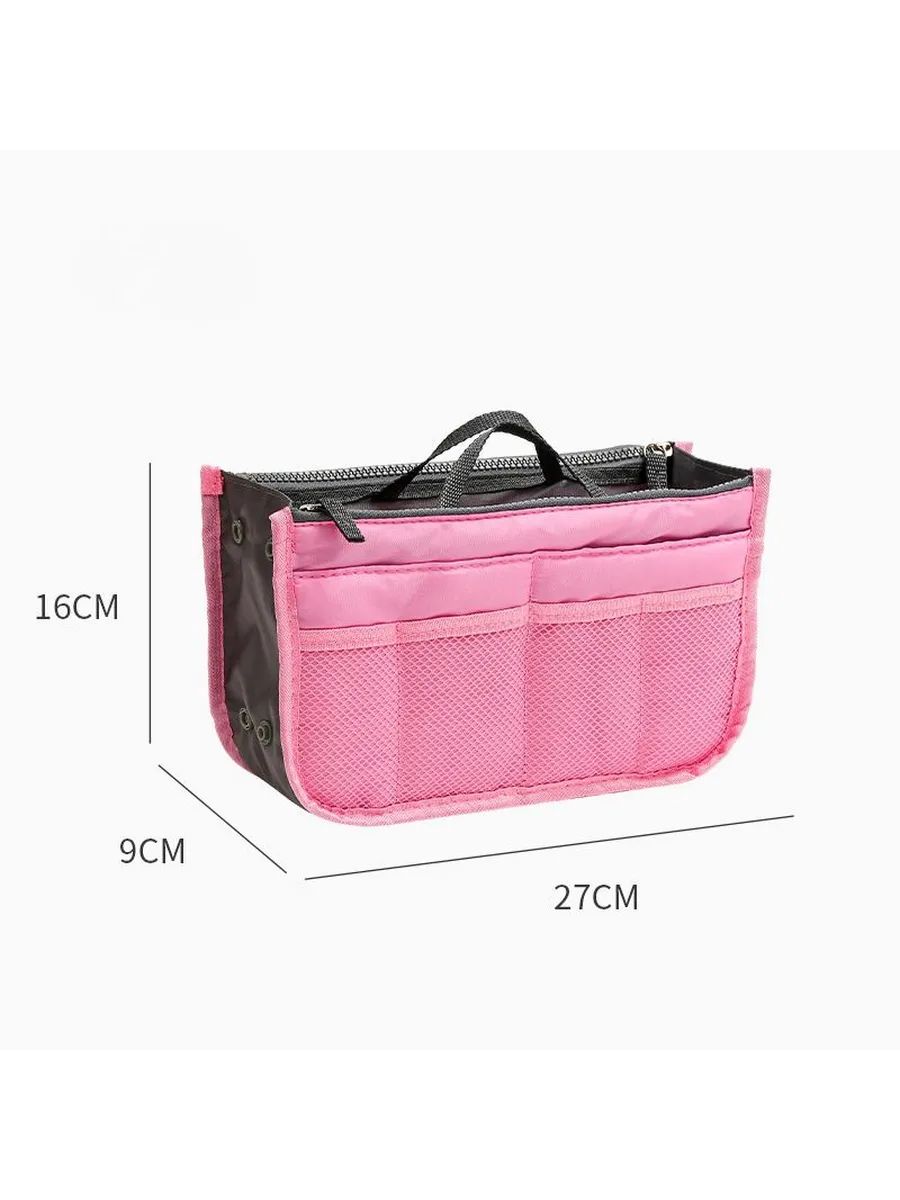 Органайзер для сумки из прочного полиэстера обеспечивает порядок и удобство хранения вещей. Подходит для сумок среднего и большого размера — от шопперов до офисных портфелей и рюкзаков. Имеет одно большое отделение, два кармана на молнии, два открытых кармана и четыре сетчатых кармана снаружи. Текстильная вставка с непромокаемым покрытием сохраняет форму и выдерживает нагрузки. Регулируемая толщина за счет кнопок, удобные ручки для переноски. Можно использовать как самостоятельную дорожную сумочку или косметичку. Подходит для косметики, документов, аксессуаров, средств гигиены, зарядных устройств и других мелочей. Размеры: 27 см × 17 см × 8 см.