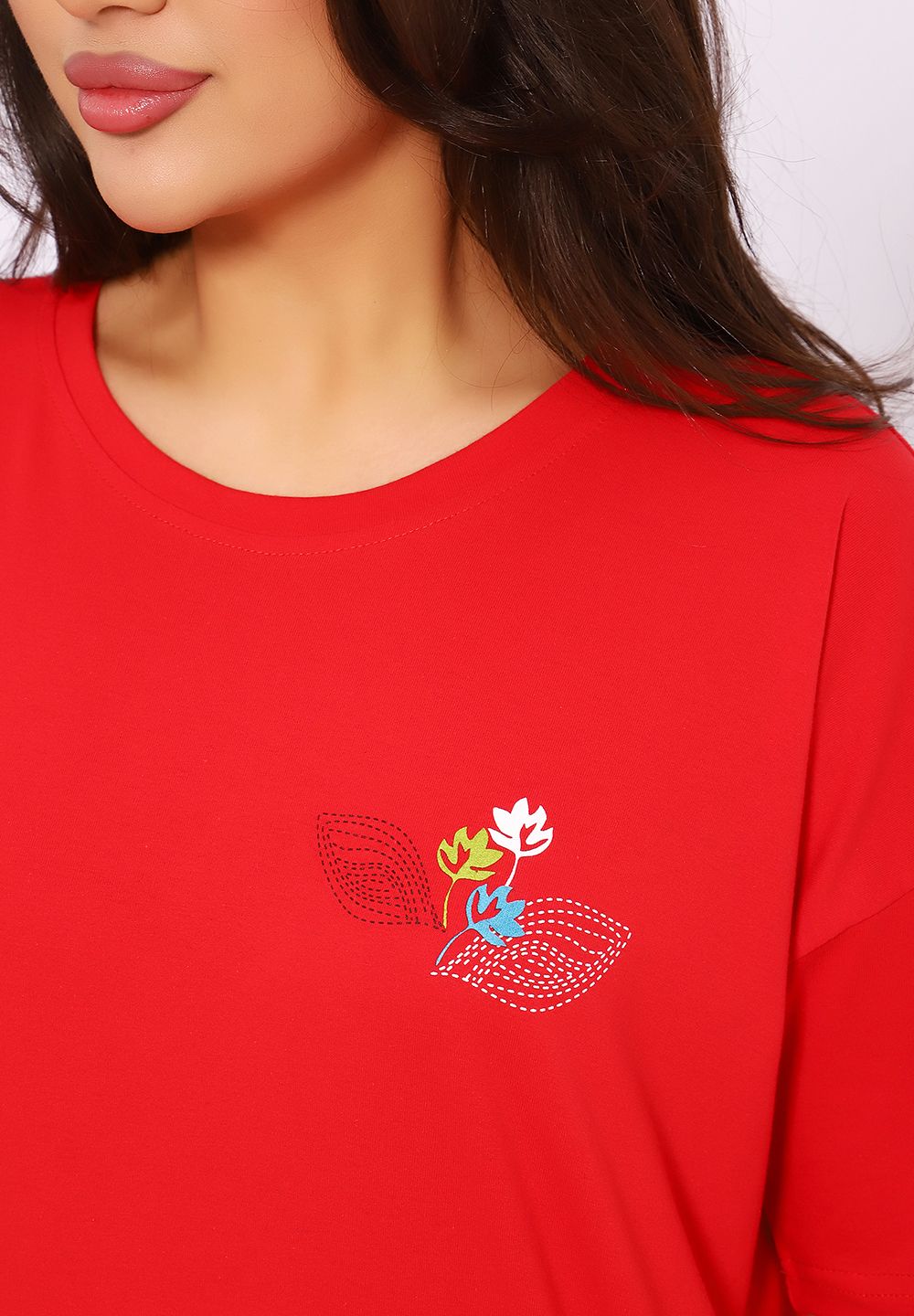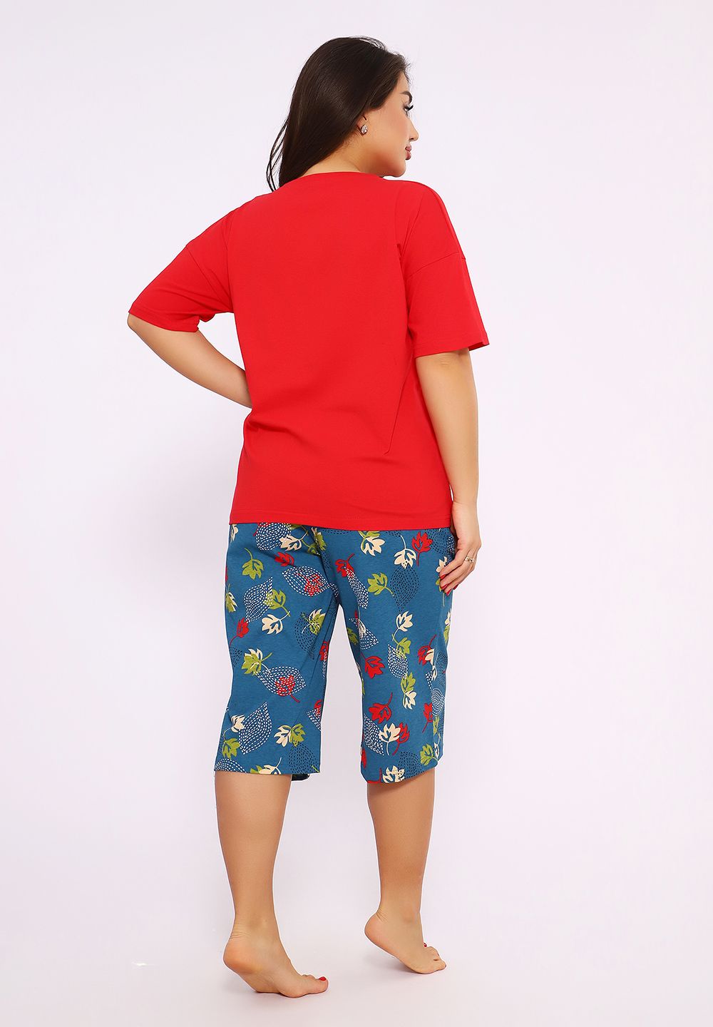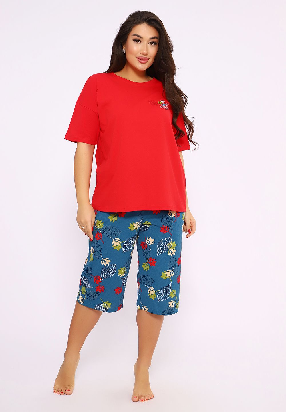 Дизайн: Футболка однотонная с декорацией. Бриджи свободного фасона из хлопка - с набивным рисунком.