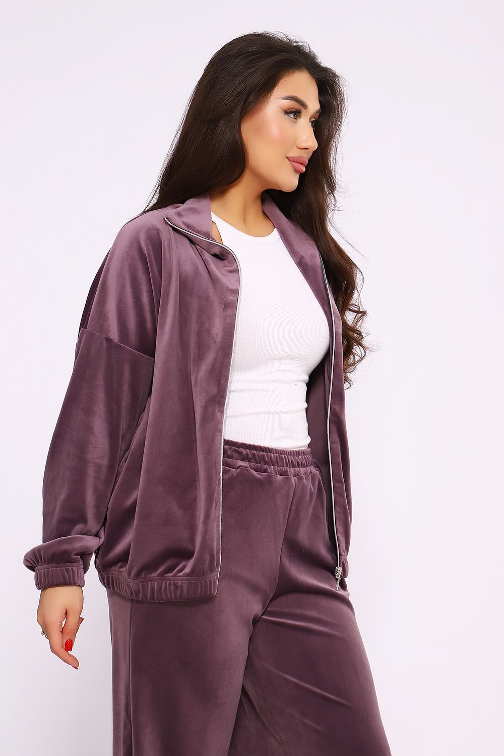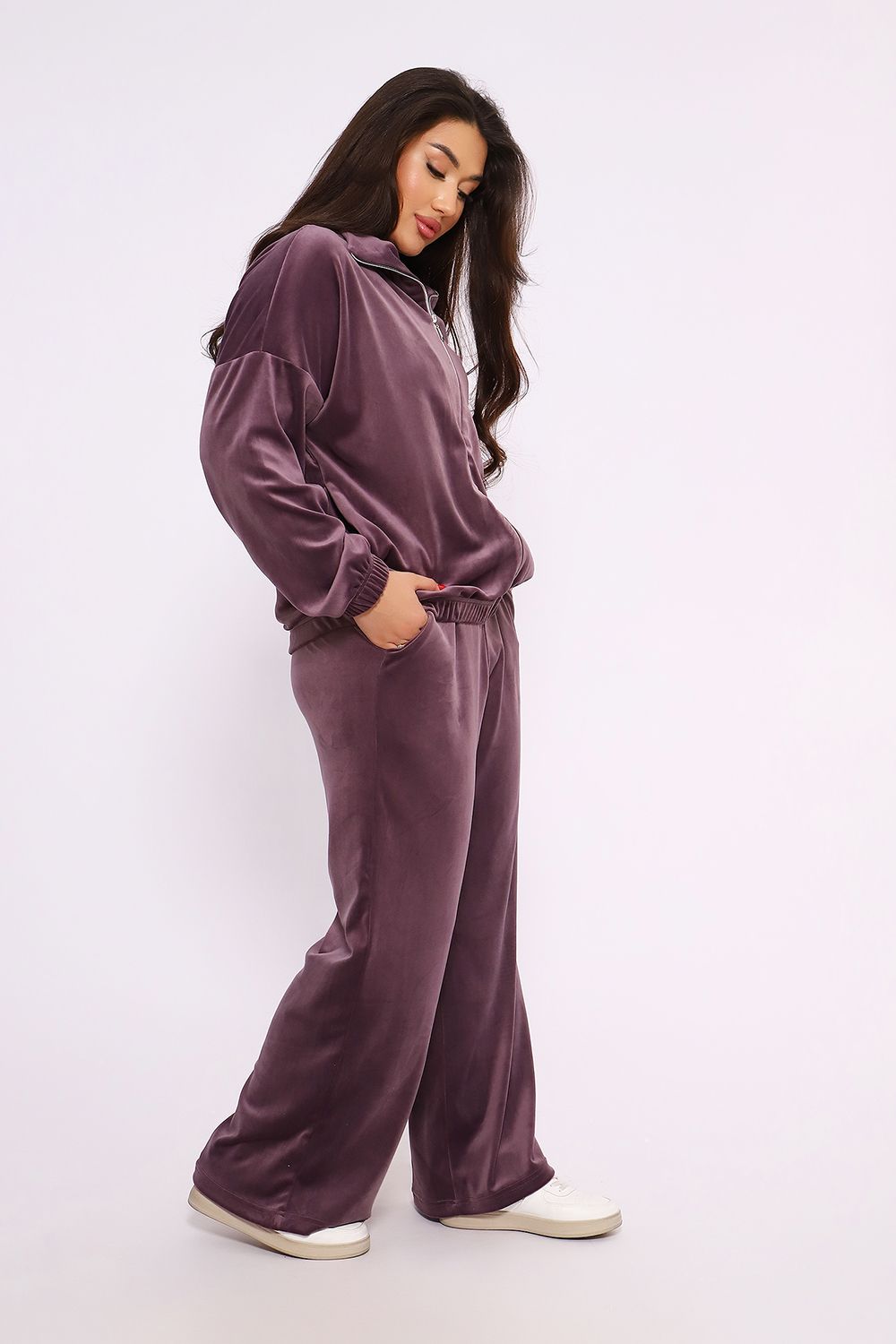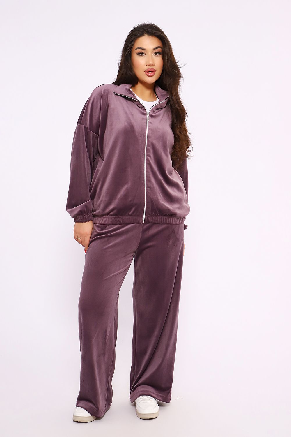 Этот велюровый прогулочный костюм — идеальное сочетание шика «нулевых» и современного комфорта. Мягкая фактура ткани с деликатным переливом делает образ дорогим и уютным одновременно.