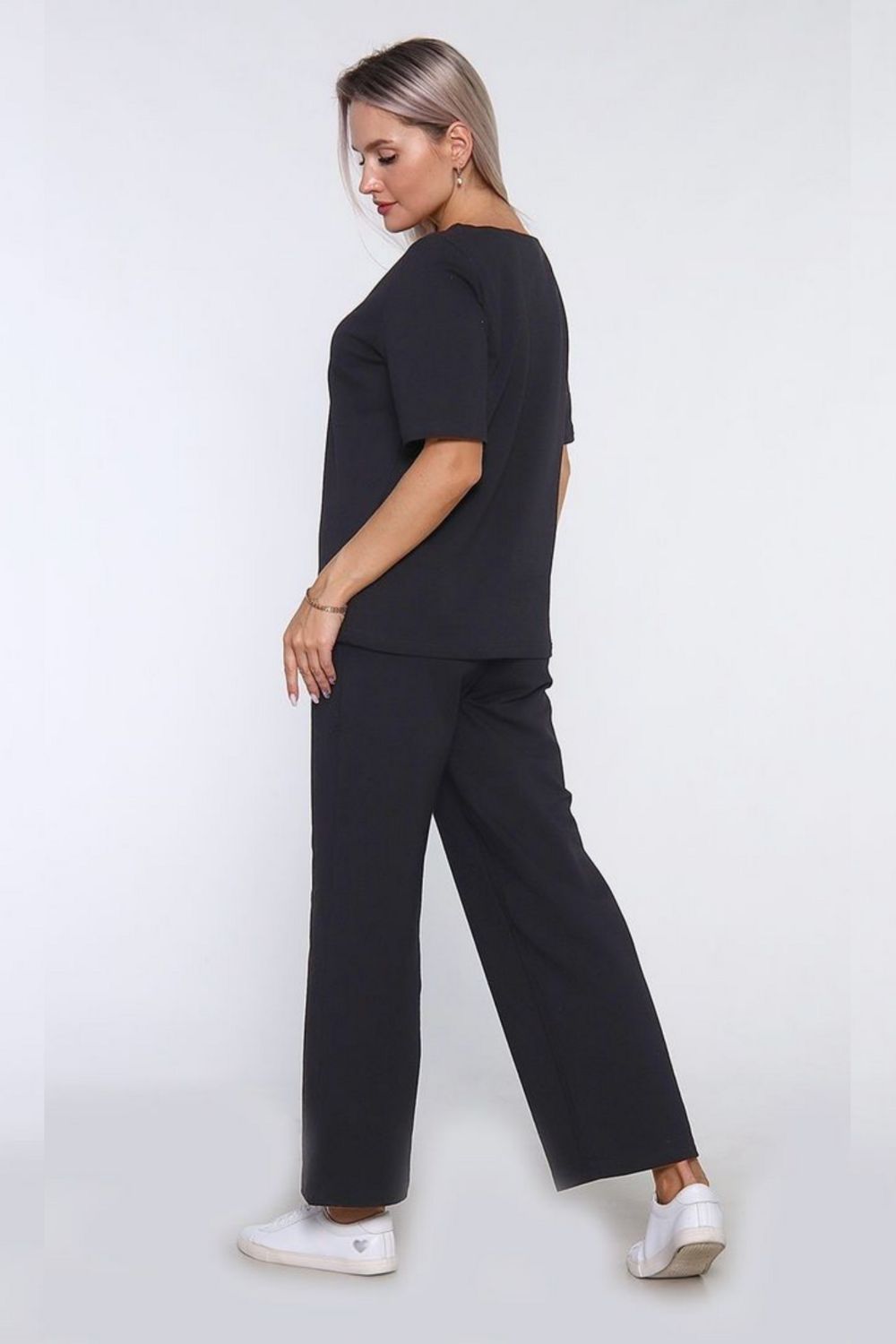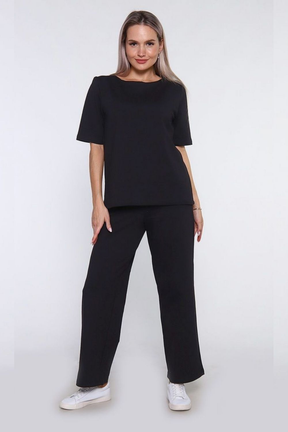 Состав комплекта: Свободная футболка с коротким рукавом и круглым вырезом, а также прямые брюки.