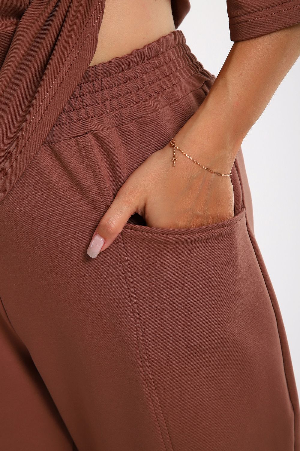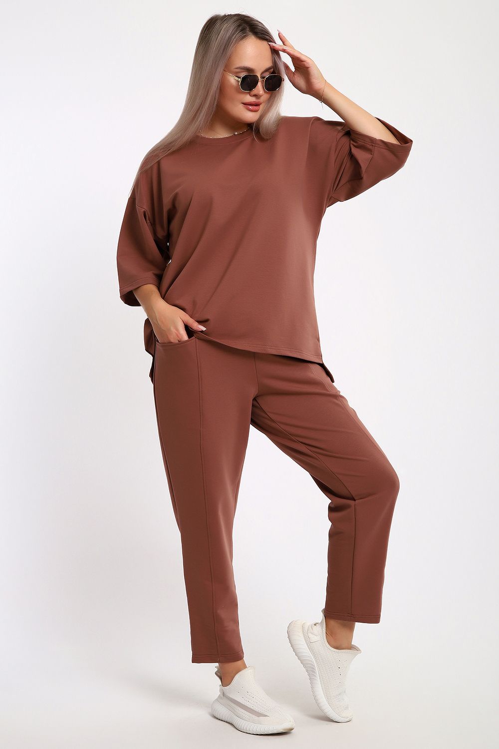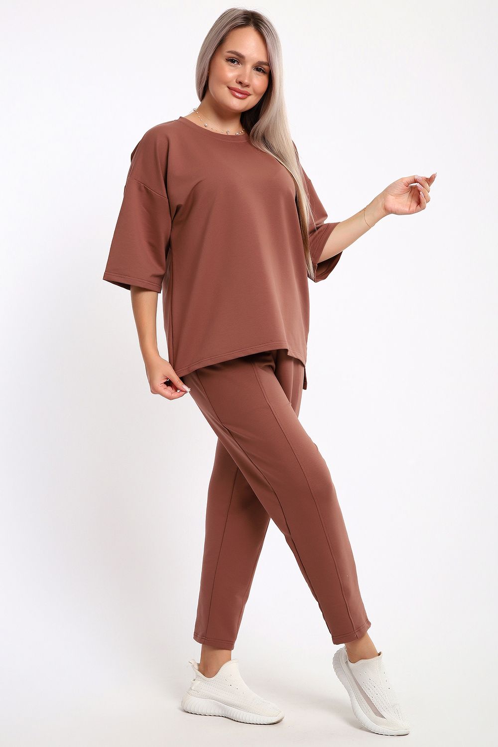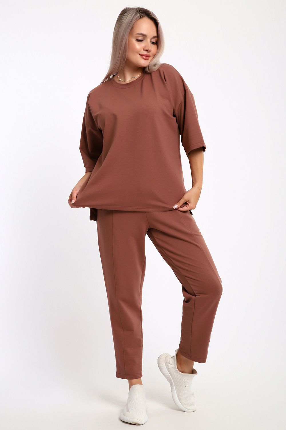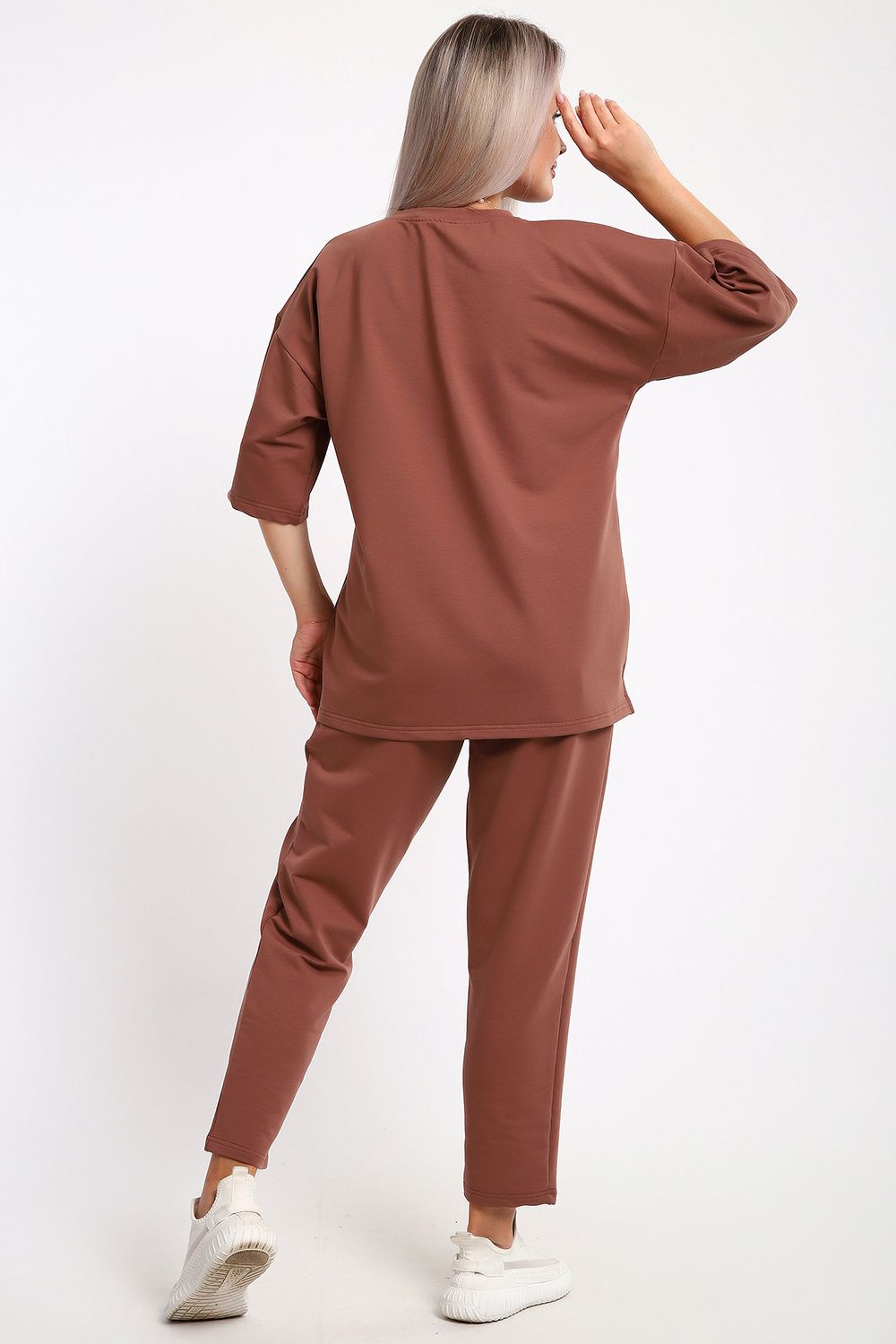 Этот женский костюм в благородном шоколадном оттенке — идеальное сочетание комфорта и современного стиля. Благодаря продуманному составу ткани и свободному крою, он станет незаменимой базой для повседневного гардероба.