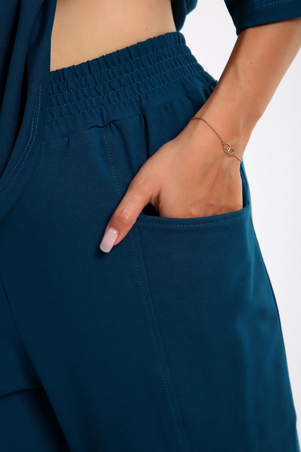 Пояс: Эластичная резинка мягко фиксирует брюки на талии, не вызывая дискомфорта при длительной носке