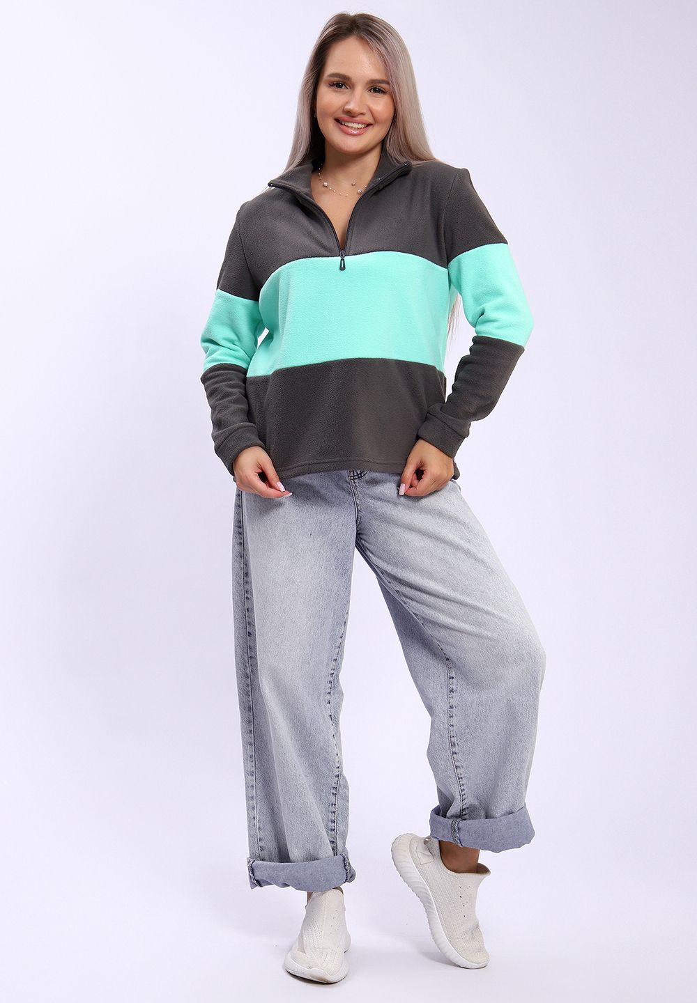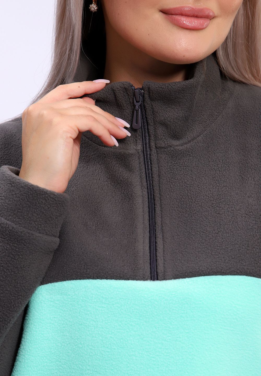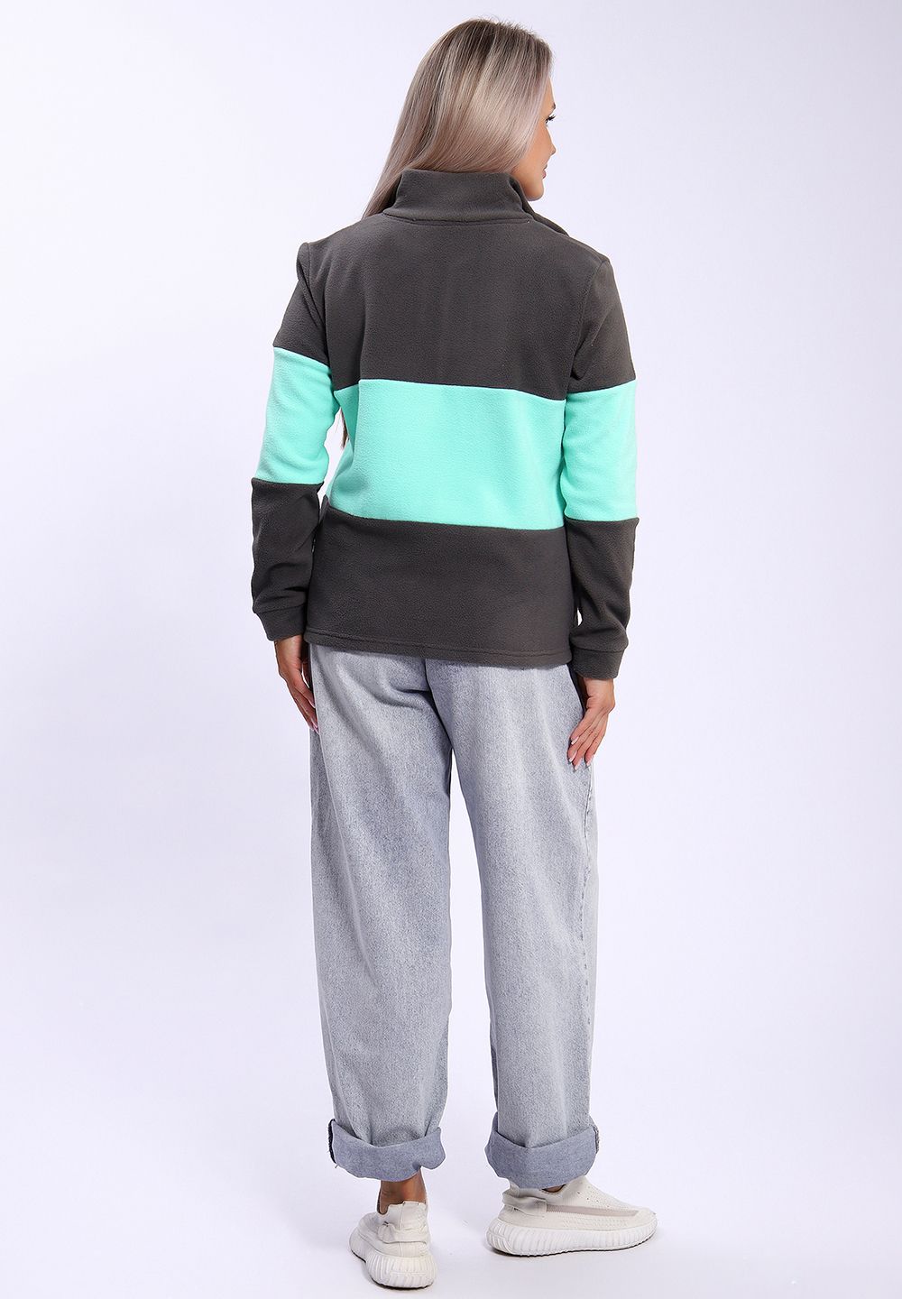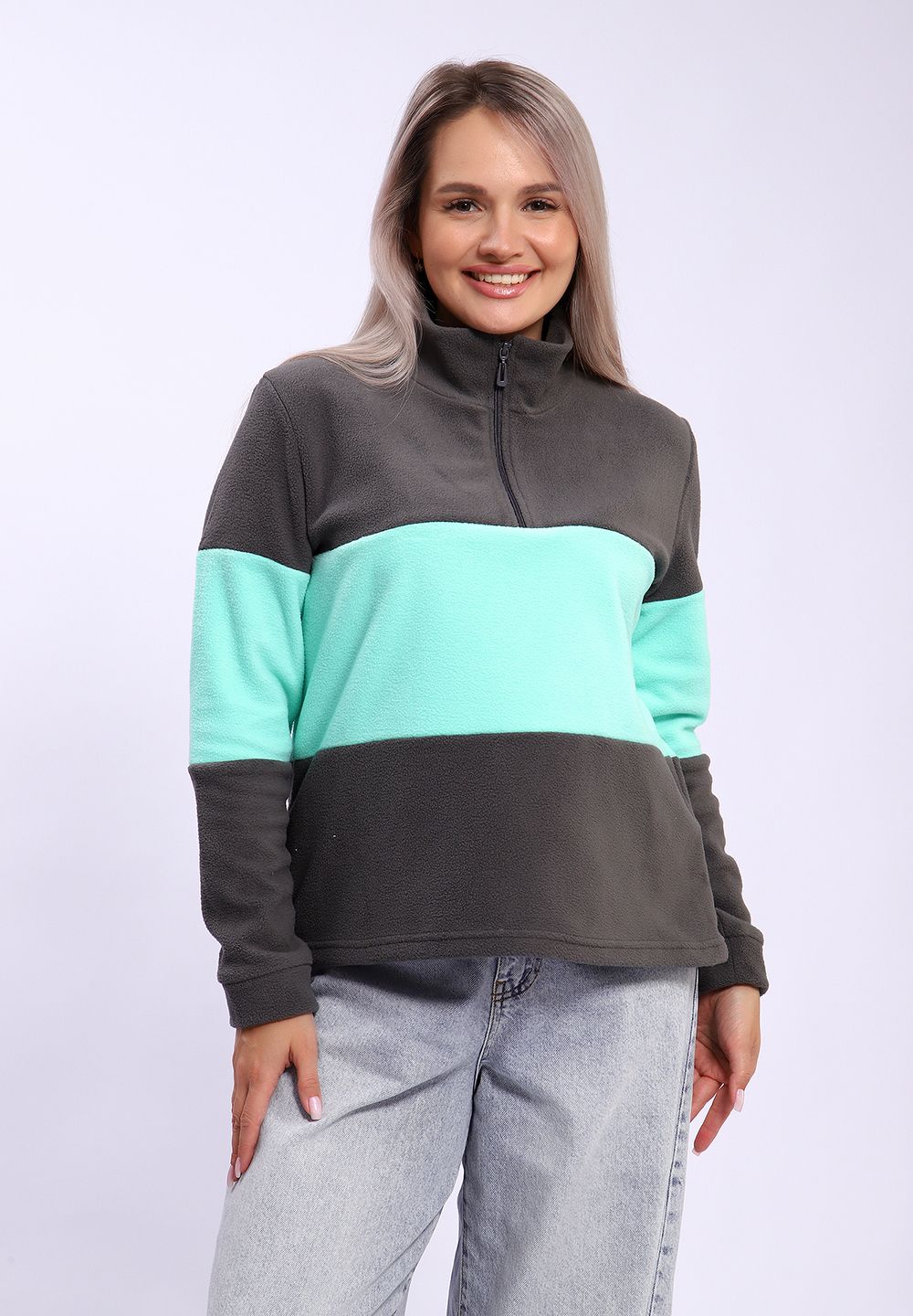 654 Толстовка флис Колор-блок - серый+ментол