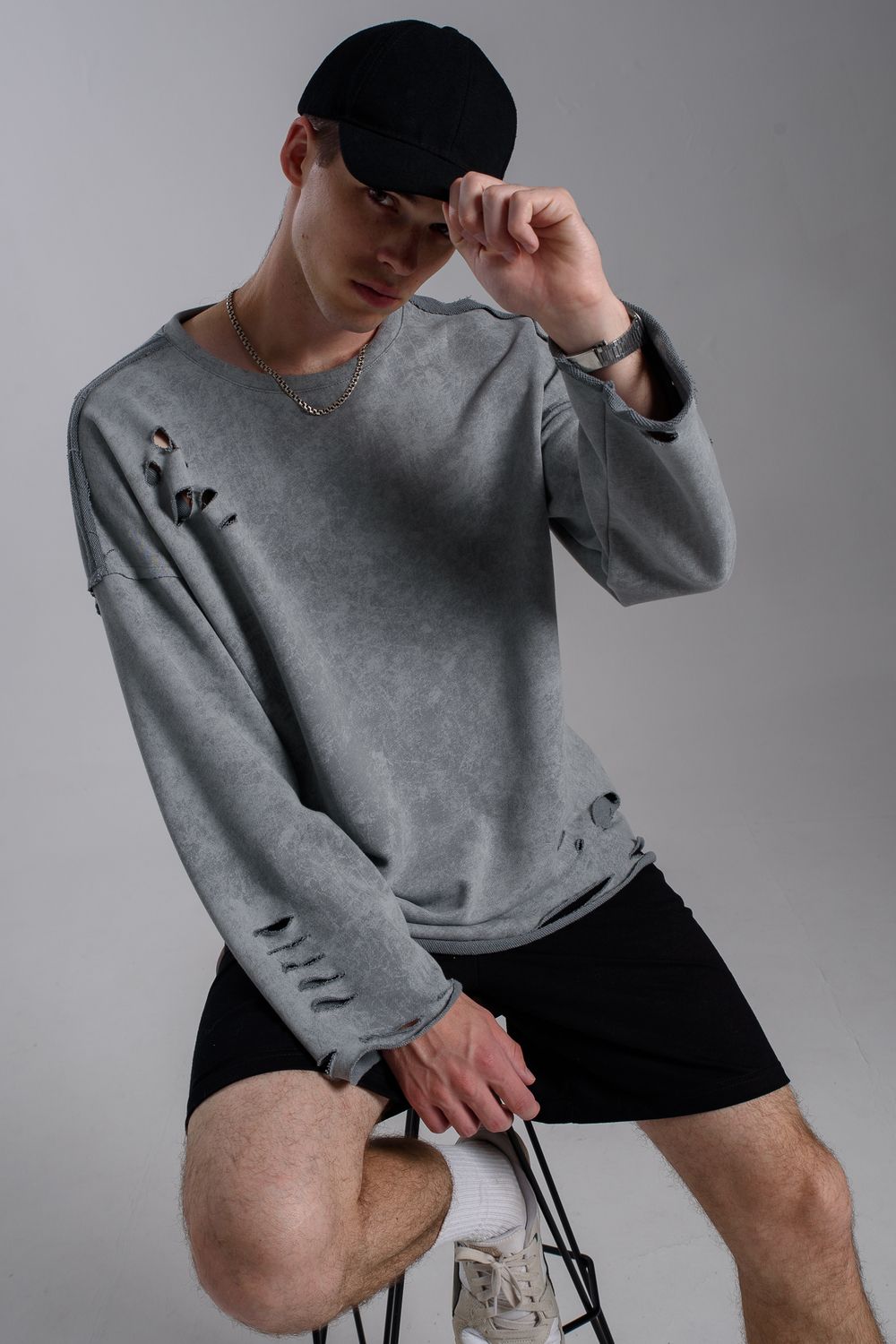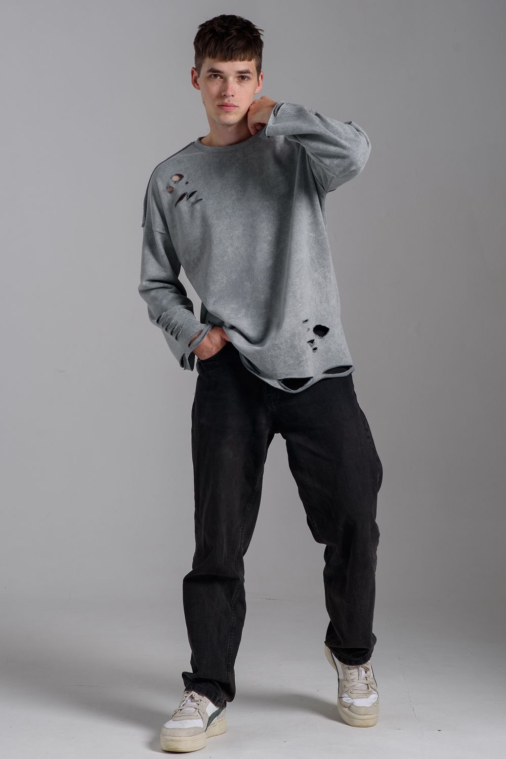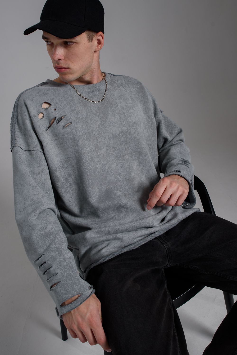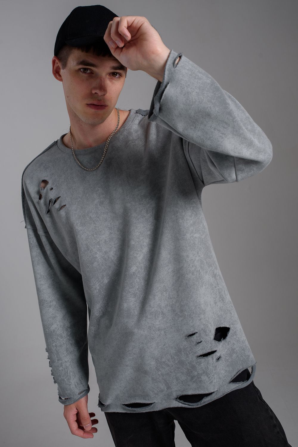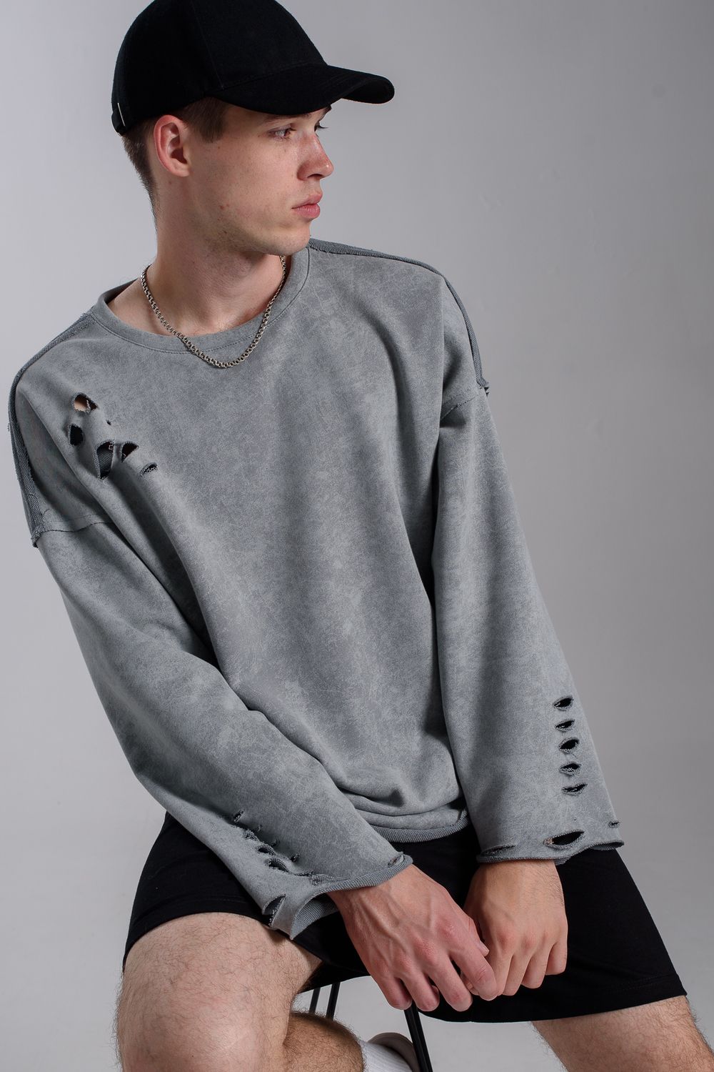 Стильный мужской свитшот в современном дизайне станет отличным дополнением к вашему гардеробу. Изготовлен из мягкого трикотажа, обеспечивает комфорт и тепло прохладными летними вечерами и осенью. Отличается характерной рваной текстурой, что придает ему необычный и оригинальный вид. Легко сочетать с другими элементами одежды. Конструкция рваного свитшота с широкими спущенными плечами и свободным кроем создает расслабленный оверсайз силуэт, что идеально подходит для кэжуал образов. Вырез горловины выполнен в классическом стиле, добавляя простоты и элегантности. Детали дизайна включают в себя необычные прорези, которые подчеркивают гранжевую эстетику. Прекрасно подойдет как для мужчин, так и для женщин, благодаря своему унисекс крою. Также будет уместен в молодежной моде и станет отличным вариантом для создания парных образов.