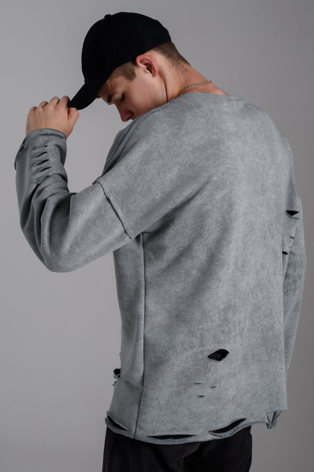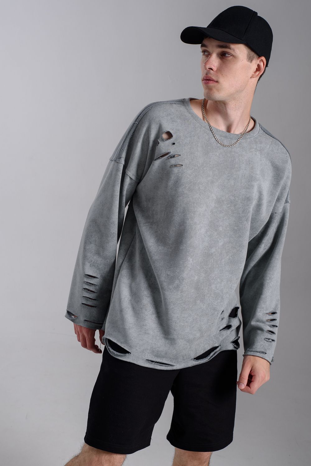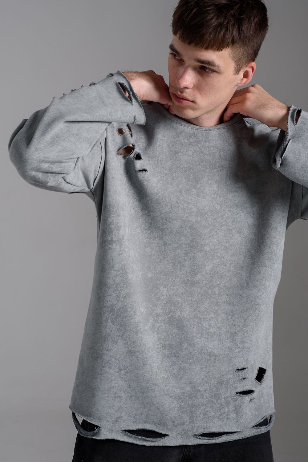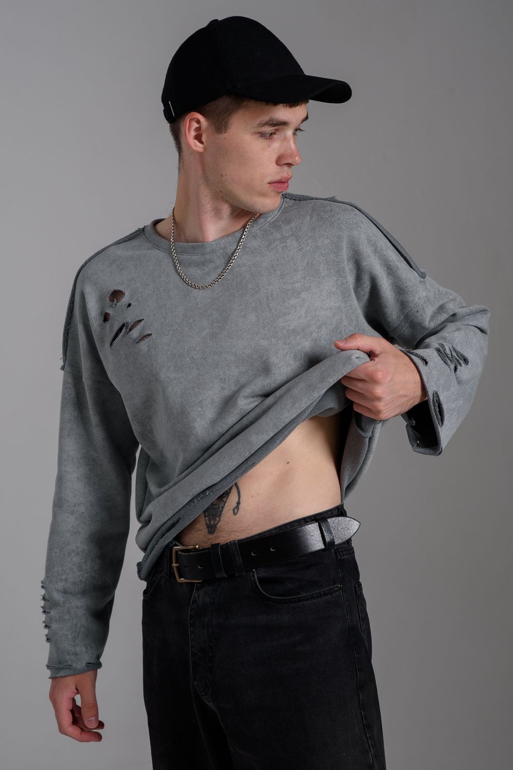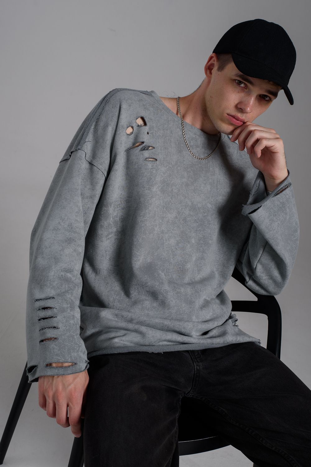 Стильный мужской свитшот в современном дизайне станет отличным дополнением к вашему гардеробу. Изготовлен из мягкого трикотажа, обеспечивает комфорт и тепло прохладными летними вечерами и осенью. Отличается характерной рваной текстурой, что придает ему необычный и оригинальный вид. Легко сочетать с другими элементами одежды. Конструкция рваного свитшота с широкими спущенными плечами и свободным кроем создает расслабленный оверсайз силуэт, что идеально подходит для кэжуал образов. Вырез горловины выполнен в классическом стиле, добавляя простоты и элегантности. Детали дизайна включают в себя необычные прорези, которые подчеркивают гранжевую эстетику. Прекрасно подойдет как для мужчин, так и для женщин, благодаря своему унисекс крою. Также будет уместен в молодежной моде и станет отличным вариантом для создания парных образов.