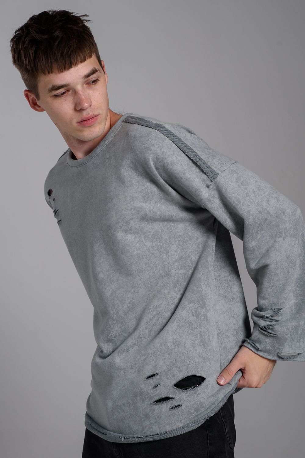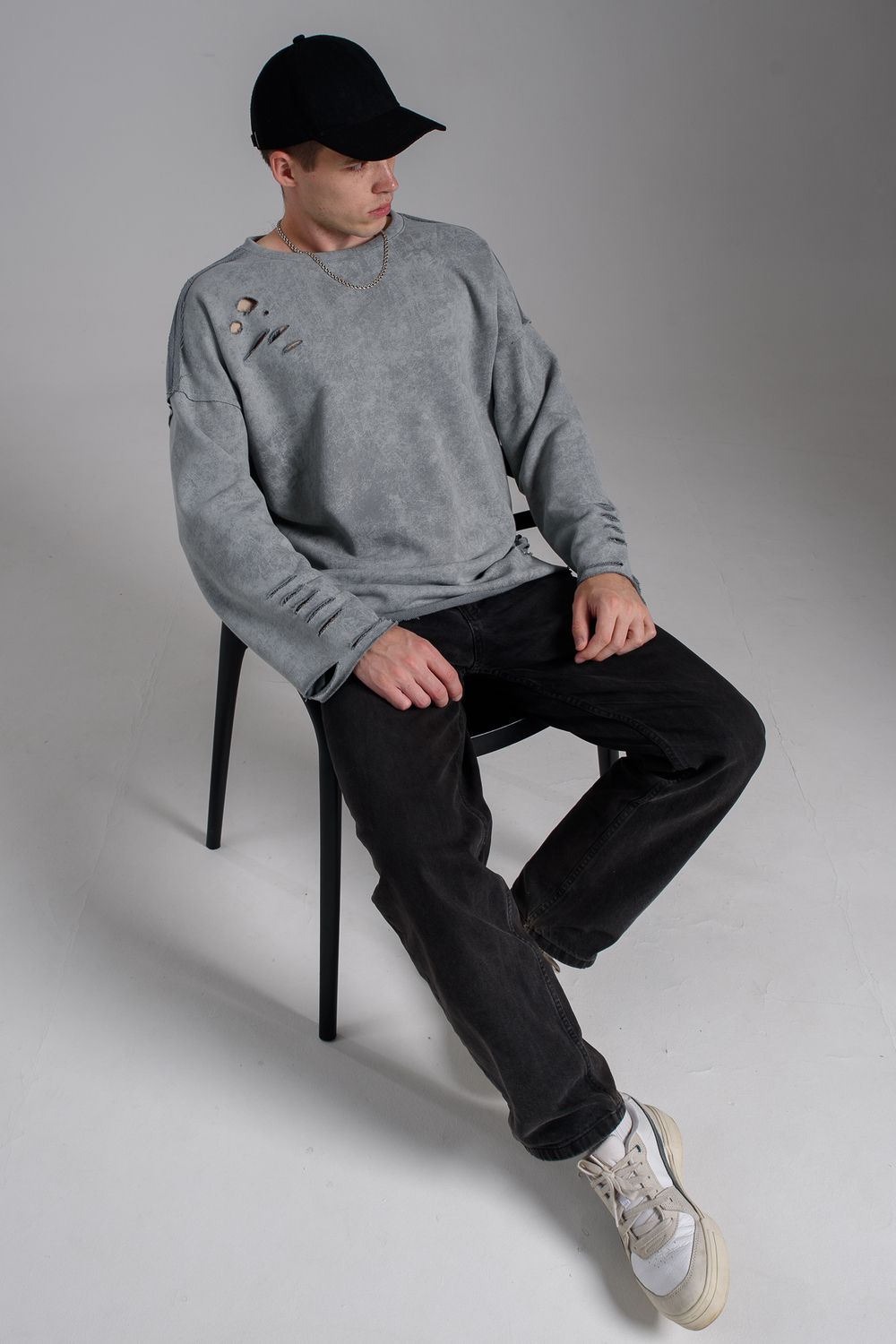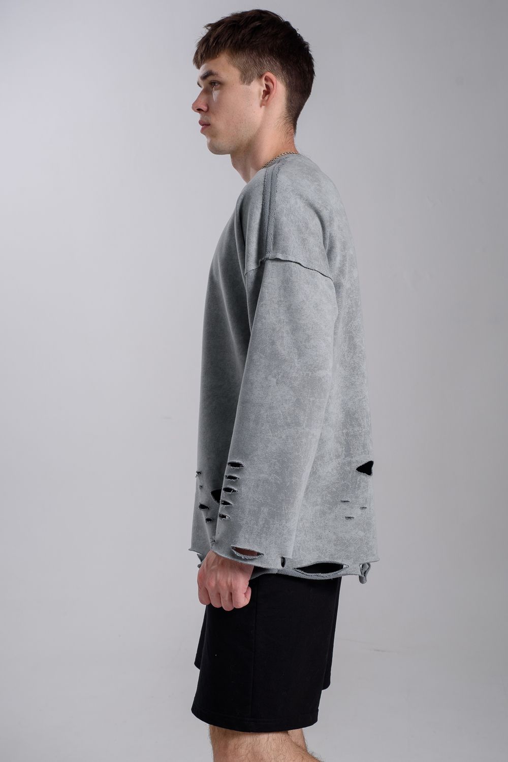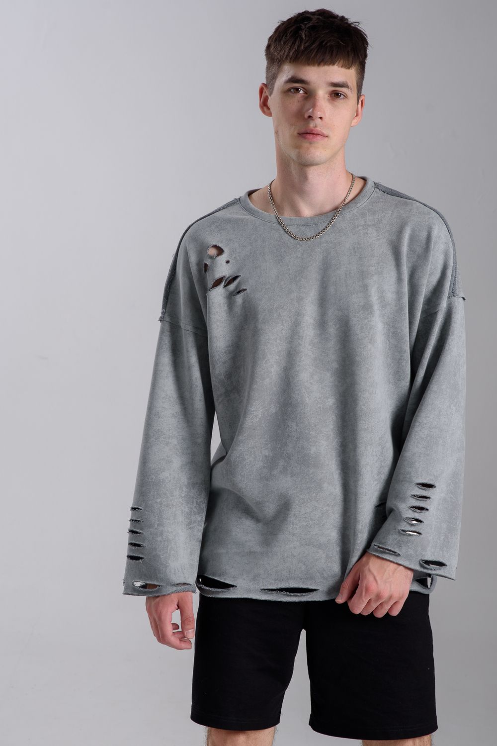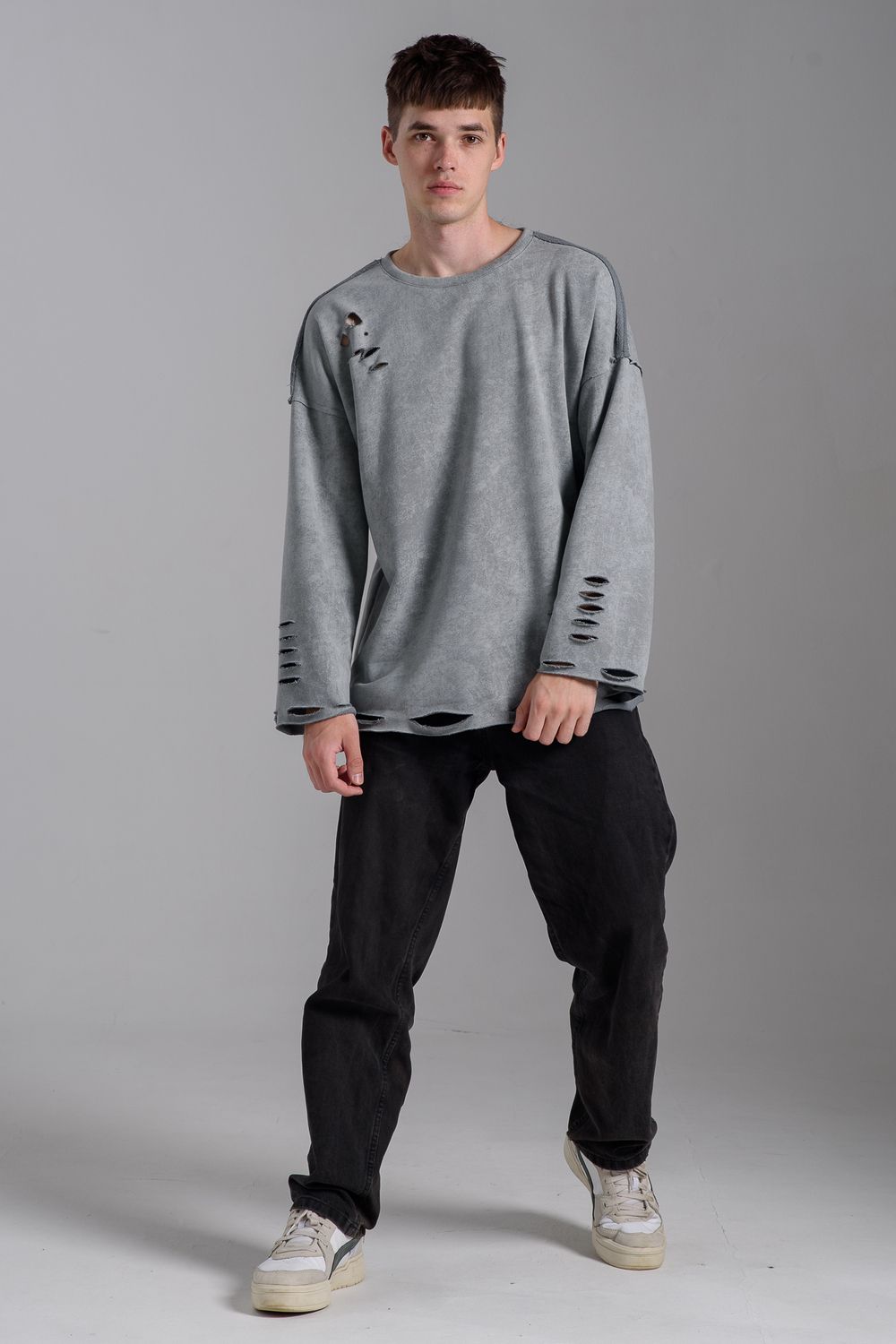Стильный мужской свитшот в современном дизайне станет отличным дополнением к вашему гардеробу. Изготовлен из мягкого трикотажа, обеспечивает комфорт и тепло прохладными летними вечерами и осенью. Отличается характерной рваной текстурой, что придает ему необычный и оригинальный вид. Легко сочетать с другими элементами одежды. Конструкция рваного свитшота с широкими спущенными плечами и свободным кроем создает расслабленный оверсайз силуэт, что идеально подходит для кэжуал образов. Вырез горловины выполнен в классическом стиле, добавляя простоты и элегантности. Детали дизайна включают в себя необычные прорези, которые подчеркивают гранжевую эстетику. Прекрасно подойдет как для мужчин, так и для женщин, благодаря своему унисекс крою. Также будет уместен в молодежной моде и станет отличным вариантом для создания парных образов.