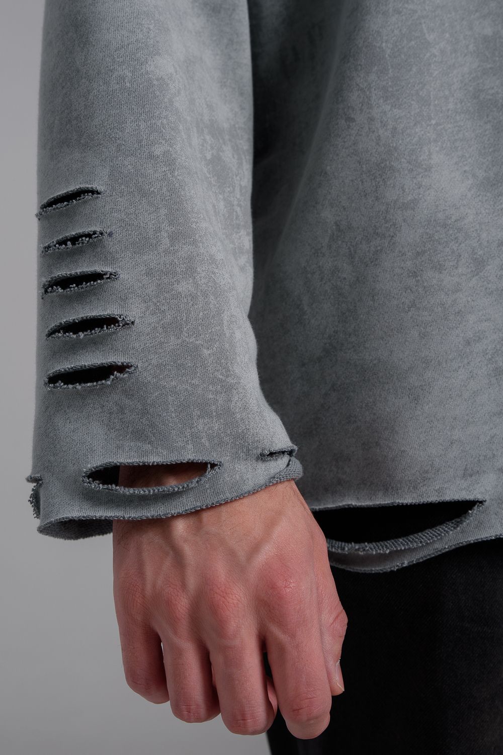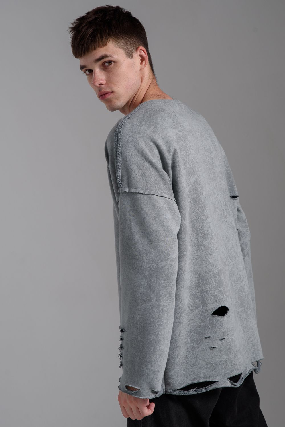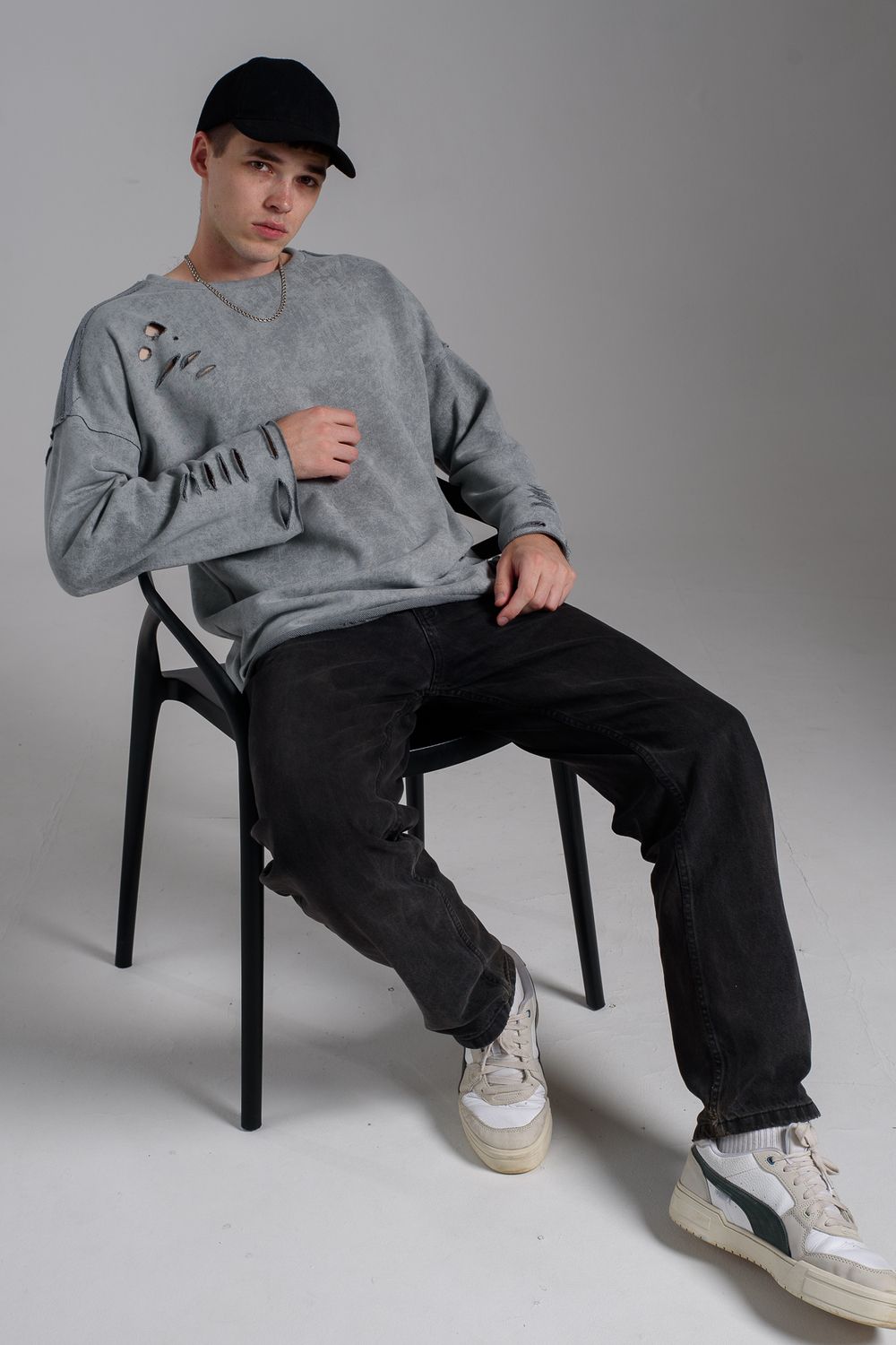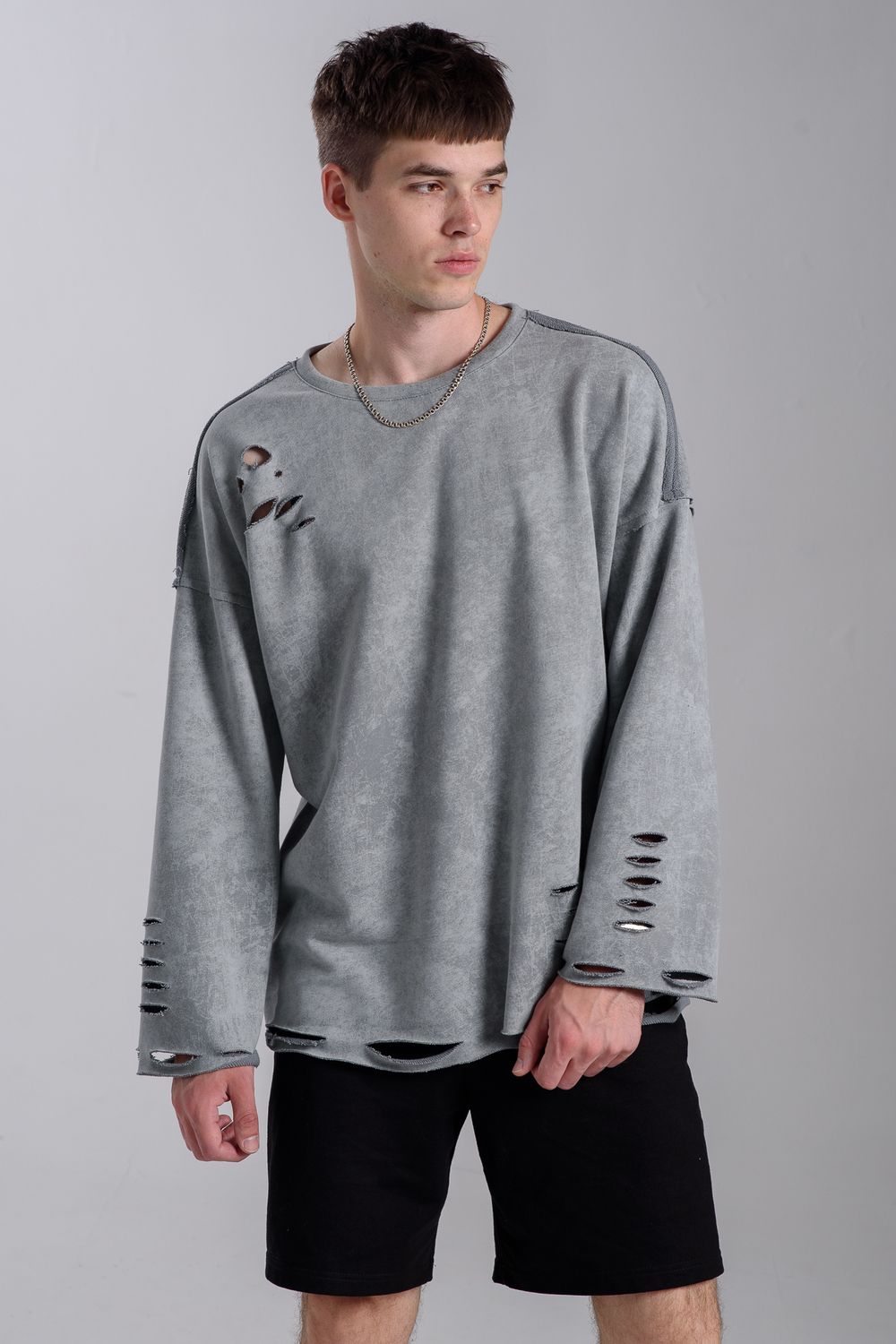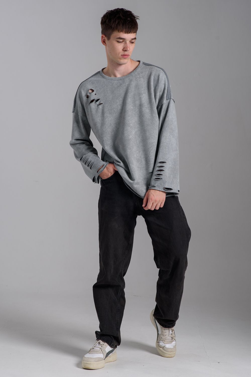 Стильный мужской свитшот в современном дизайне станет отличным дополнением к вашему гардеробу. Изготовлен из мягкого трикотажа, обеспечивает комфорт и тепло прохладными летними вечерами и осенью. Отличается характерной рваной текстурой, что придает ему необычный и оригинальный вид. Легко сочетать с другими элементами одежды. Конструкция рваного свитшота с широкими спущенными плечами и свободным кроем создает расслабленный оверсайз силуэт, что идеально подходит для кэжуал образов. Вырез горловины выполнен в классическом стиле, добавляя простоты и элегантности. Детали дизайна включают в себя необычные прорези, которые подчеркивают гранжевую эстетику. Прекрасно подойдет как для мужчин, так и для женщин, благодаря своему унисекс крою. Также будет уместен в молодежной моде и станет отличным вариантом для создания парных образов.
