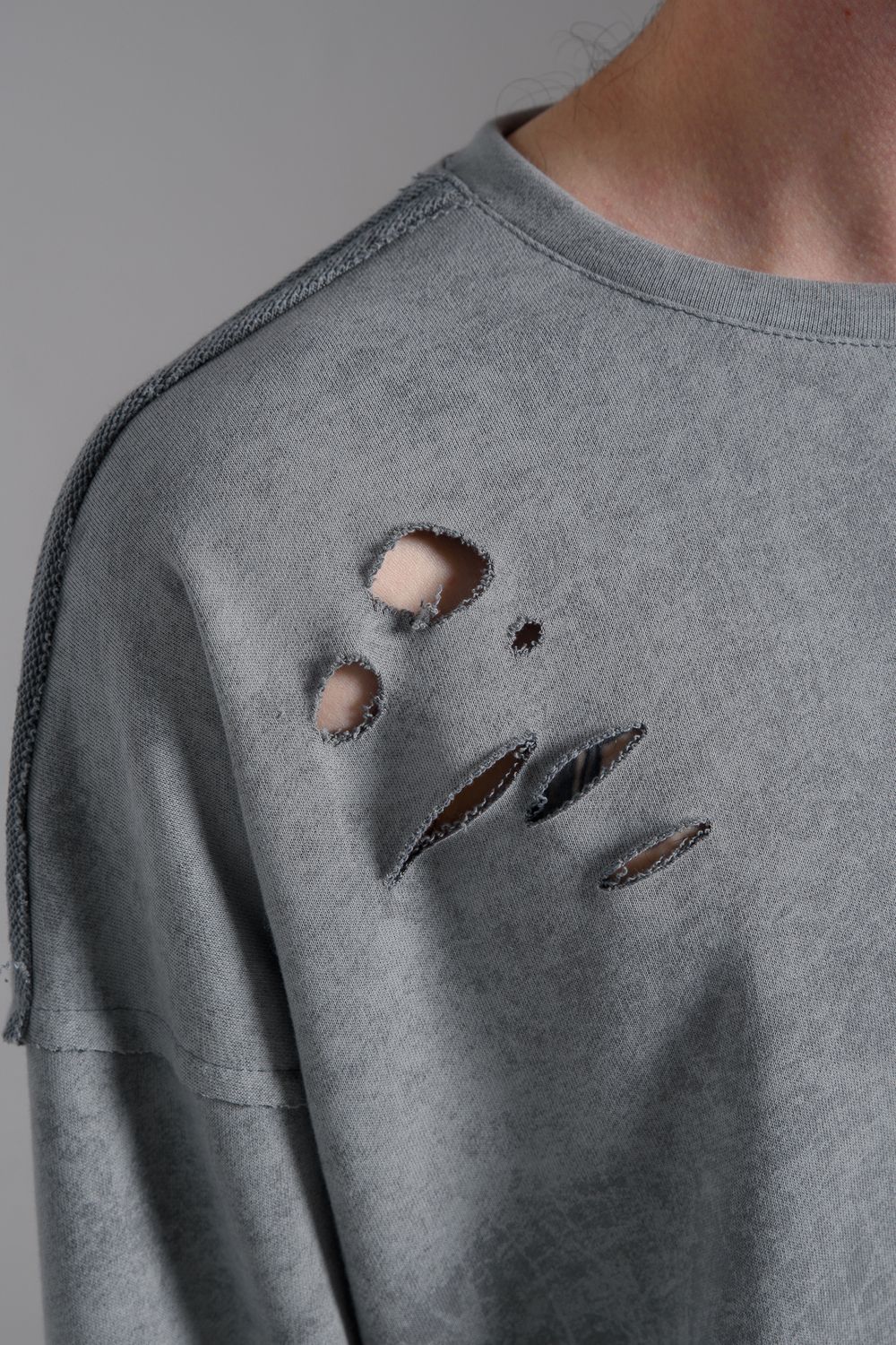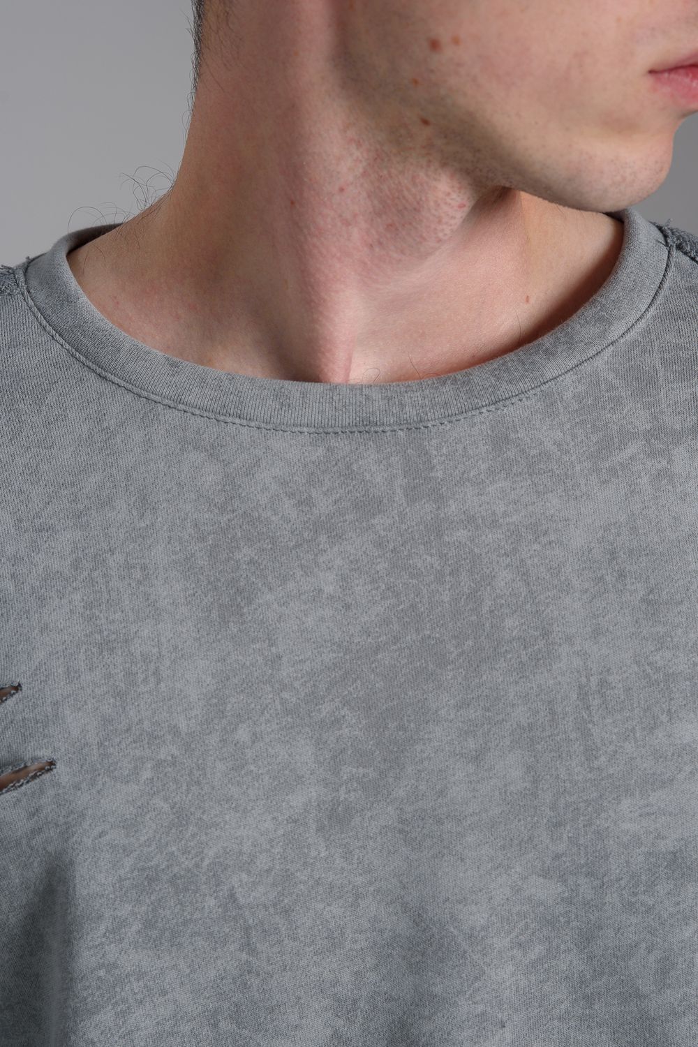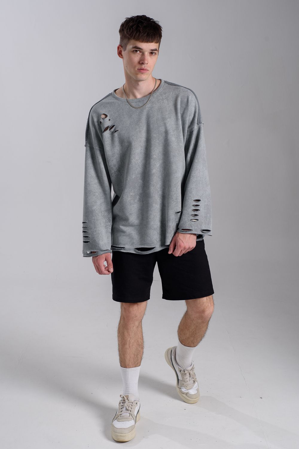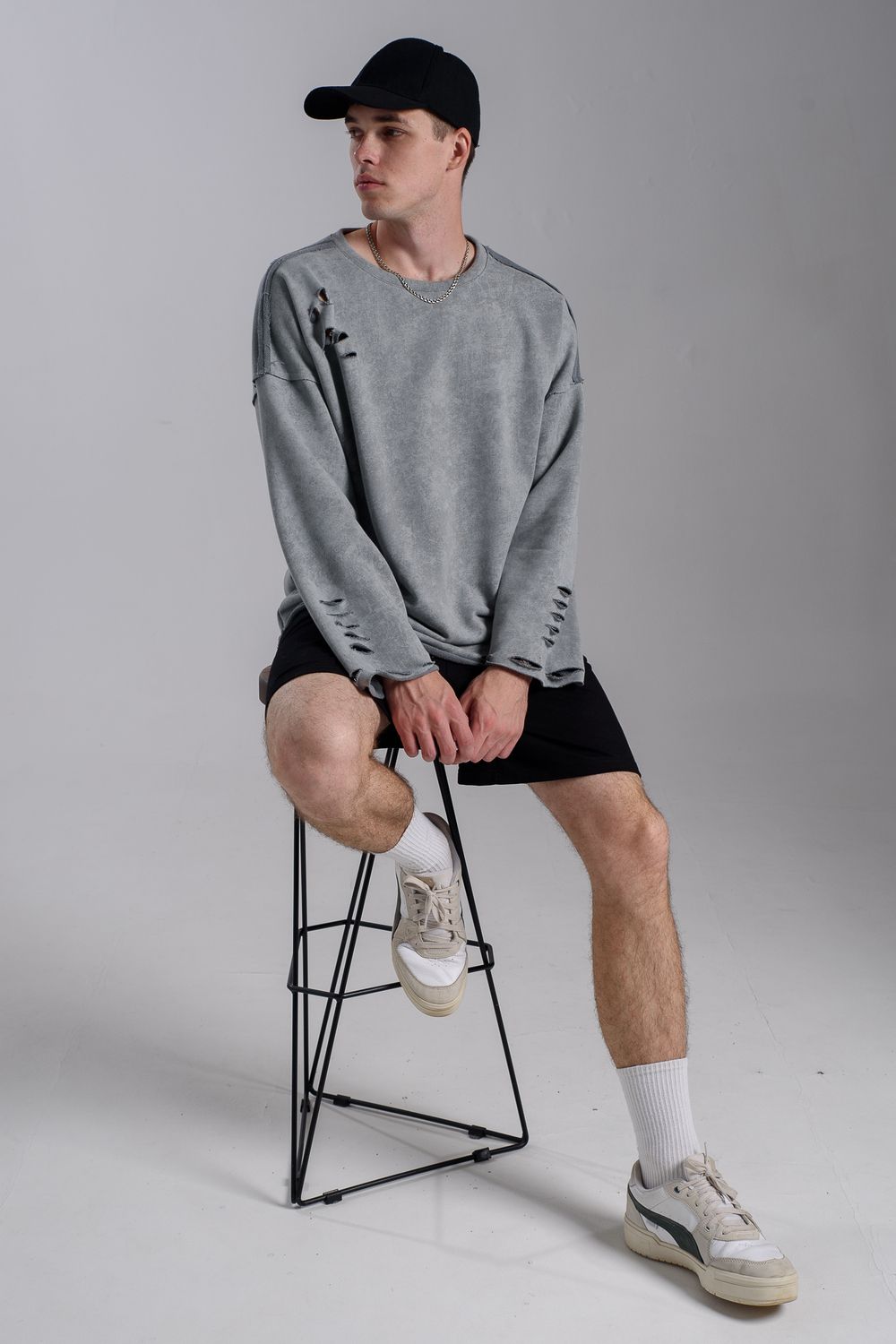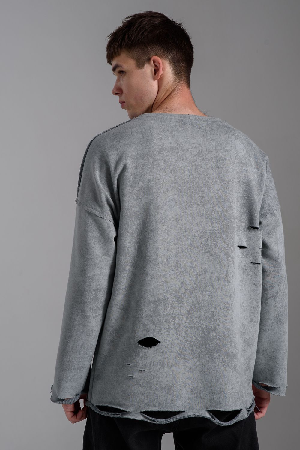 Стильный мужской свитшот в современном дизайне станет отличным дополнением к вашему гардеробу. Изготовлен из мягкого трикотажа, обеспечивает комфорт и тепло прохладными летними вечерами и осенью. Отличается характерной рваной текстурой, что придает ему необычный и оригинальный вид. Легко сочетать с другими элементами одежды. Конструкция рваного свитшота с широкими спущенными плечами и свободным кроем создает расслабленный оверсайз силуэт, что идеально подходит для кэжуал образов. Вырез горловины выполнен в классическом стиле, добавляя простоты и элегантности. Детали дизайна включают в себя необычные прорези, которые подчеркивают гранжевую эстетику. Прекрасно подойдет как для мужчин, так и для женщин, благодаря своему унисекс крою. Также будет уместен в молодежной моде и станет отличным вариантом для создания парных образов.