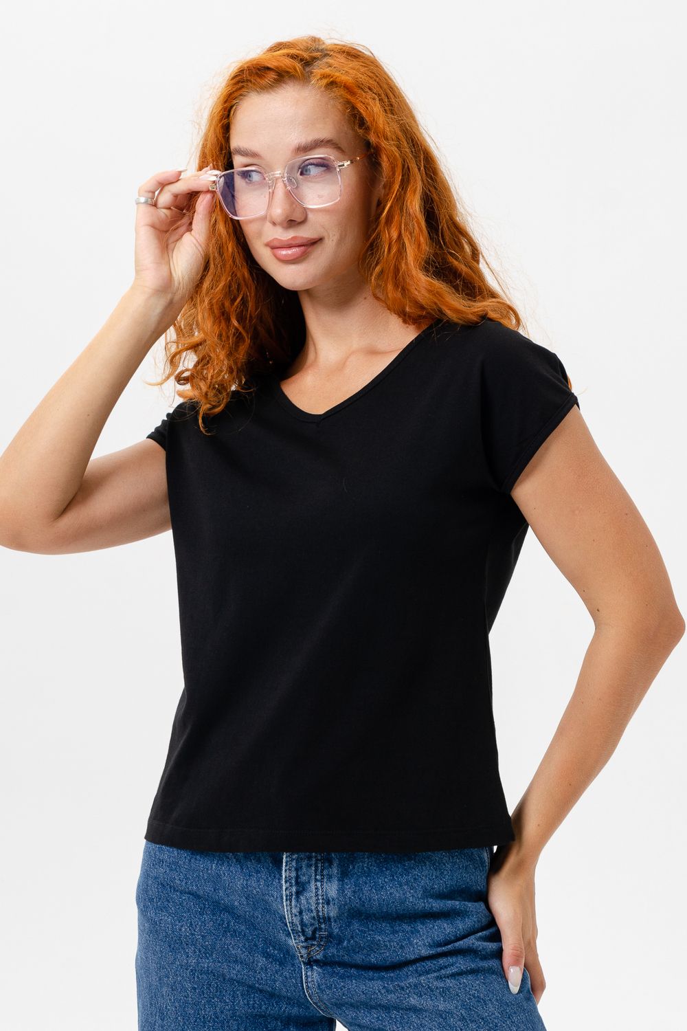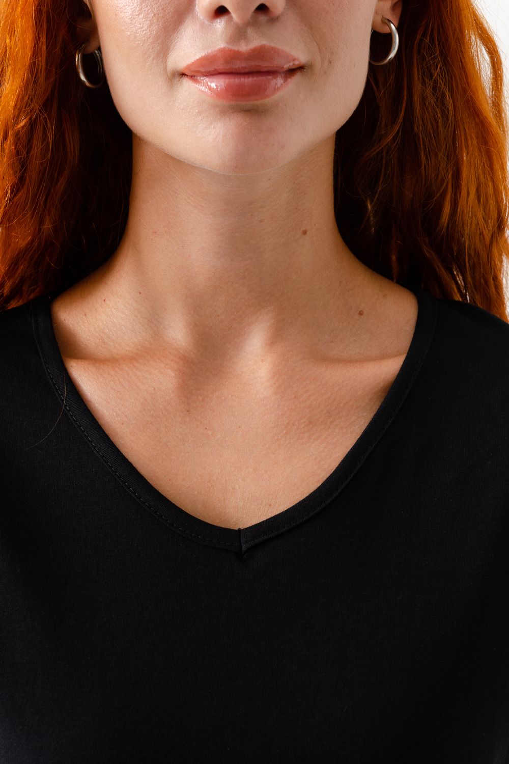 Футболка полуприлегающего силуэта, средней длины, с V-образной горловиной. Рукав цельнокроеный, короткий. Горловина и пройма обработаны бейкой из основного полотна.