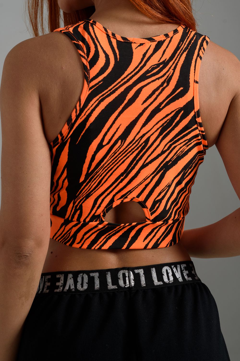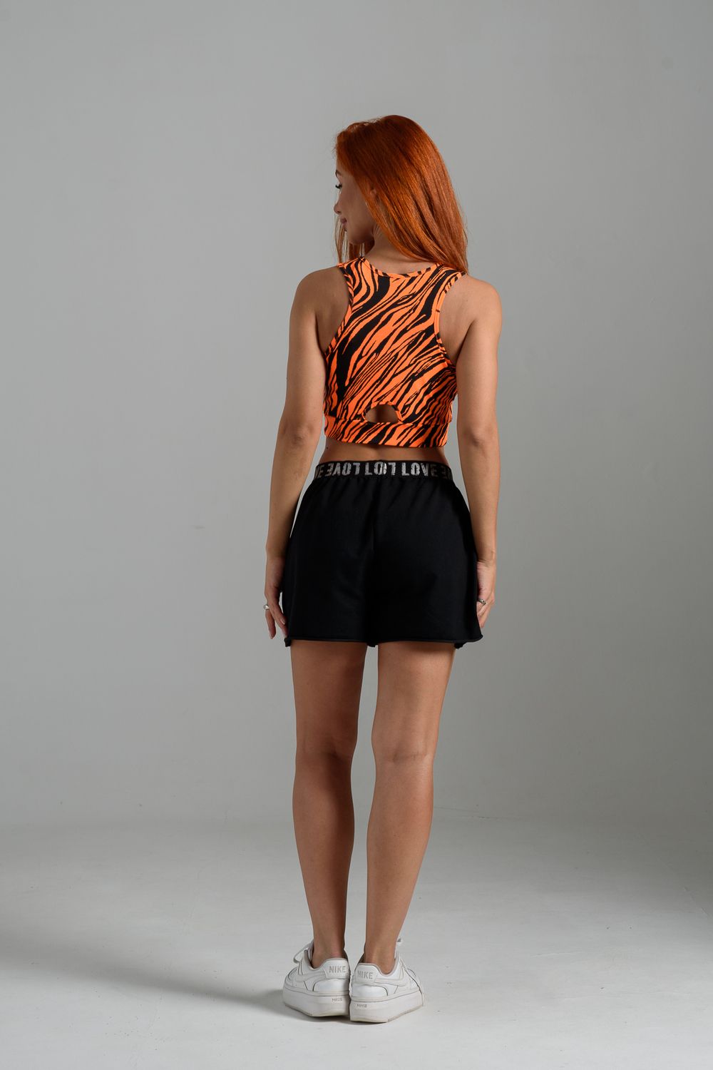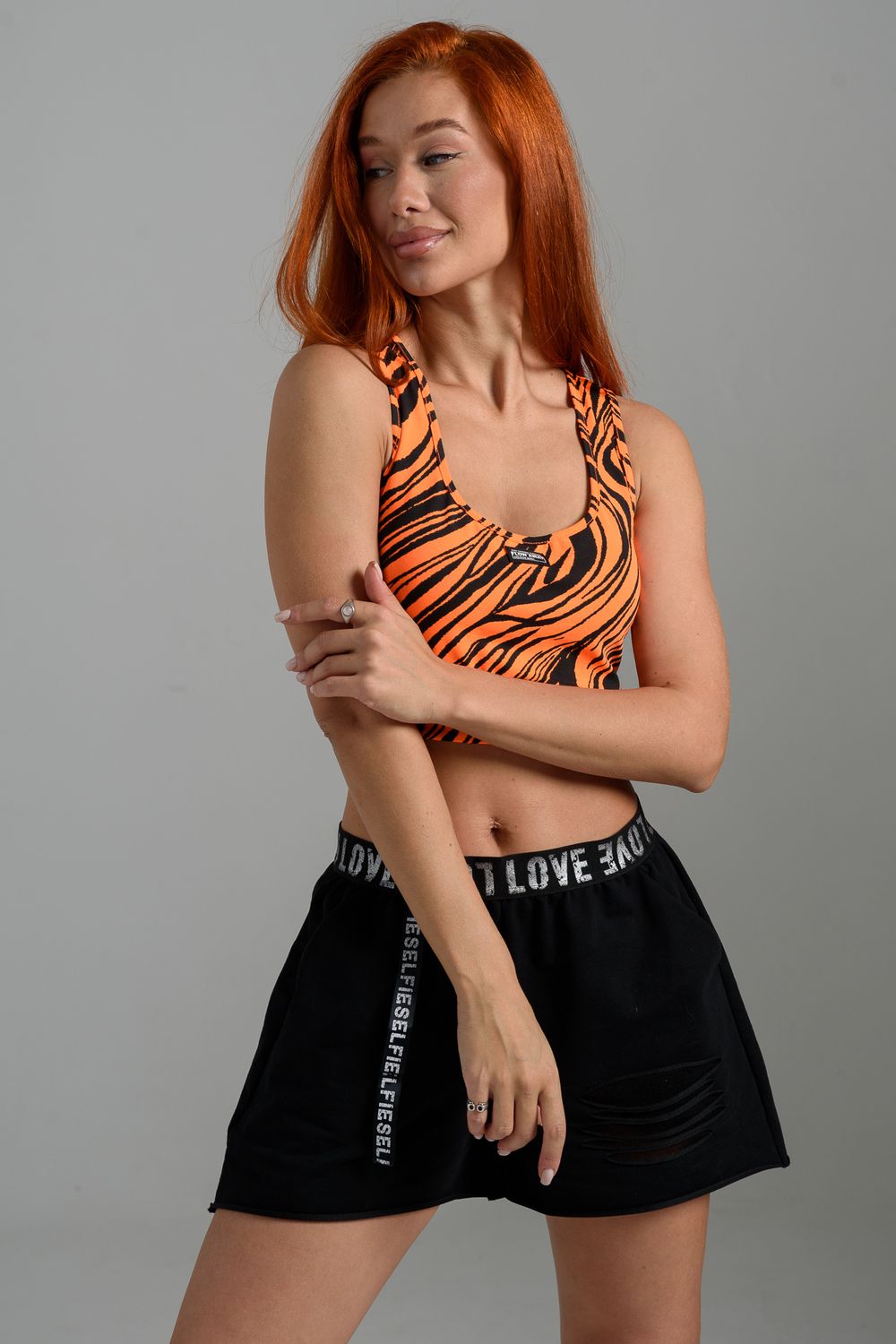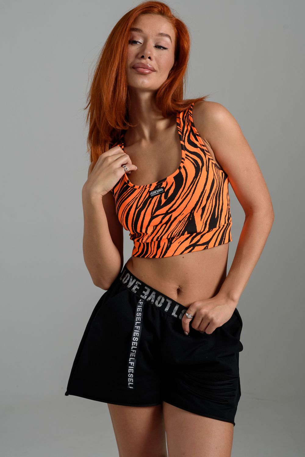 Топ на узких бретелях, с округлой горловиной на полочке и вырезом "борцовка" сзади. Горловина, проймы и вырез на спинке обработаны бейкой из основного полотна.