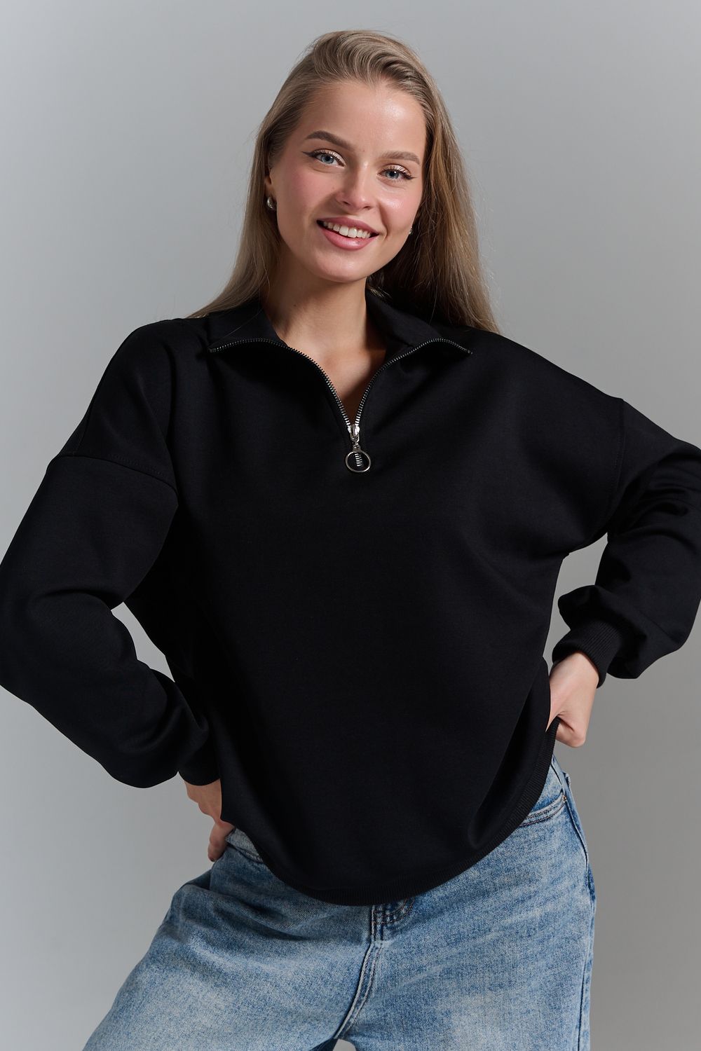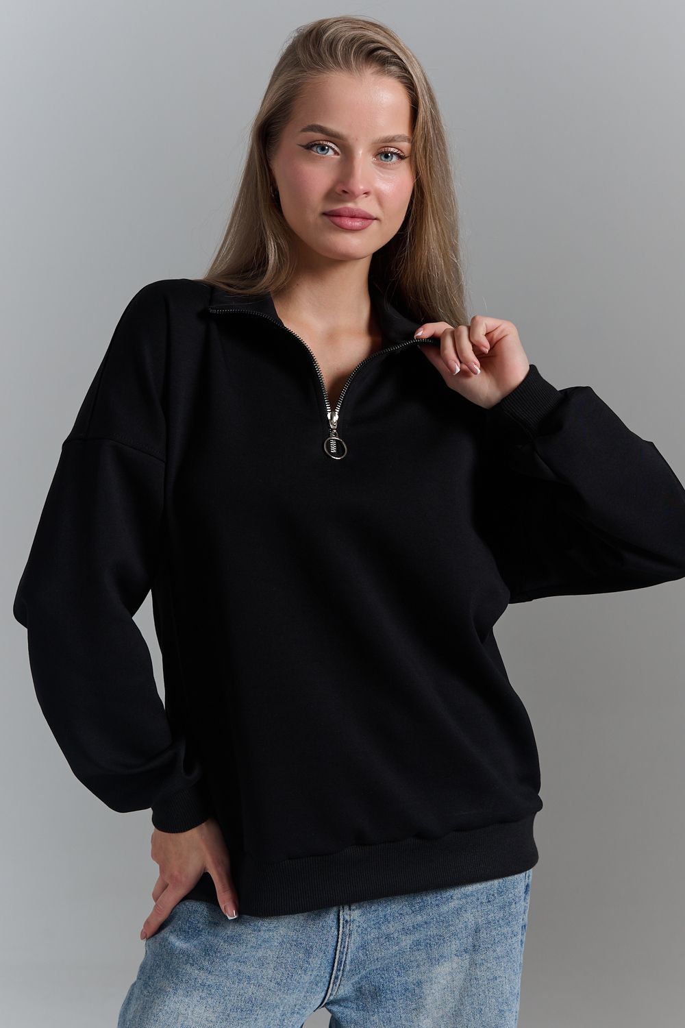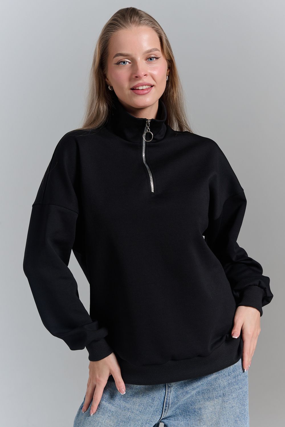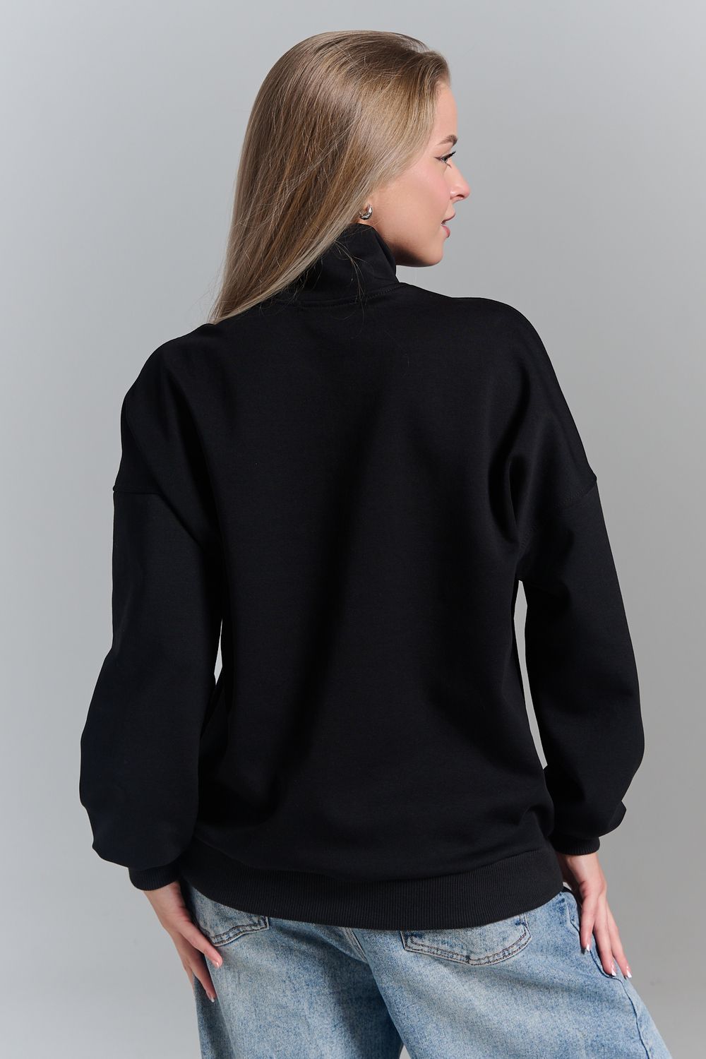 Однотонный свитшот это стильная и универсальная вещь. Он актуален даже без принта, рисунка, надписи и других дополнительных деталей. Слегка удлиненный пуловер подойдет для среднего, невысокого и высокого роста. Толстовку с высоким воротом. Такая одежда подойдет на каждый день, отлично впишется в универсальный базовый повседневный гардероб. Длина рукава измеряется от горловины.