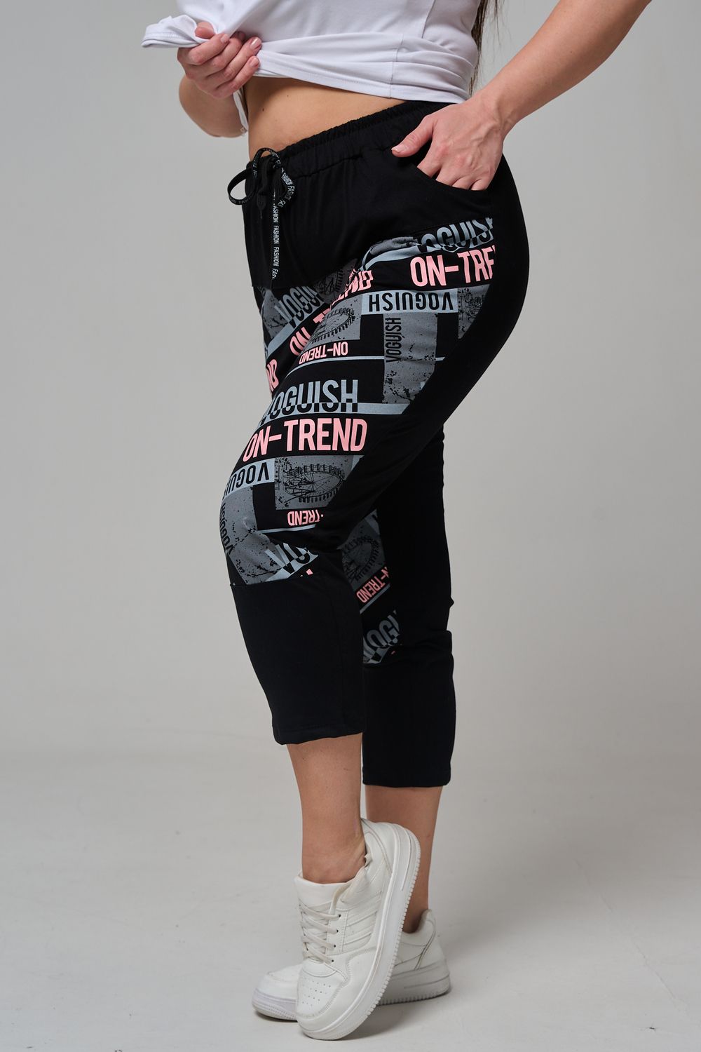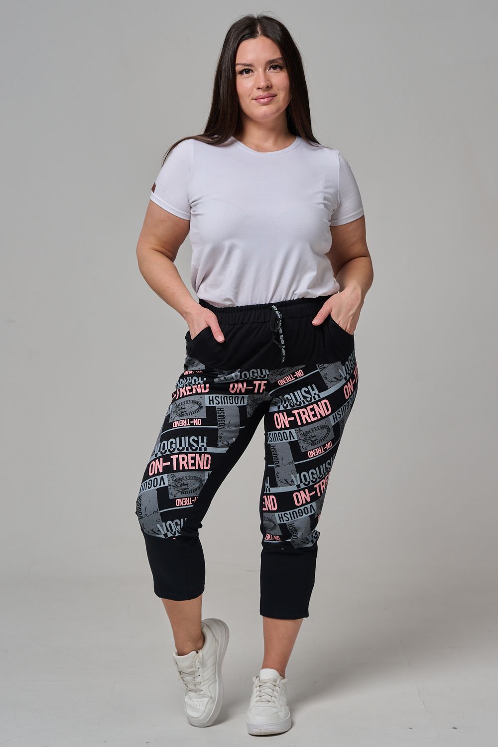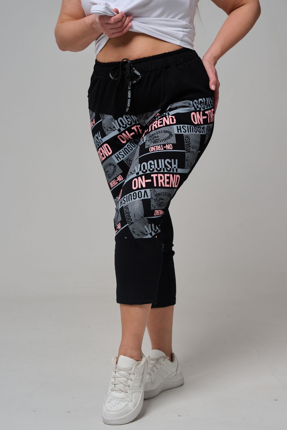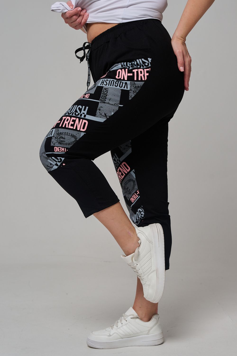 Брюки женские, свободные по бедрам, зауженные к низу. Спереди внутренние карманы, пояс эластичный со шнуром. На передних половинках брюк принт. Идеальны для повседневной носки.