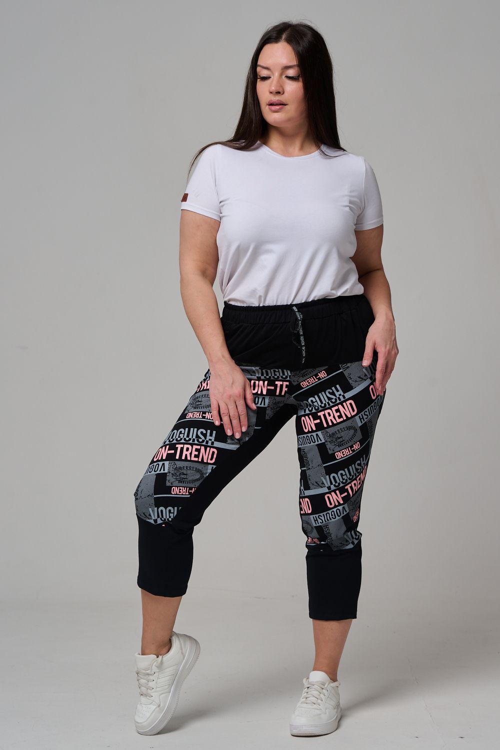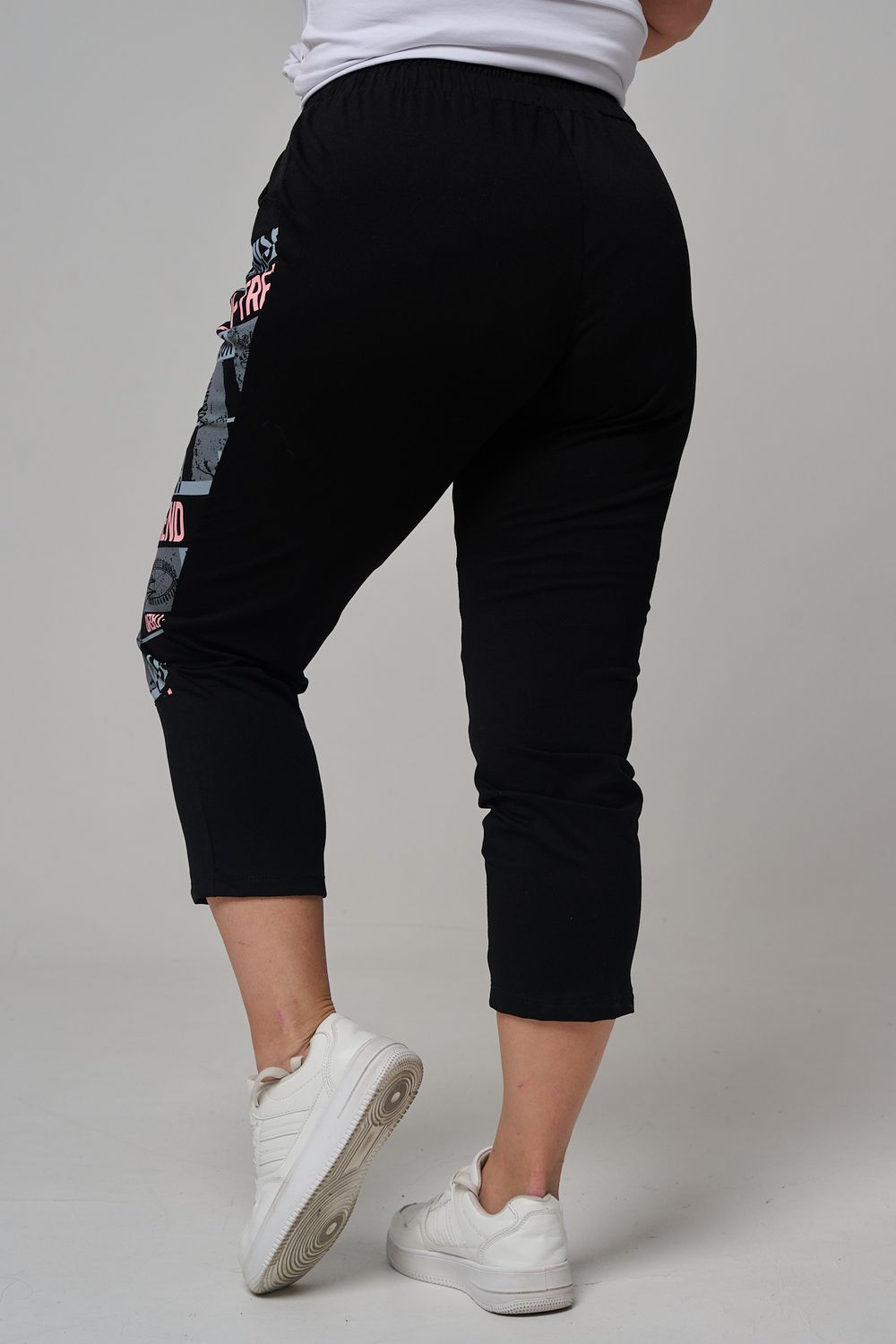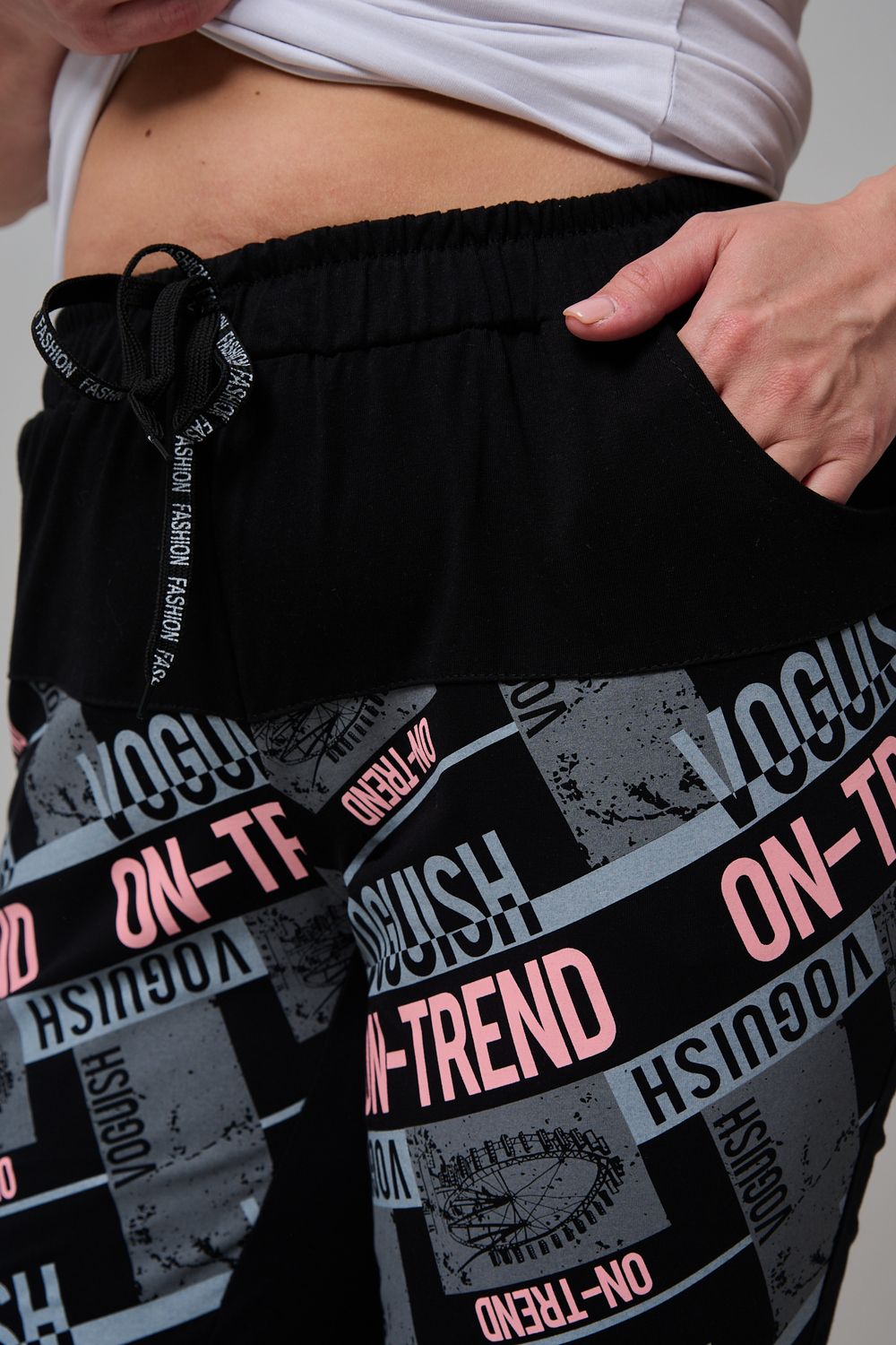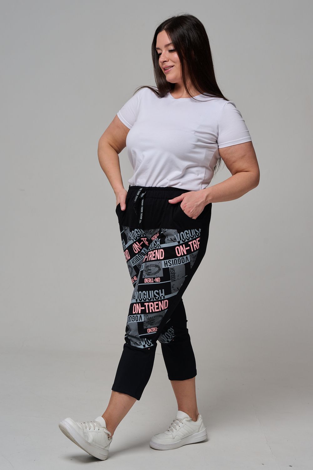 Брюки женские, свободные по бедрам, зауженные к низу. Спереди внутренние карманы, пояс эластичный со шнуром. На передних половинках брюк принт. Идеальны для повседневной носки.