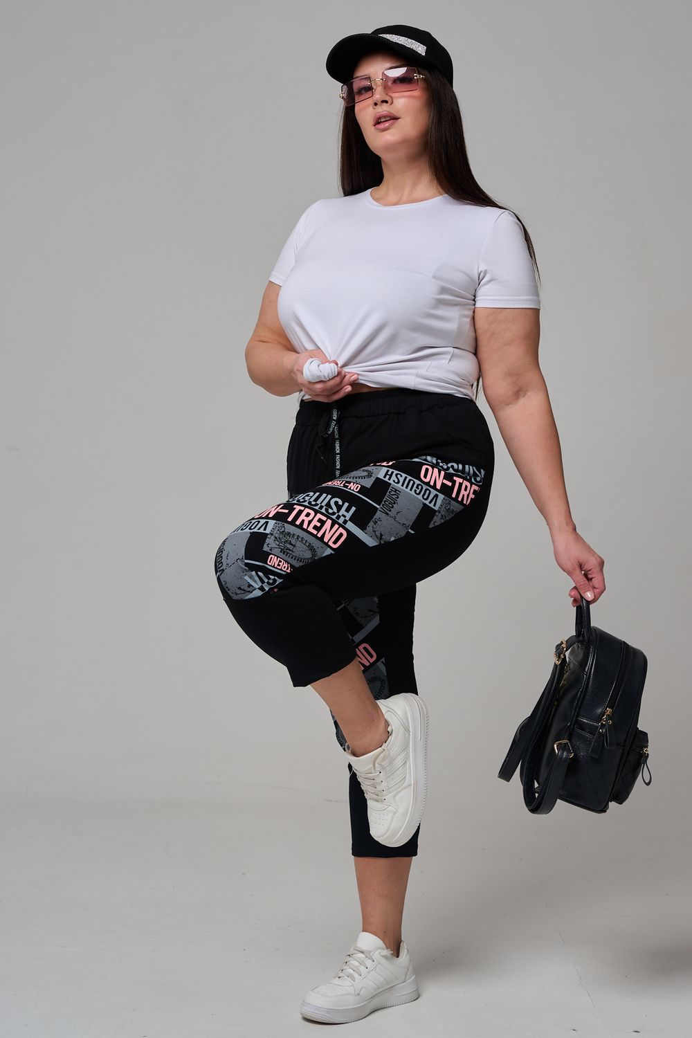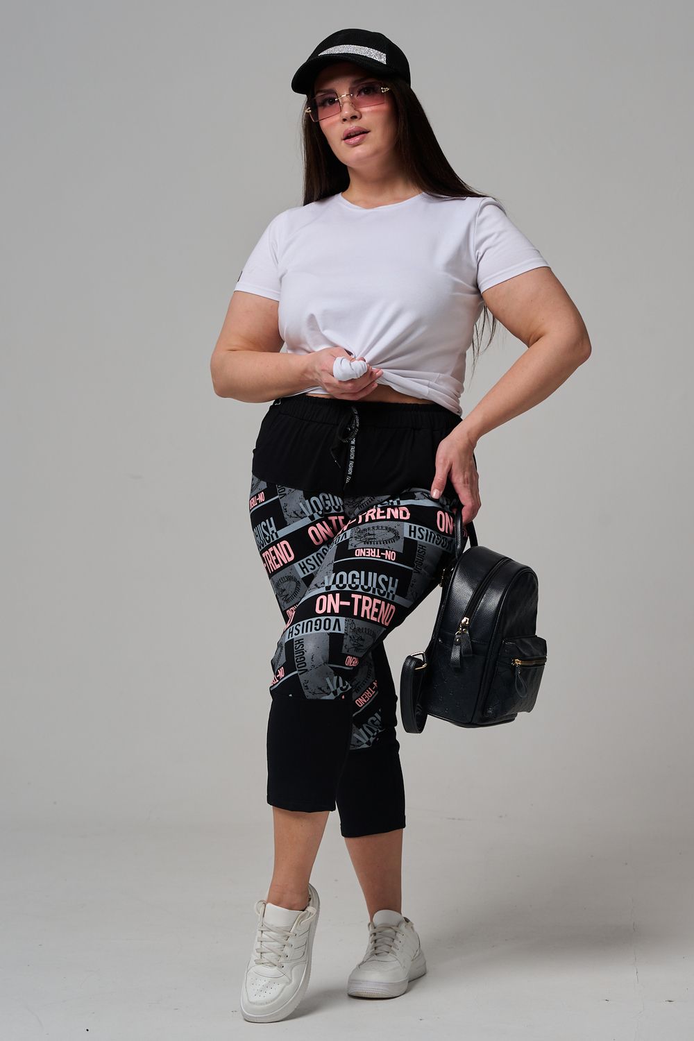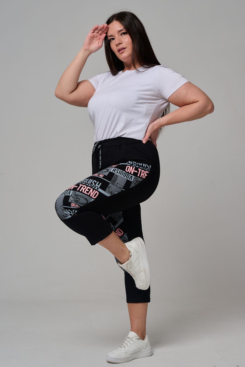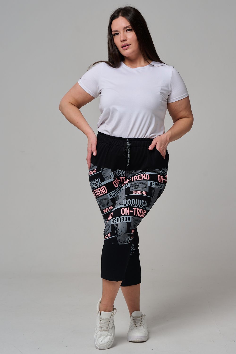 Брюки женские, свободные по бедрам, зауженные к низу. Спереди внутренние карманы, пояс эластичный со шнуром. На передних половинках брюк принт. Идеальны для повседневной носки.