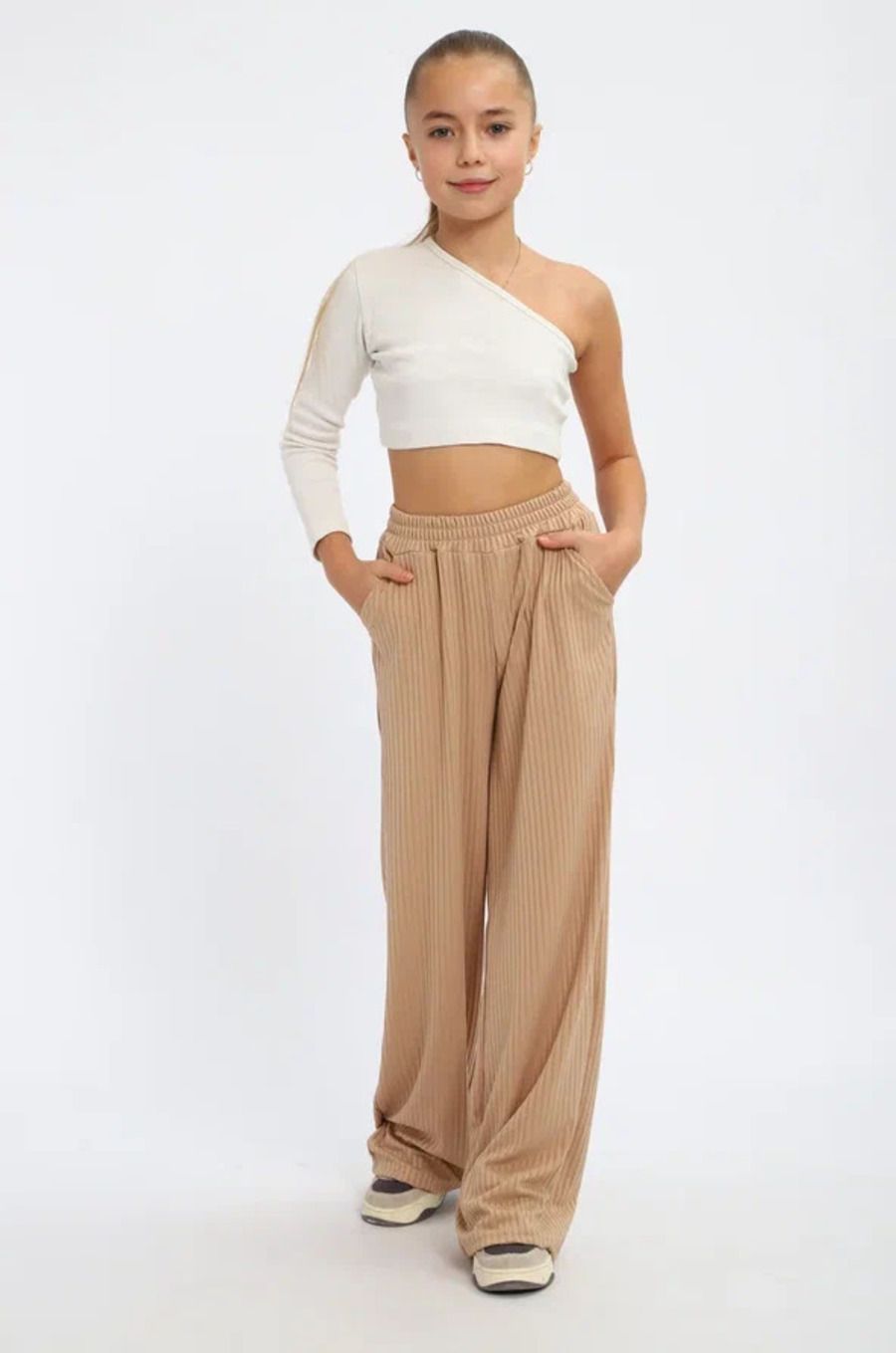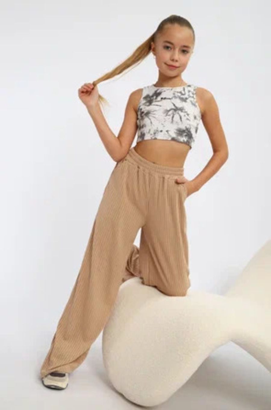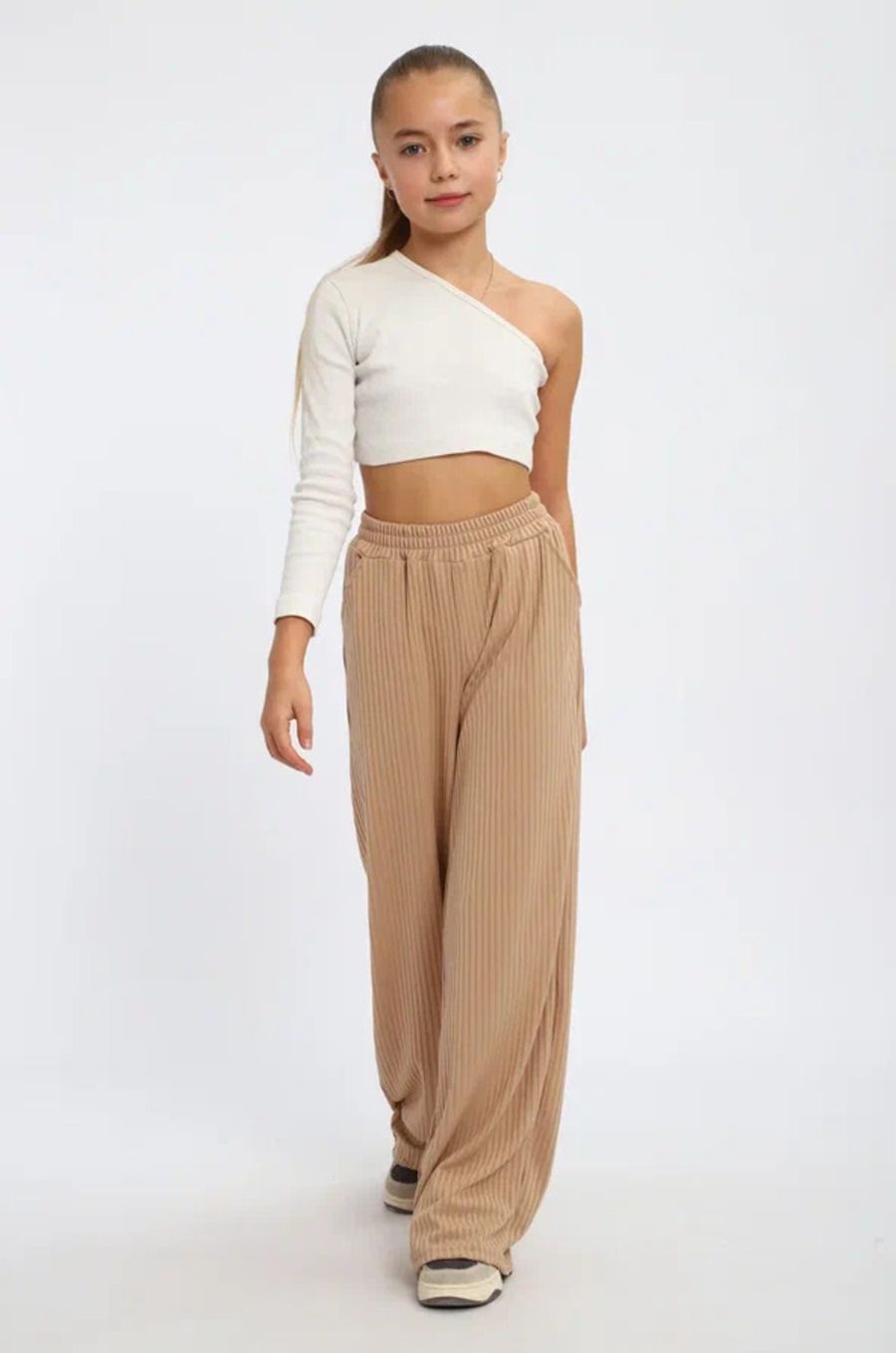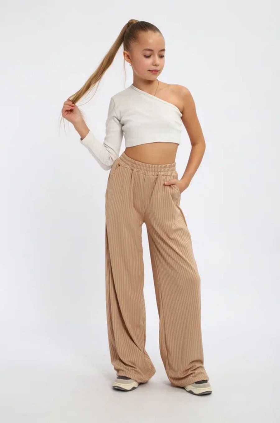 Легкие трикотажные штаны будут активно использоваться в летний, весенний и осенний период. Под такой низ не составит труда подобрать подходящую блузку, рубашку, футболку или кофту. Уместна как классика, так и как популярная трендовая одежда, вещи в спортивном стиле. Расклешенные внизу брюки с удобной посадкой сшиты из мягкого трикотажа. В составе материала вискоза и полиэстер. Штаны оснащены боковыми вместительными карманами, резинкой на поясе, станут отличным решением для отдыха дома и дачи, танцев, фотосессии, туристического похода, повседневной носки, школу и на улицу. Модель свободного кроя всегда будет в моде идеальна на каждый день весной и осенью. При желании брючки для девочки можно укоротить и носить как кюлоты.