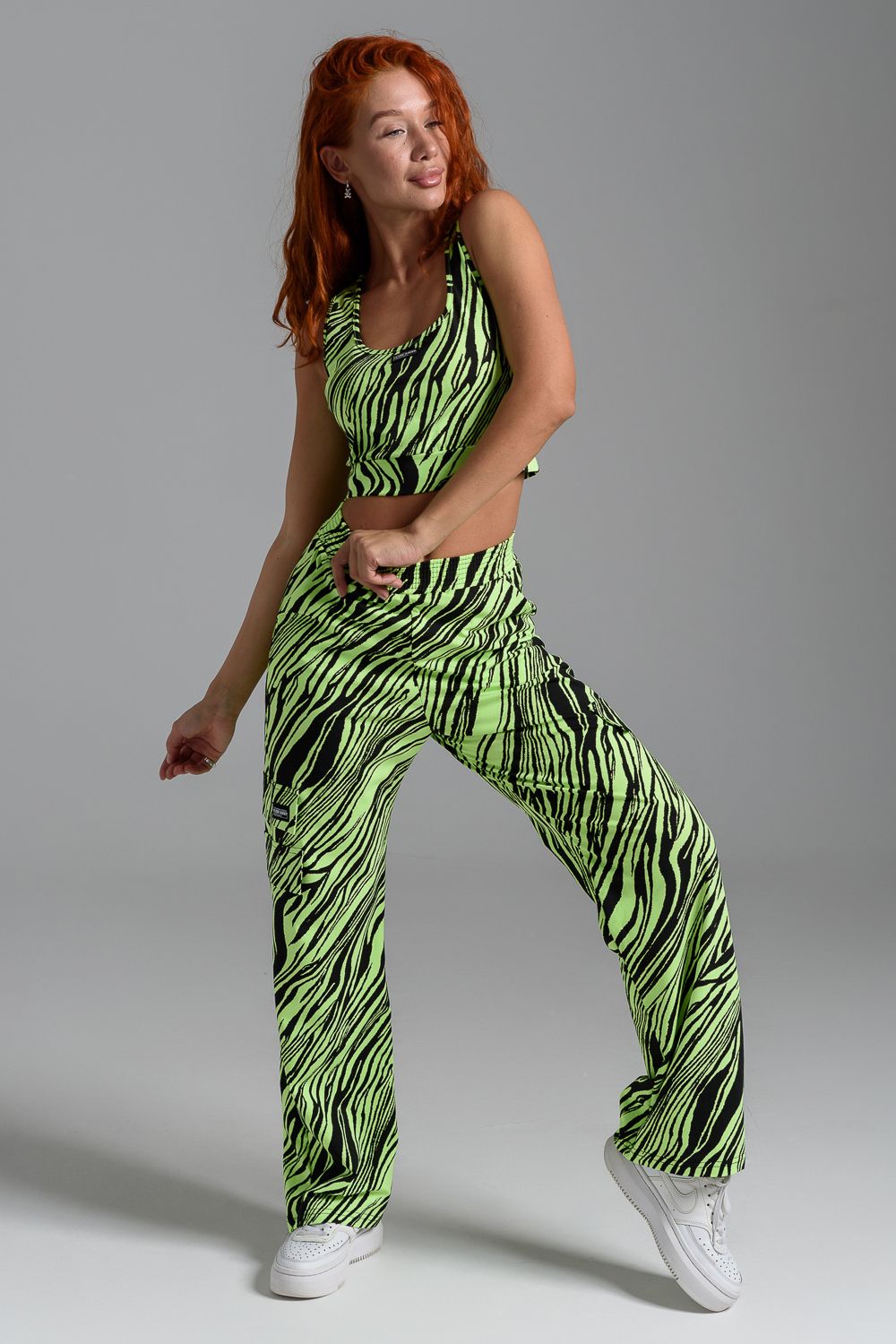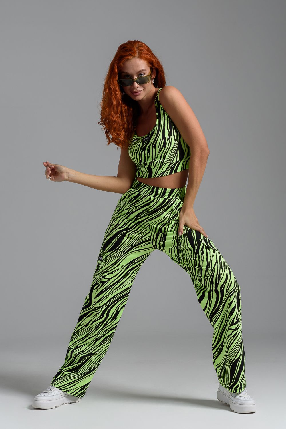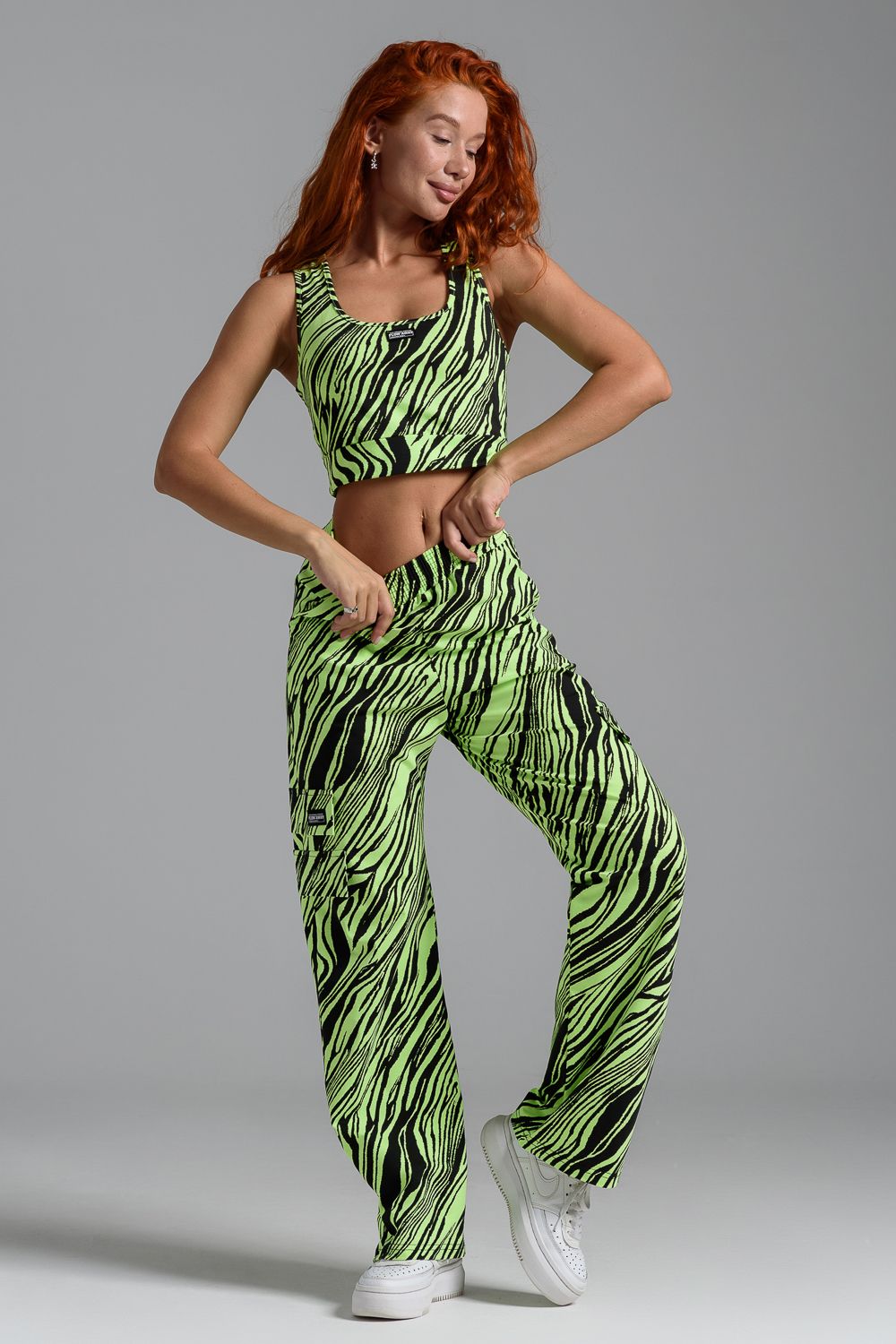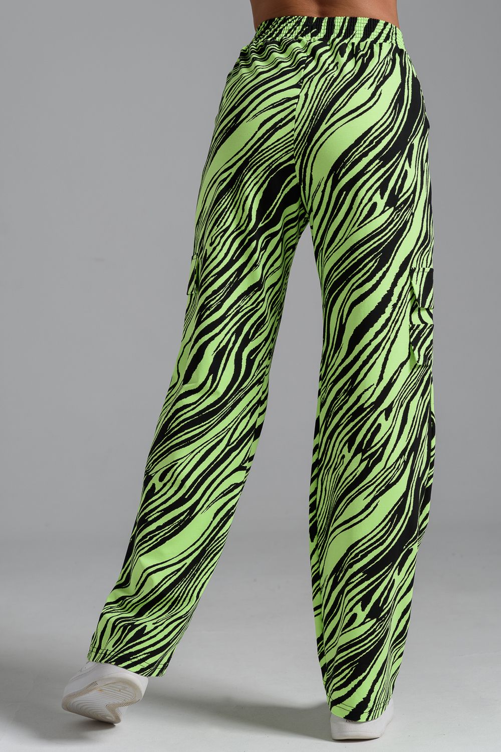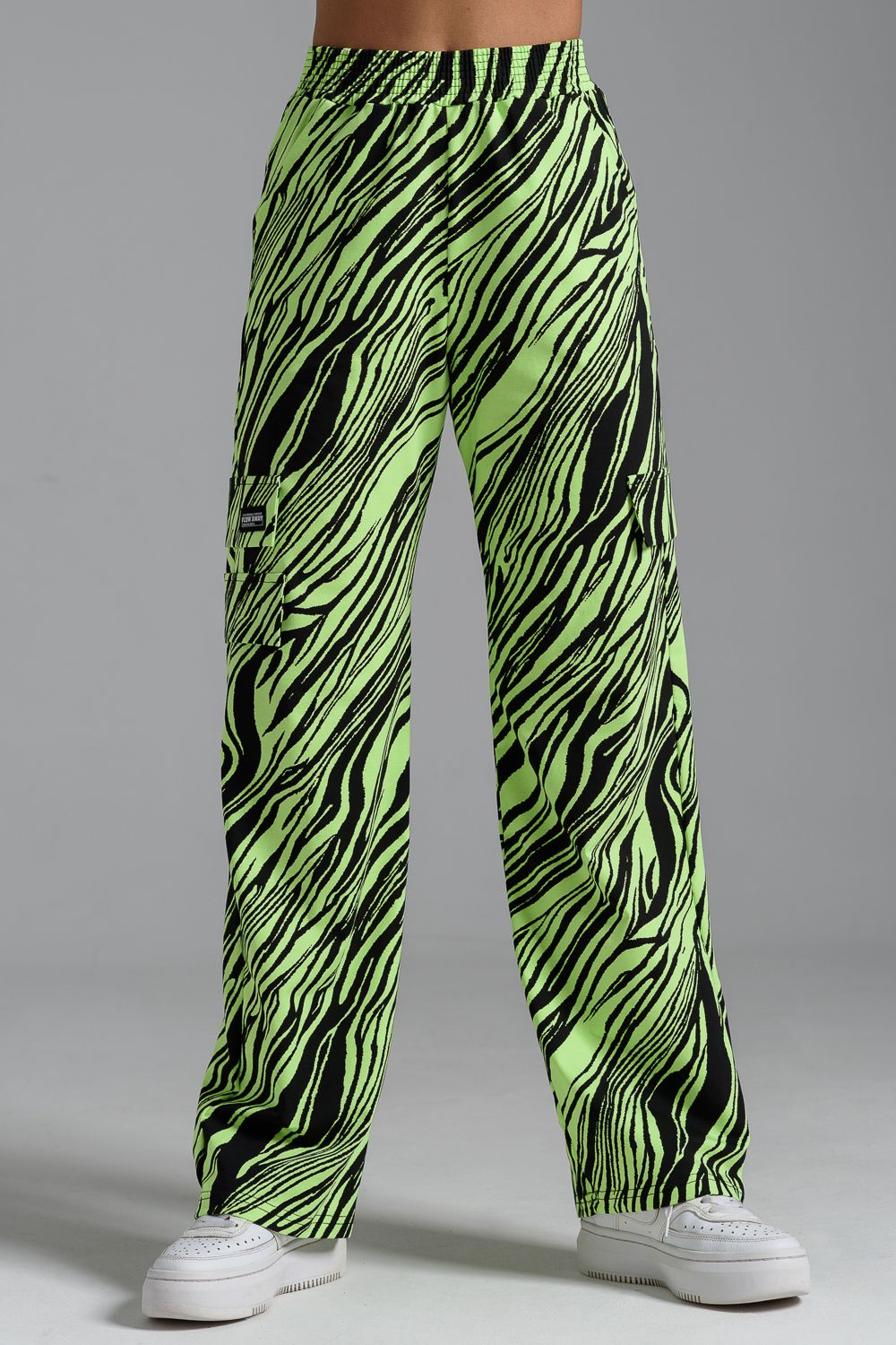Брюки прямые, на поясе, с боковыми карманами. Декоративные клапаны расположены по бокам брюк.