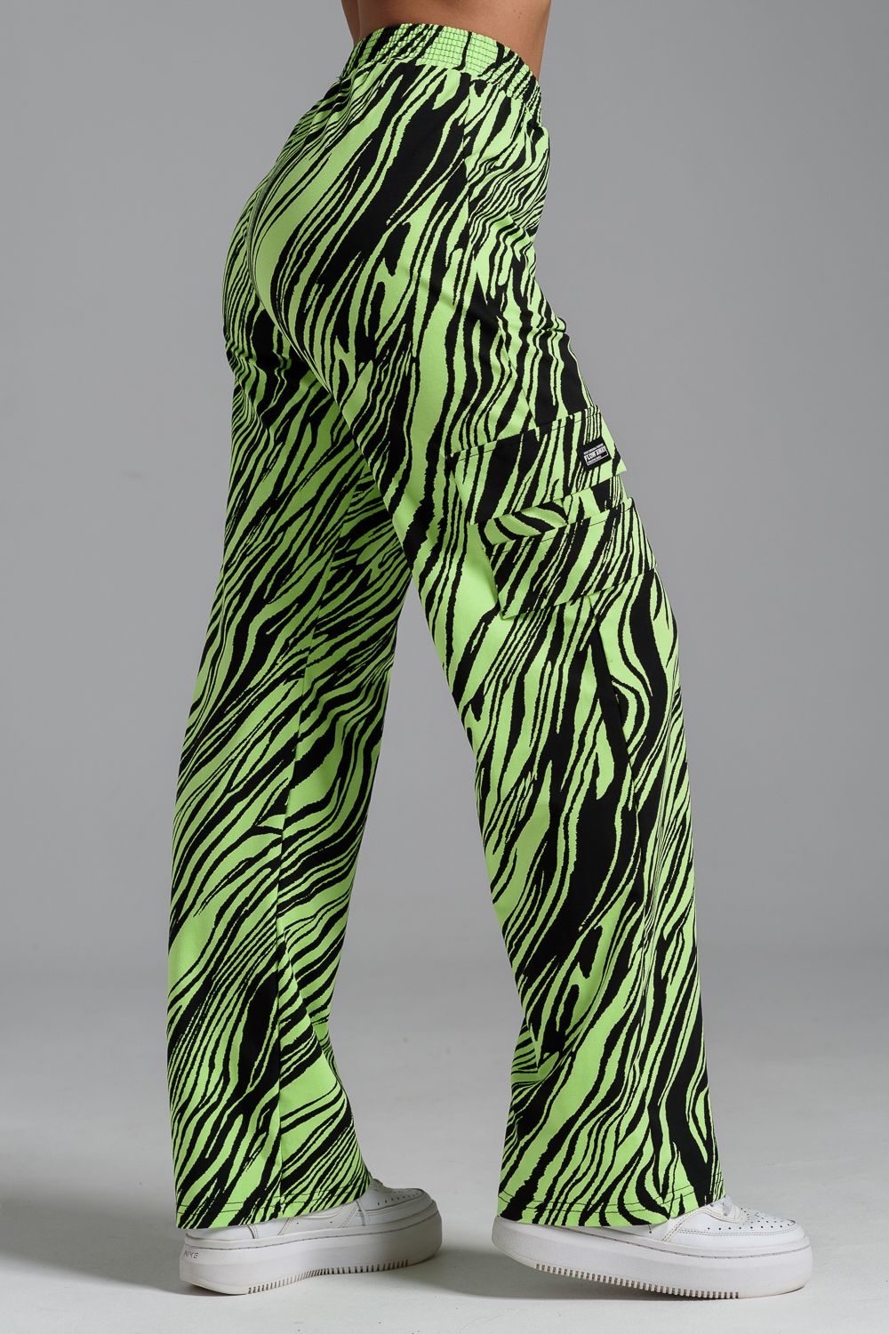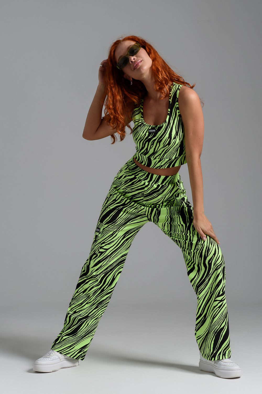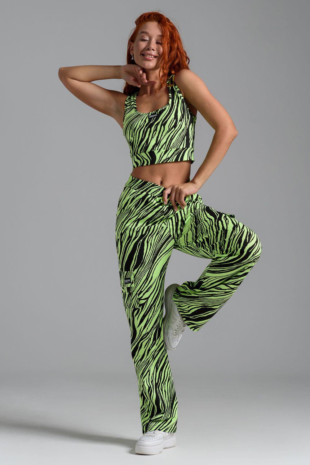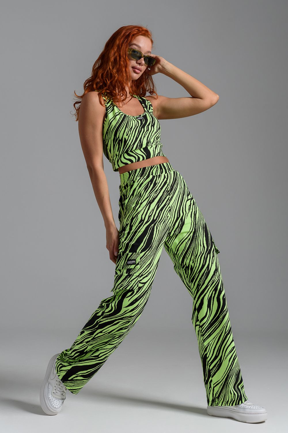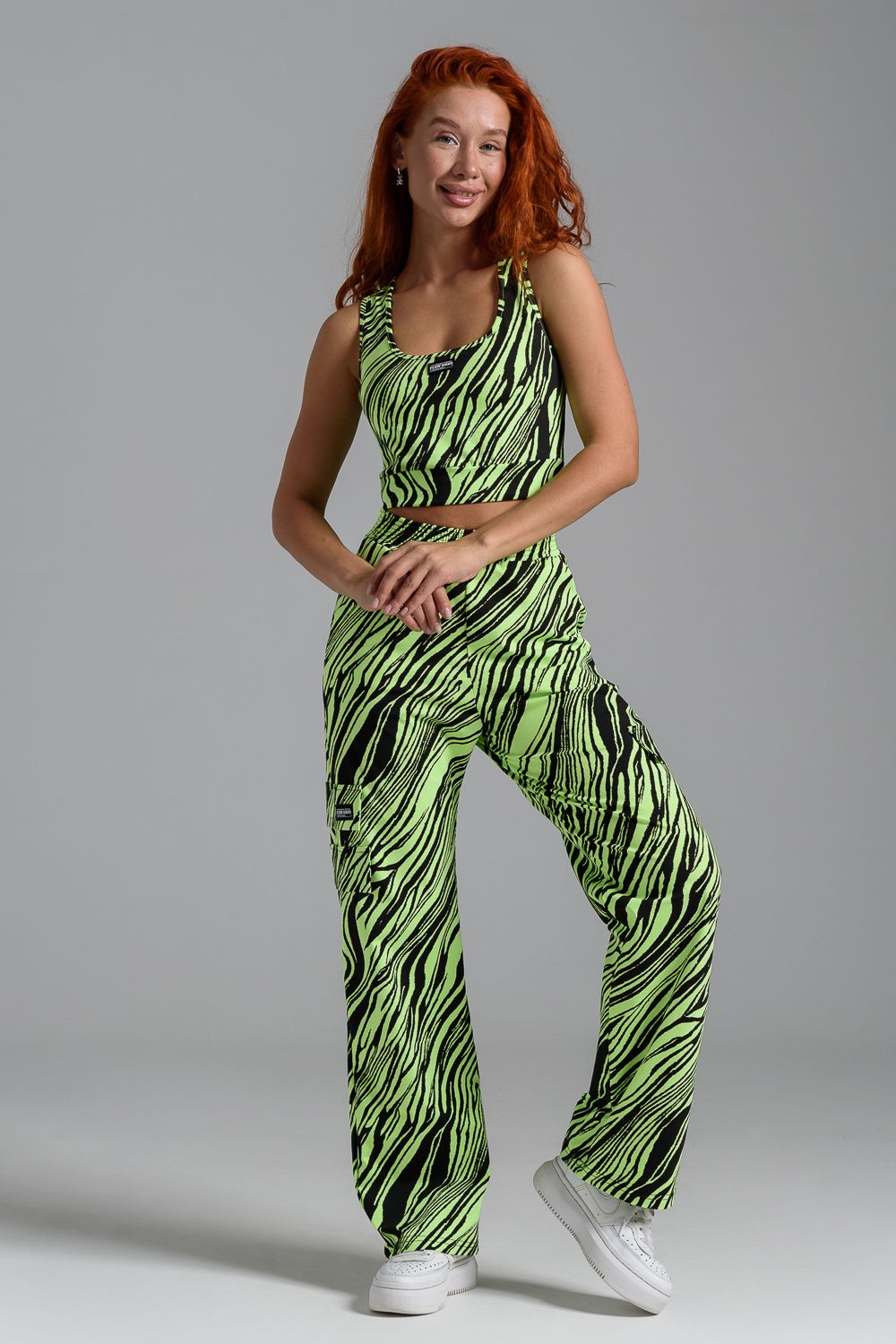 Брюки прямые, на поясе, с боковыми карманами. Декоративные клапаны расположены по бокам брюк.
