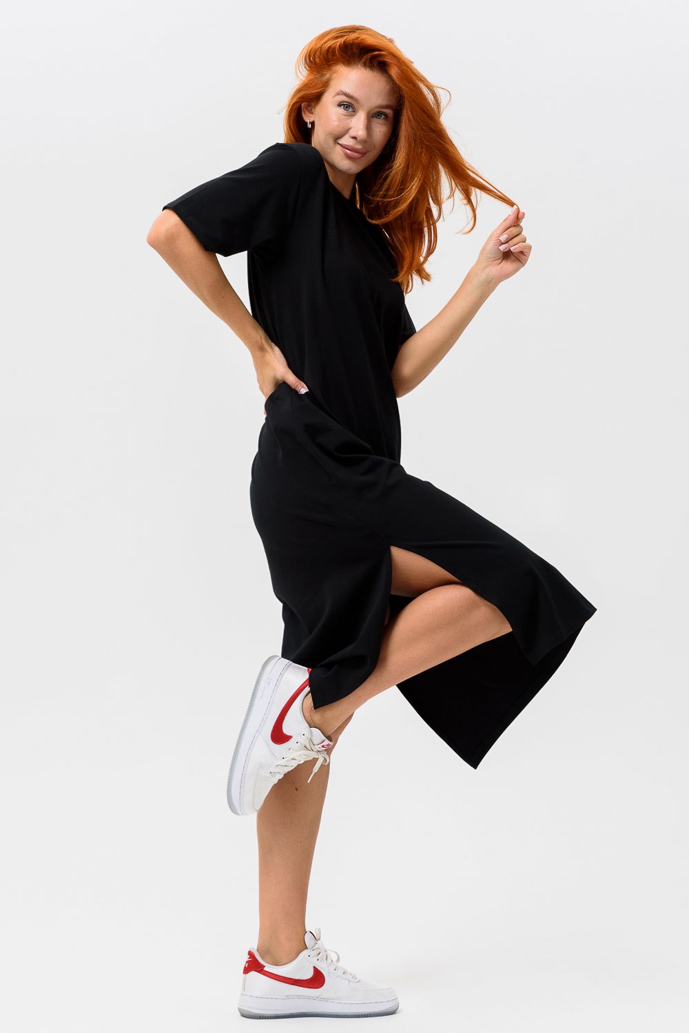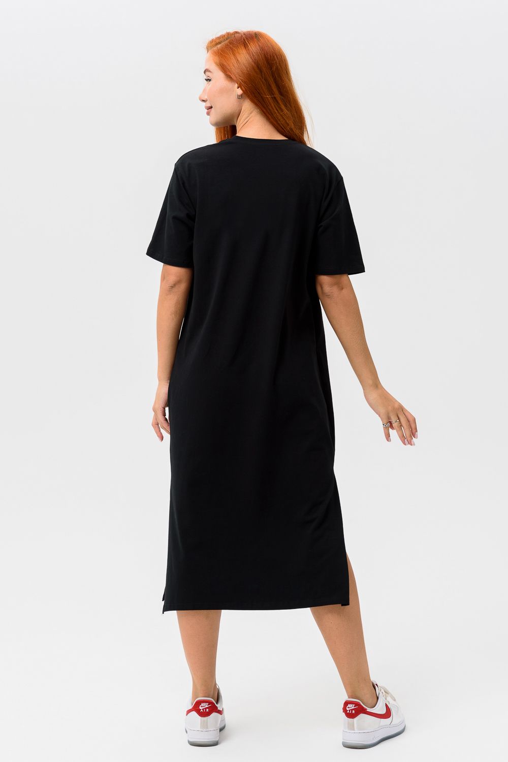 Платье полуприлегающего силуэта, с округлой горловиной, длинное. Рукав короткий. Горловина обработана бейкой из основного полотна.