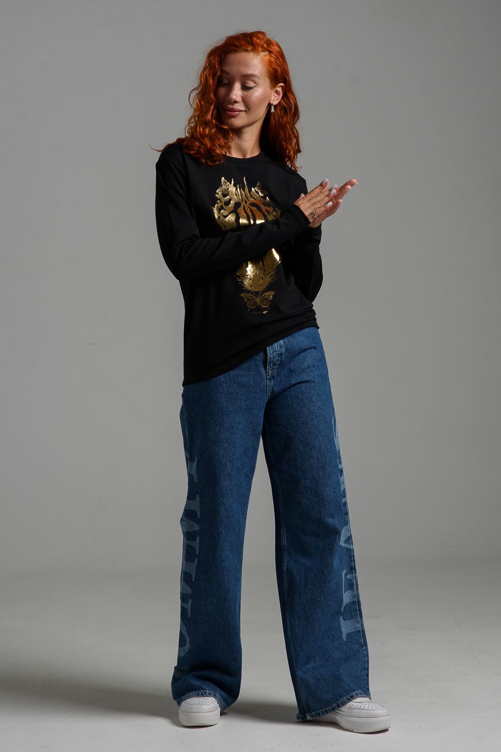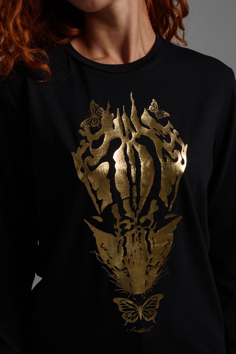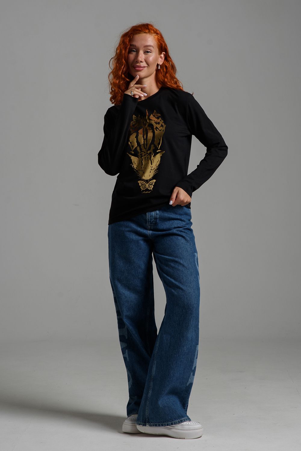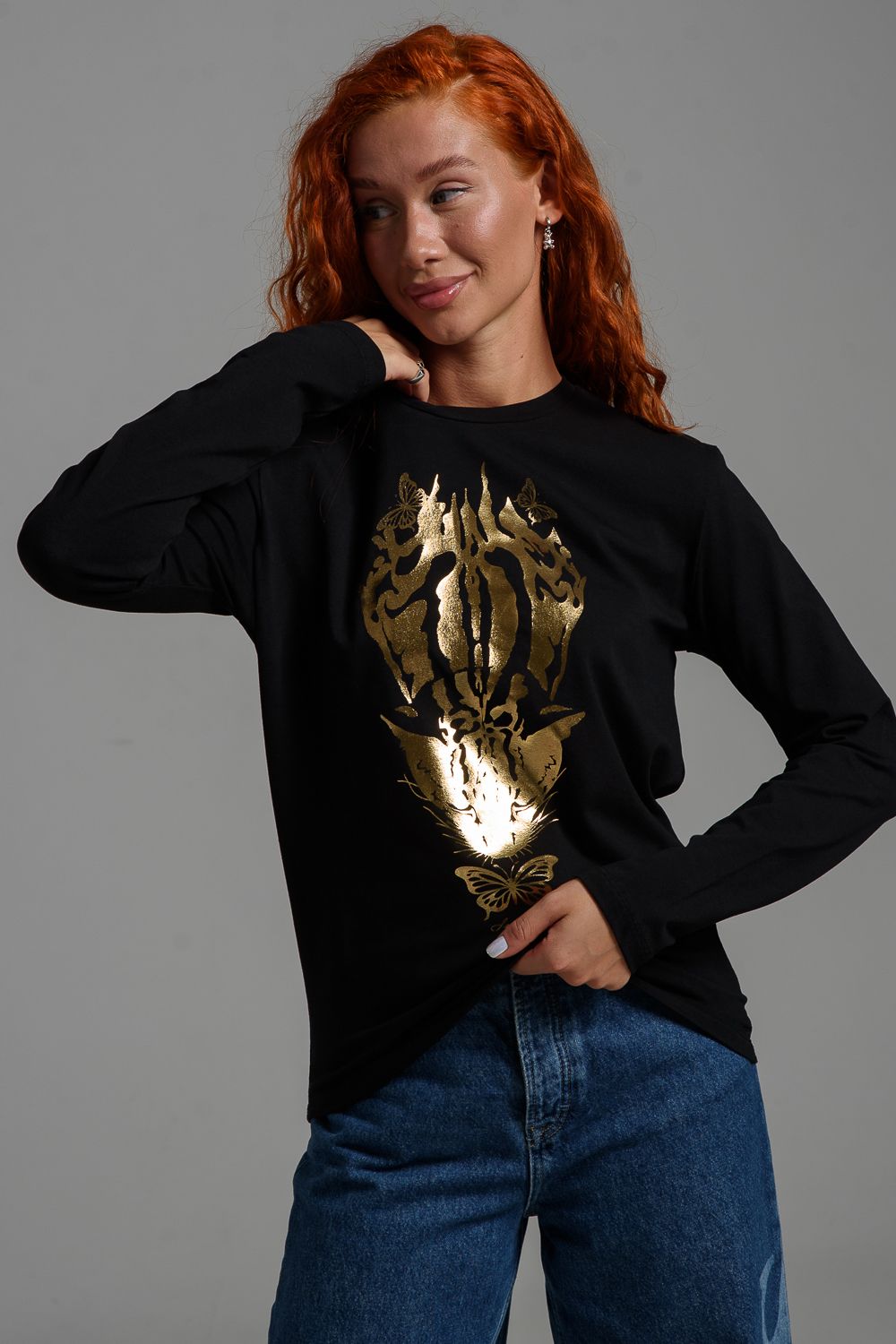 8544 Футболка с длинным рукавом женская (фольга) - черный+инстинкт