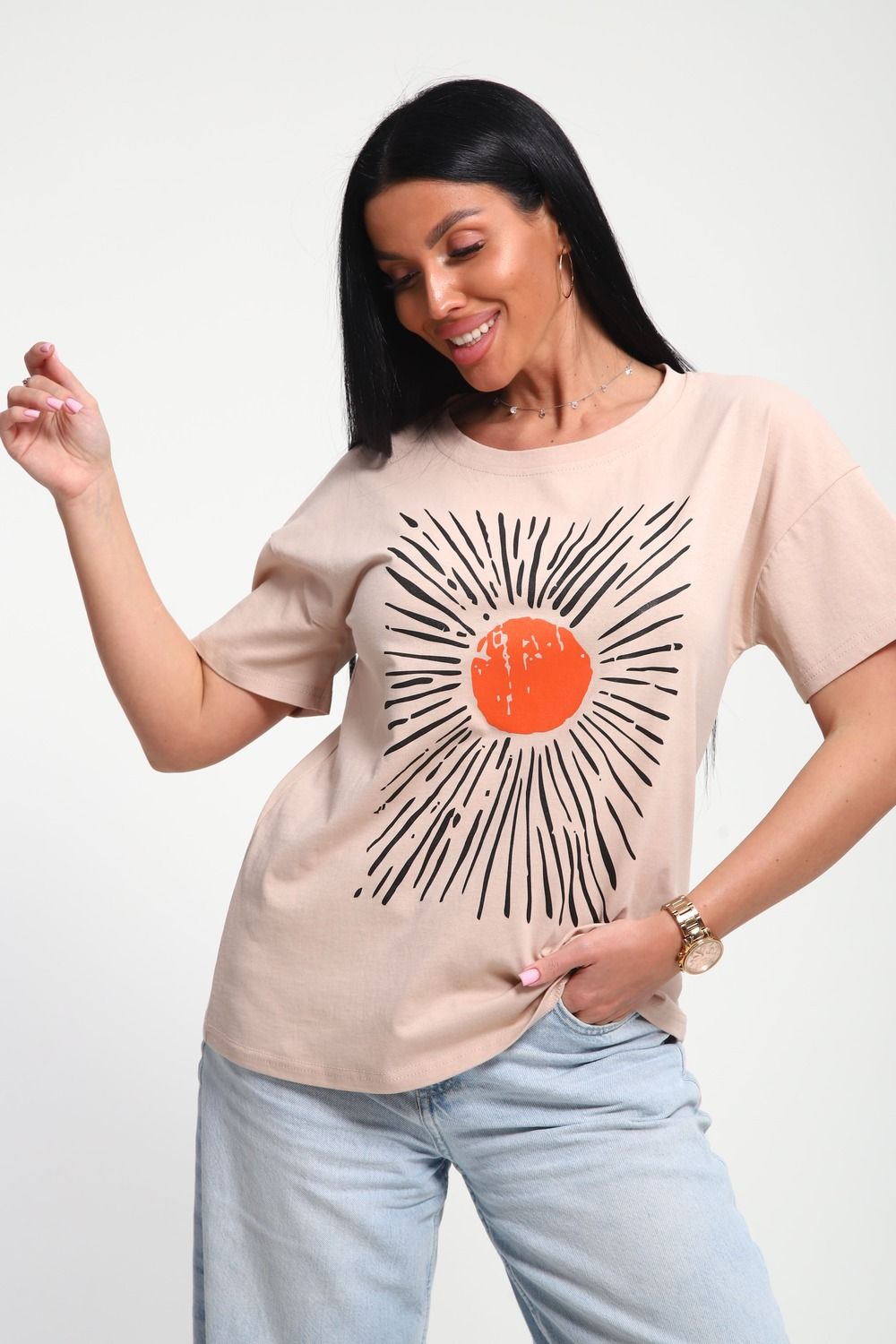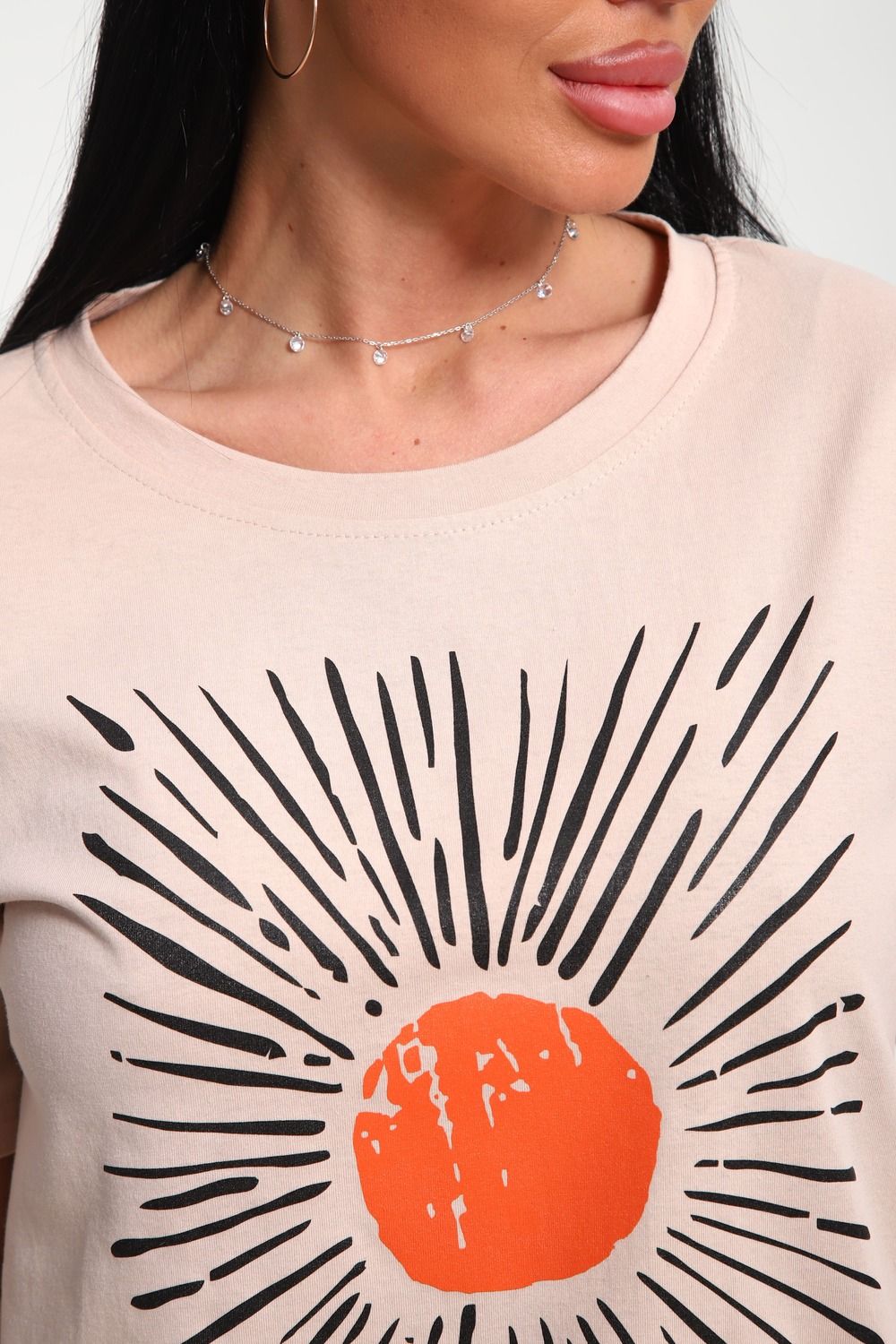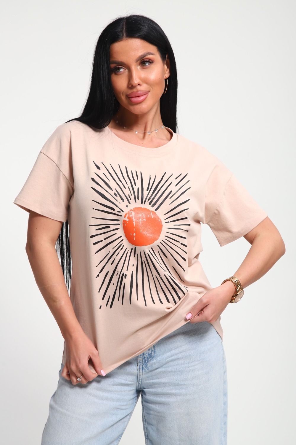 Футболка женская из гладкокрашенного трикотажа, хлопок 100%. Прямого силуэта, свободного облегания. горловина круглой формы. Рукав короткий. Низ изделия прямой. На полочке принт, шелкография.